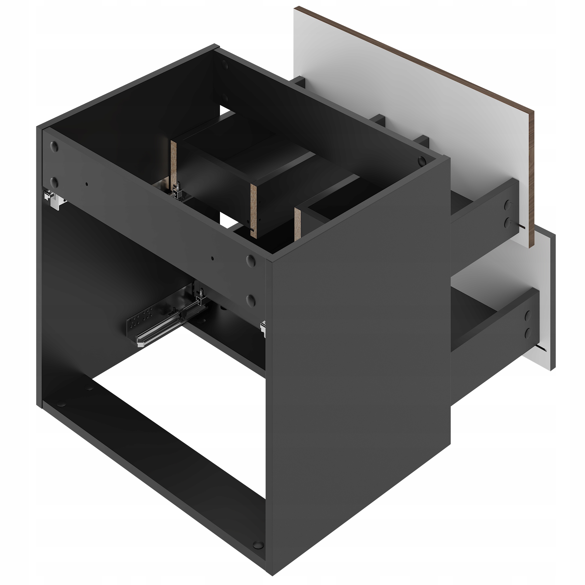 Szafka ma wysokość 50 cm, głębokość 45,8 cm i szerokość 60 cm, natomiast blat mierzy 60,6 cm szerokości, 46,5 cm głębokości i 2,2 cm wysokości. Korpus wykonano z płyty laminowanej 16 mm w kolorze czarny mat, fronty z płyty MDF 18 mm wykończonej folią meblową w dekorze czarny mat i orzech, a blat z płyty MDF pokrytej folią PVC. To polska produkcja oparta na certyfikowanych materiałach FSC, dostarczana w paczkach do samodzielnego montażu wraz z kompletną instrukcją i zestawem montażowym.