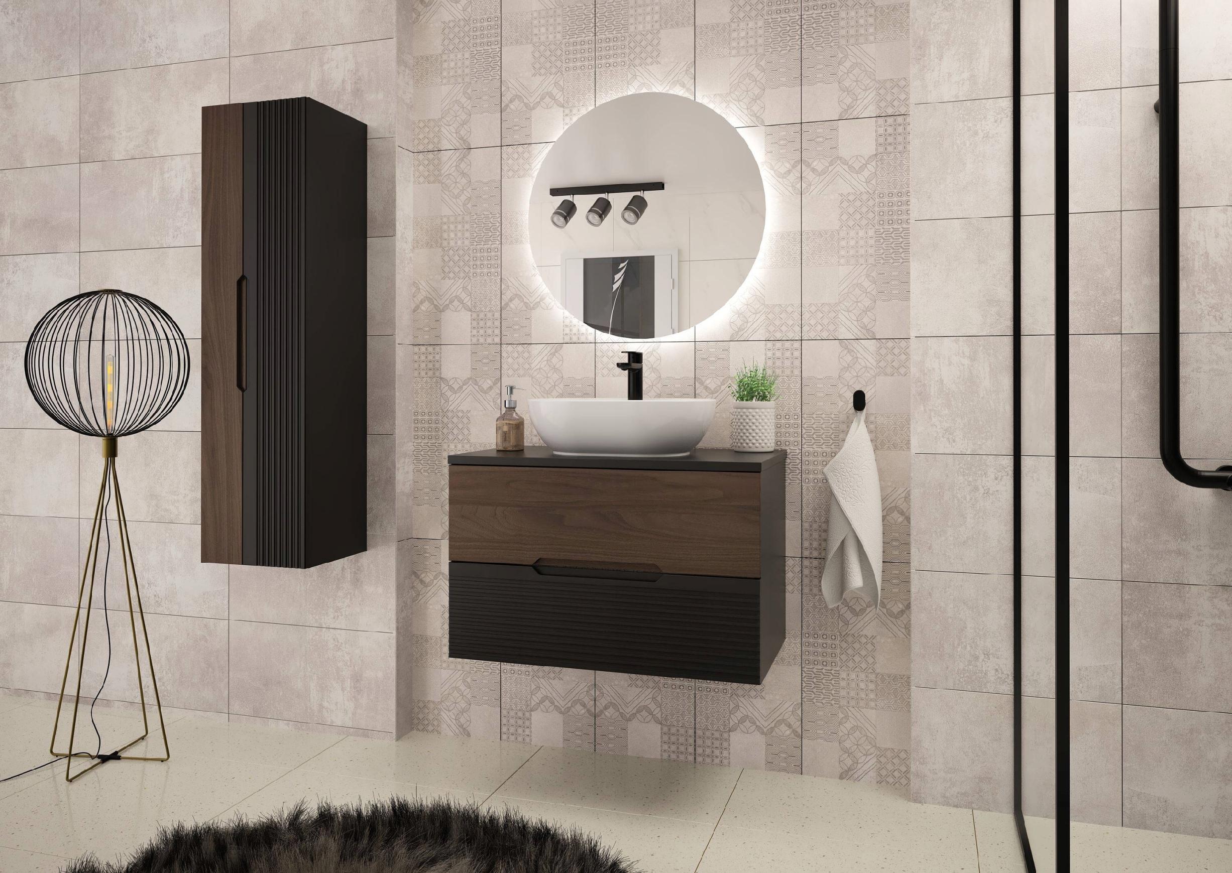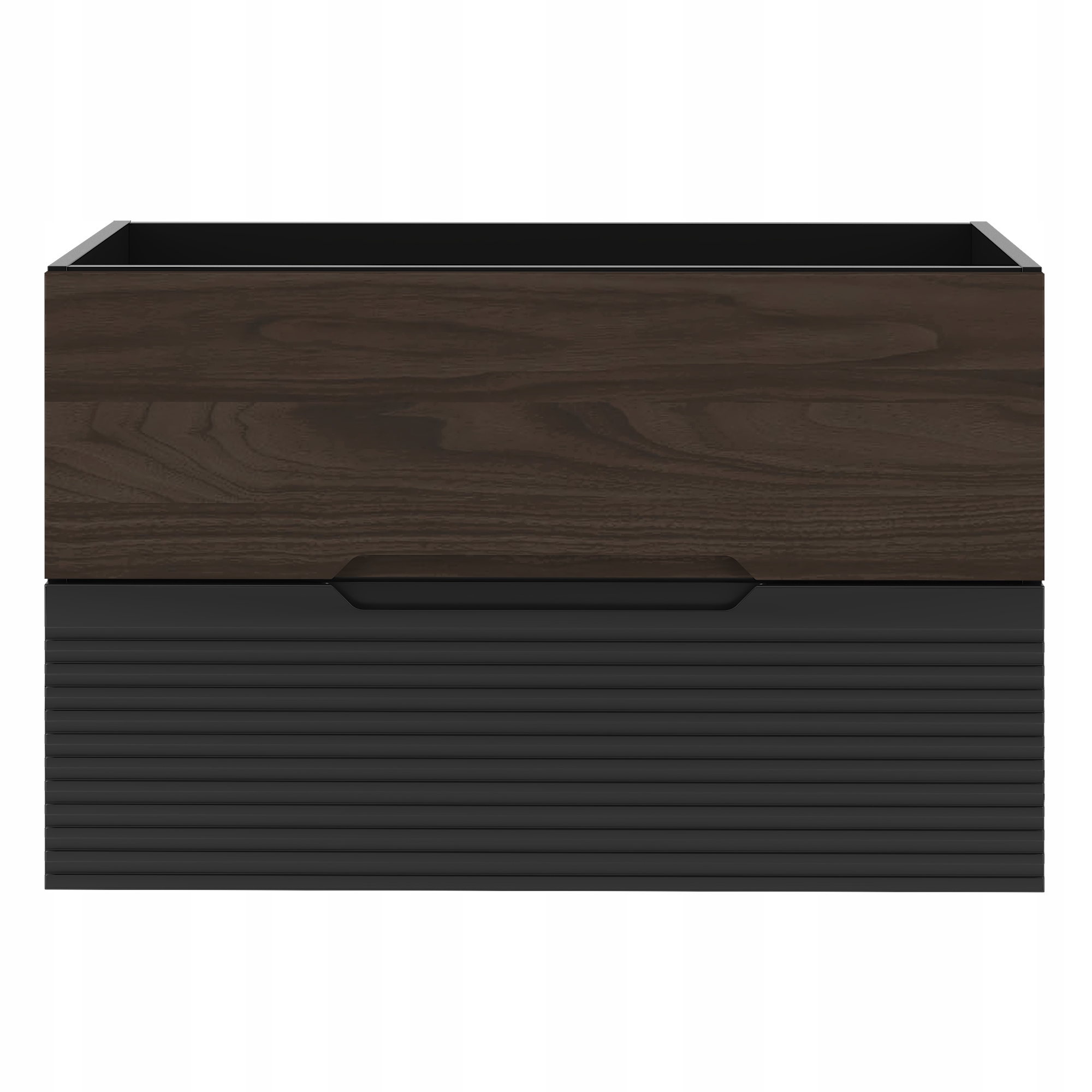 Szafka łazienkowa z kolekcji Avella o szerokości 80 cm to nowoczesne i eleganckie połączenie czarnego matu z dekorem orzech. Wyjątkowe frezowane fronty MDF nadają bryle unikalnego charakteru, a asymetryczne zestawienie kolorów podkreśla nowoczesny styl i sprawia, że mebel wyróżnia się w aranżacji wnętrza. Wisząca konstrukcja dodaje lekkości oraz ułatwia utrzymanie czystości w łazience.
