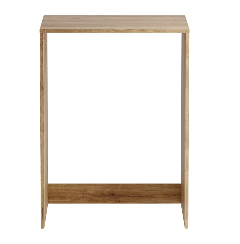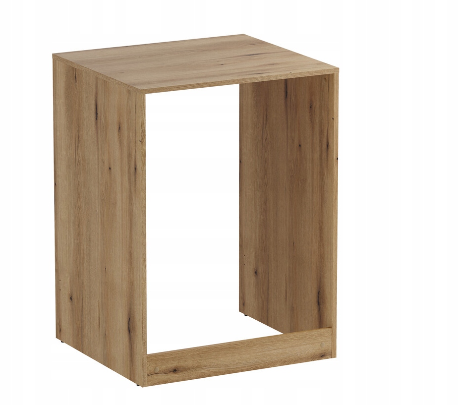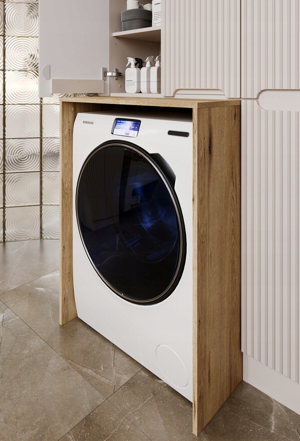 Model o szerokości 70 cm, wysokości 95,5 cm i głębokości 65 cm pozwala zabudować standardową pralkę, zapewniając praktyczną strefę użytkową. Konstrukcja wykonana z płyty laminowanej jest trwała, odporna na codzienne użytkowanie i łatwa w utrzymaniu czystości. Otwarta wnęka nad urządzeniem daje dodatkowe miejsce na detergenty lub akcesoria, co zwiększa funkcjonalność mebla.