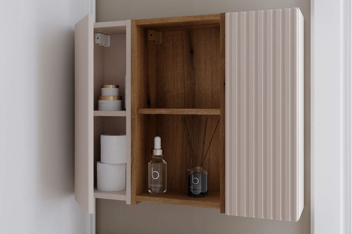 Model o szerokości 30 cm, wysokości 57 cm i głębokości 17,3 cm oferuje dwie otwarte wnęki z jedną półką stałą i jedną regulowaną, co pozwala wygodnie przechowywać ręczniki, kosmetyki lub dekoracje. Lekka, wisząca konstrukcja sprawia, że element dobrze prezentuje się zarówno samodzielnie, jak i jako uzupełnienie szafek górnych, nie obciążając optycznie przestrzeni.