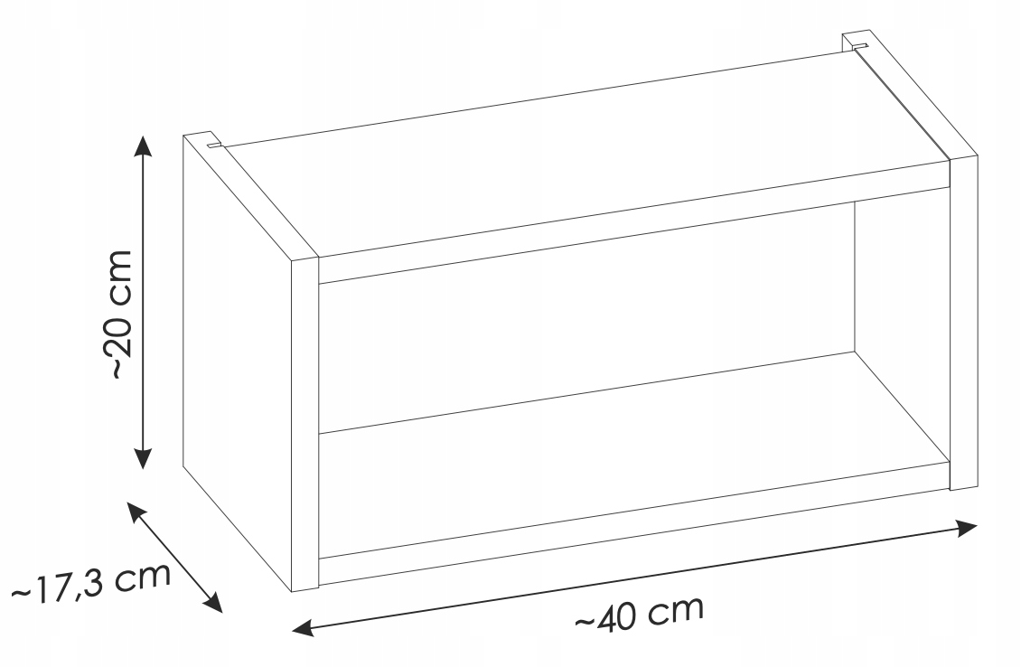 Model o szerokości 40 cm, wysokości 20 cm i głębokości 17,3 cm oferuje jedną otwartą wnękę z praktyczną, stałą półką, idealną do przechowywania kosmetyków, akcesoriów lub dekoracyjnych dodatków. Niewielkie wymiary sprawiają, że regał dobrze sprawdza się również w mniejszych przestrzeniach, a wisząca konstrukcja nadaje zabudowie lekkości i ułatwia utrzymanie porządku.