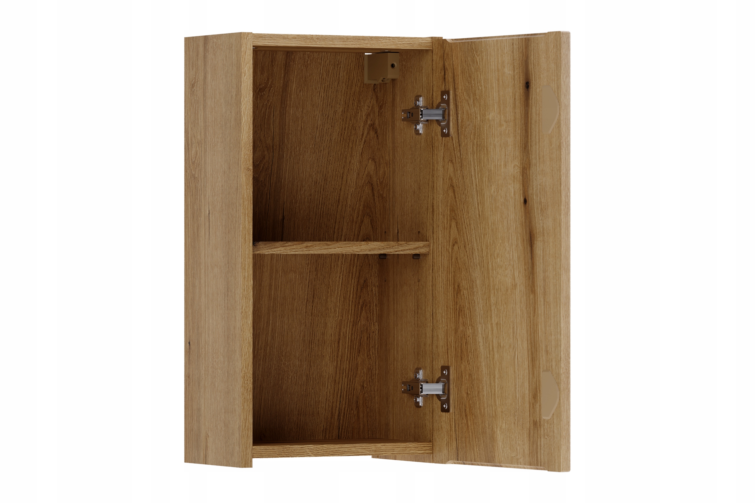 Szafka górna o szerokości 30 cm, wysokości 57 cm i głębokości 18,9 cm zapewnia dwie funkcjonalne wnęki ukryte za drzwiami, idealne do przechowywania kosmetyków i niezbędnych akcesoriów. Zintegrowany podchwyt nadaje meblowi nowoczesnego wyglądu, a system cichego domykania zapewnia wygodne, płynne użytkowanie. Kompaktowa forma sprawia, że model świetnie sprawdza się nawet w mniejszych łazienkach, nie obciążając wizualnie przestrzeni.