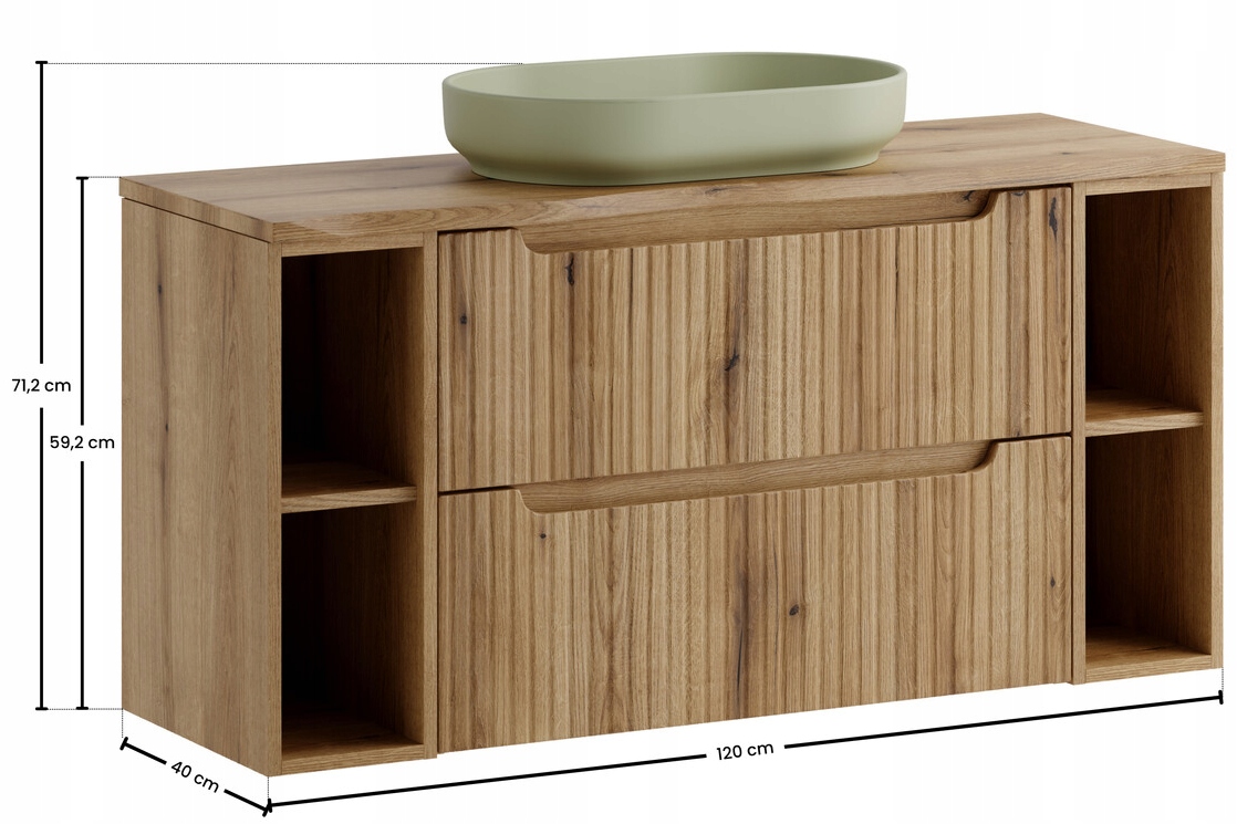 Centralną część stanowi szafka pod umywalkę o szerokości 80 cm, wysokości 57 cm i głębokości 39 cm, połączona po obu stronach z regałami o szerokości 20 cm, wysokości 57 cm i głębokości 38 cm. Całość przykrywa jeden blat o szerokości 120,4 cm, głębokości 40 cm i wysokości 2,5 cm, który tworzy jednolitą linię zabudowy i wygodną powierzchnię użytkową. Ceramiczna umywalka RIVER 2 w kolorze oliwkowej zieleni o szerokości około 121 cm i głębokości 40 cm została idealnie dopasowana do szerokości zestawu, tworząc efektowną i funkcjonalną strefę mycia. System cichego domykania zwiększa komfort codziennego użytkowania zarówno szuflad, jak i drzwi.
