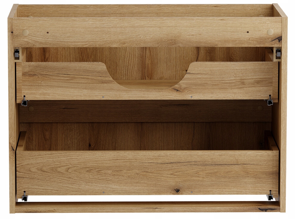 Korpusy mebli wykonane są z płyty laminowanej, natomiast fronty z płyty MDF, co zapewnia trwałość, odporność na wilgoć oraz estetyczne wykończenie. Zintegrowane podchwyty podkreślają minimalistyczną formę bryły, a wiszący montaż nadaje całości lekkości i ułatwia utrzymanie czystości w łazience. Umywalka ceramiczna posiada przelew oraz otwór na baterię. Bateria, syfon oraz korek click-clack nie są częścią zestawu. Meble zostały wyprodukowane w Polsce z dbałością o jakość wykonania.