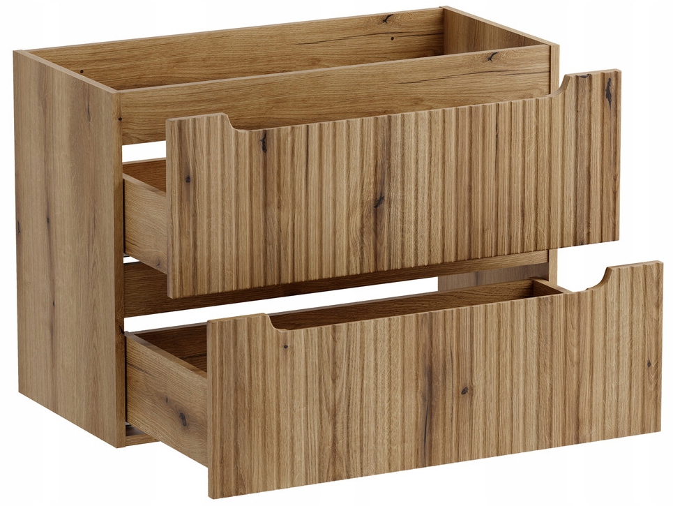 Szafka łazienkowa z kolekcji Nova w dekorze dąb Coast Evoke to rozbudowana, a jednocześnie spójna zabudowa zaprojektowana jako jedna bryła o szerokości 120 cm. Naturalny odcień drewna w połączeniu z eleganckimi, pionowymi ryflowaniami na frontach nadaje całości ciepły i nowoczesny charakter, który doskonale wpisuje się w aranżacje inspirowane naturą oraz współczesnym minimalizmem.