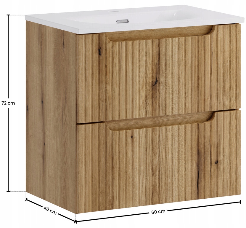 Fronty wykonane z płyty MDF posiadają pionowe ryflowania oraz zintegrowane podchwyty, dzięki czemu mebel zachowuje minimalistyczną formę bez widocznych uchwytów. Korpus z płyty laminowanej gwarantuje trwałość i odporność na wilgoć, a system cichego domykania zwiększa wygodę użytkowania. Umywalka ceramiczna w kolorze biały połysk posiada przelew oraz otwór na baterię. Bateria, syfon oraz korek click-clack nie są częścią zestawu. Produkt został wyprodukowany w Polsce z dbałością o jakość wykonania.