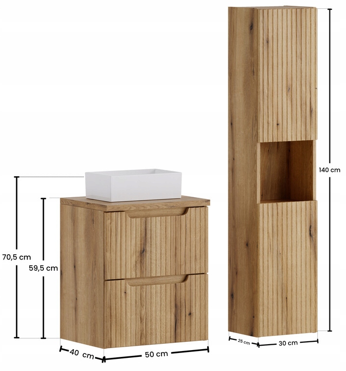 Korpusy mebli wykonane są z płyty laminowanej, natomiast fronty z płyty MDF, co zapewnia trwałość, odporność na wilgoć i estetyczne wykończenie. Ryflowane fronty ze zintegrowanymi podchwytami oraz system cichego domykania podnoszą komfort codziennego użytkowania i podkreślają nowoczesny charakter zestawu. Wiszący montaż nadaje bryłom lekkości i ułatwia utrzymanie czystości w łazience. Bateria, syfon oraz korek click-clack nie są częścią zestawu. Meble zostały wyprodukowane w Polsce z dbałością o jakość wykonania.