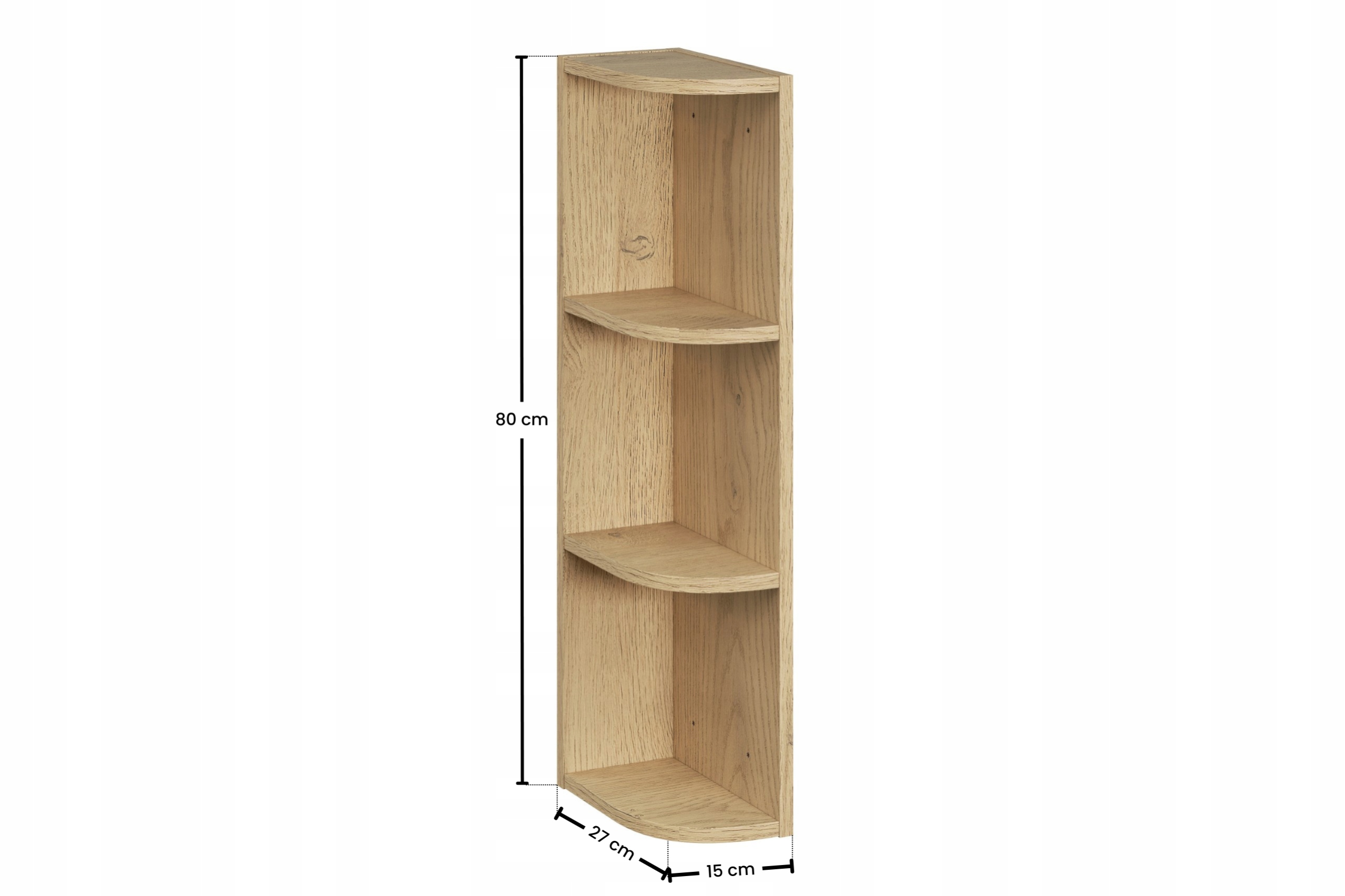 Model o szerokości 15 cm, wysokości 80 cm i głębokości 25 cm został zaprojektowany jako narożny regał górny, który estetycznie zamyka zabudowę meblową. Trzy otwarte półki oferują wygodne miejsce na kosmetyki, ręczniki lub dekoracyjne dodatki, pozwalając zachować porządek i jednocześnie wyeksponować detale wnętrza.