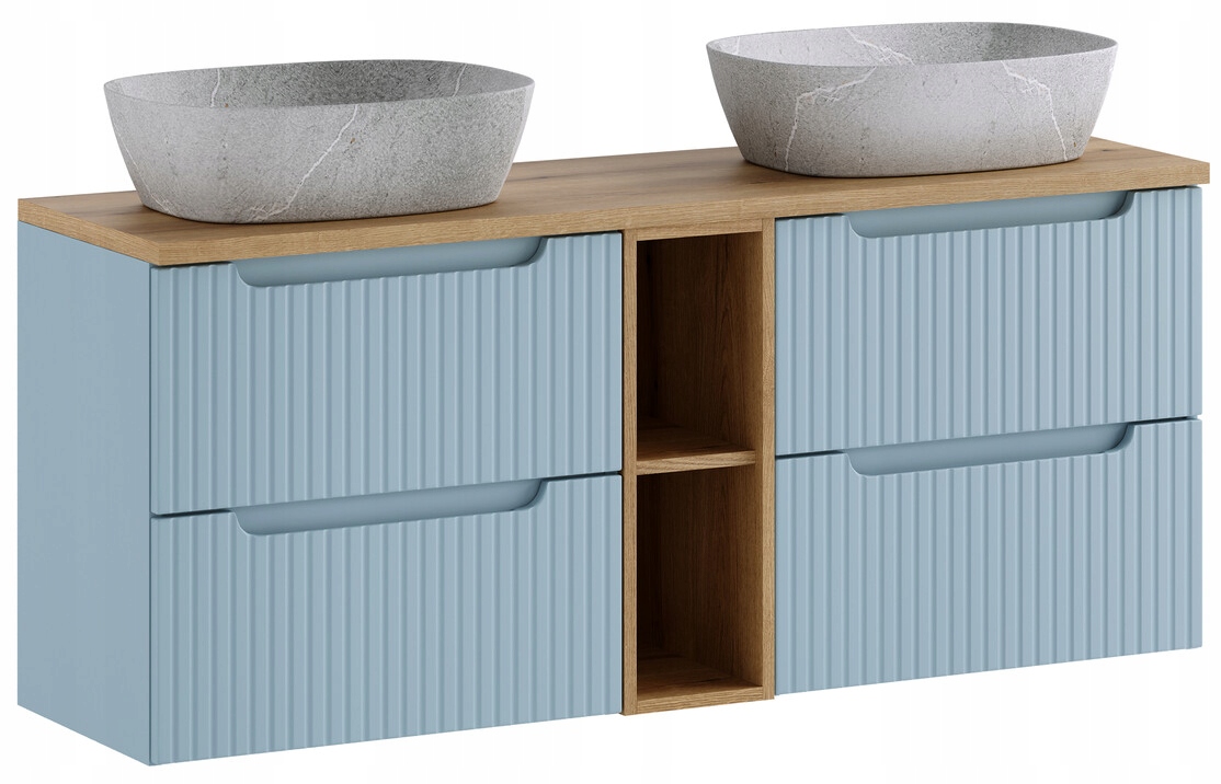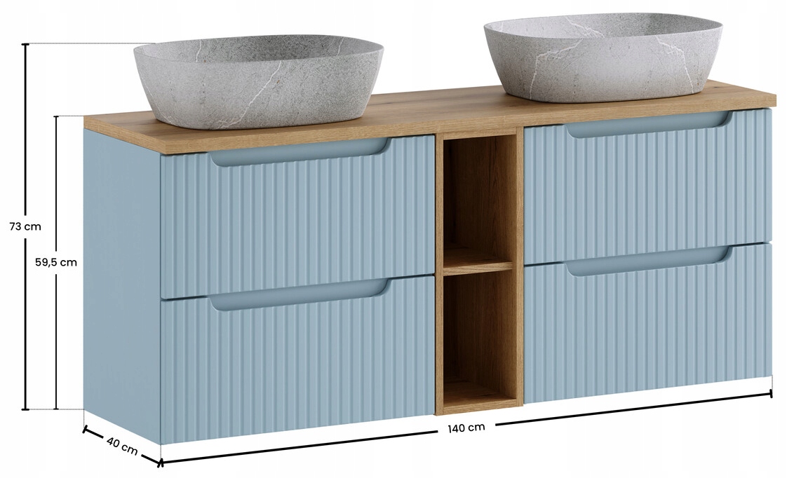 Prezentowany zestaw łazienkowy 140 cm z blatem w dekorze Dąb Coast Evoke oraz dwiema umywalkami nablatowymi ANNA tworzy komfortową, podwójną strefę umywalkową. Dwie szafki 60 cm oraz moduł 20 cm można ustawić w dowolnej kolejności i połączyć wspólnym blatem 140 cm, co daje pełną swobodę aranżacyjną. To idealne rozwiązanie do większych łazienek.