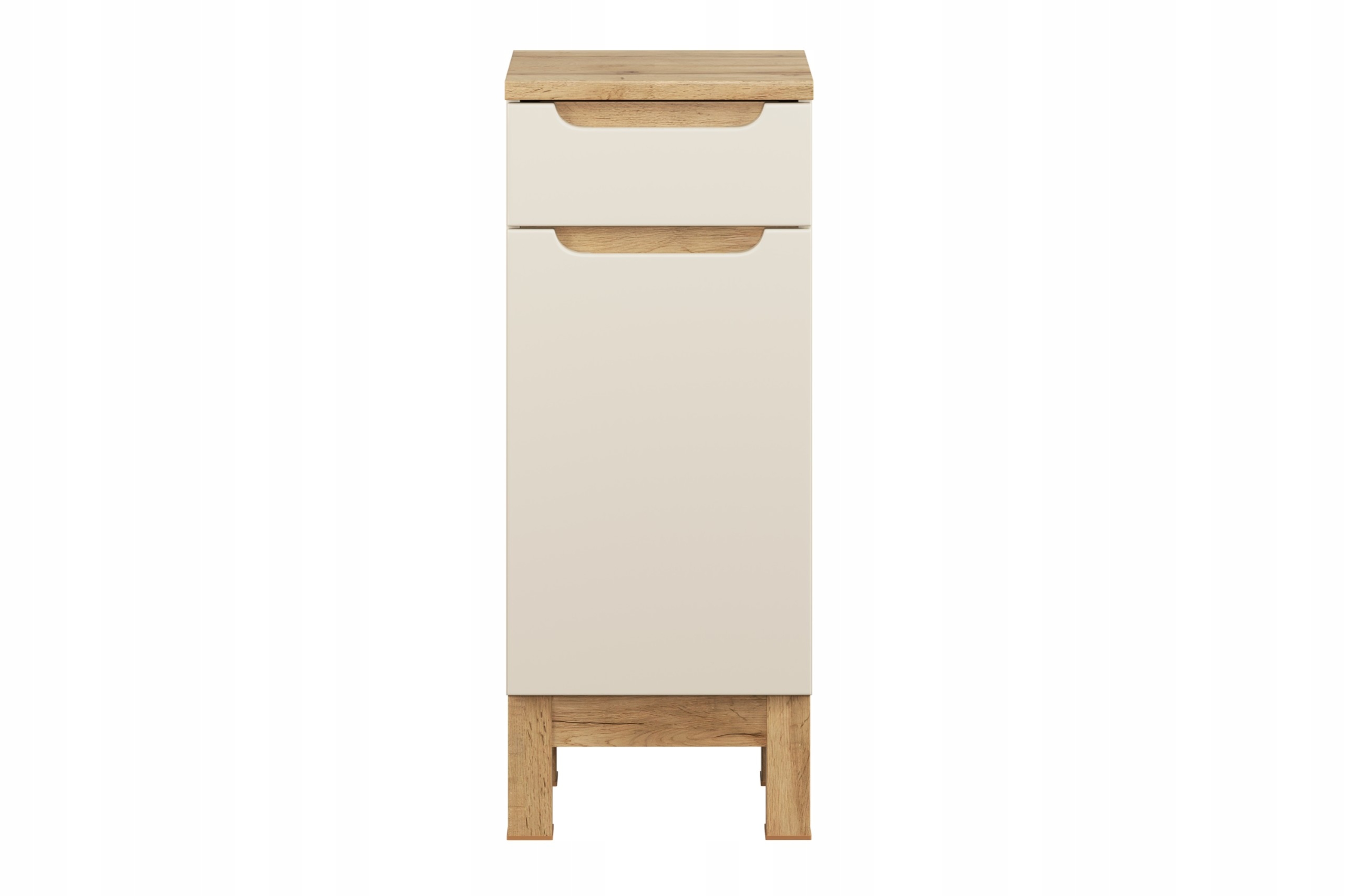 Szafka dolna o szerokości 35 cm z kolekcji Bali Cashmere to funkcjonalny i elegancki element wyposażenia łazienki. Delikatny dekor kaszmirowego beżu w połączeniu z naturalnym akcentem dąb wotan nadaje bryle nowoczesnego, a jednocześnie przytulnego charakteru. Smukłe nogi wizualnie wysmuklają mebel, a gładkie fronty z zintegrowanymi podchwytami podkreślają minimalistyczny styl całej kolekcji.