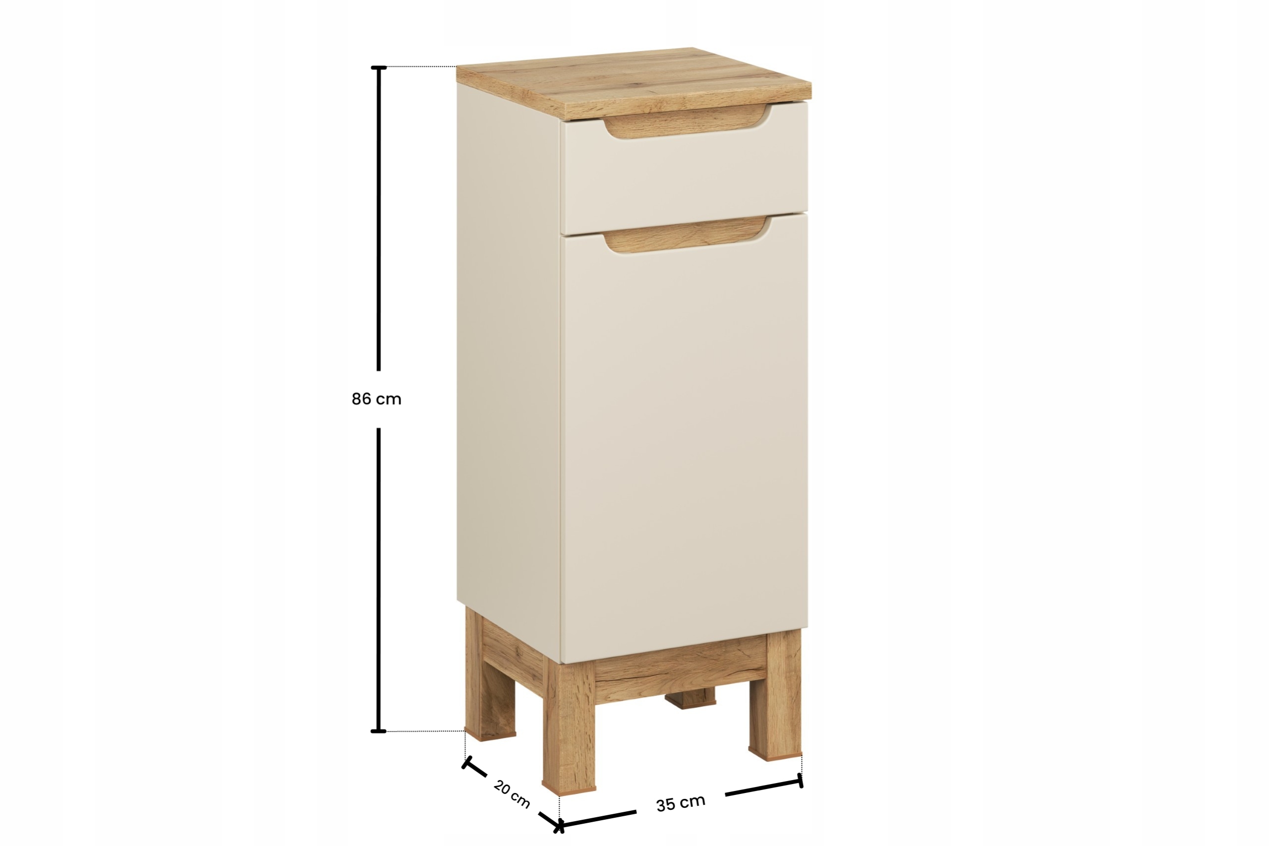 Szafka ma wysokość 87 cm i głębokość 33 cm, a jej dokładna szerokość wynosi 35 cm. Wykonana została z płyty laminowanej oraz MDF, co gwarantuje trwałość i estetyczny wygląd. Kolor kaszmir w macie w połączeniu z dębem wotan sprawia, że mebel doskonale odnajdzie się zarówno w nowoczesnych, jak i klasycznych aranżacjach. Szafka jest polską produkcją z materiałów z certyfikatem FSC i dostarczana jest w paczkach do samodzielnego montażu wraz z instrukcją i zestawem montażowym.