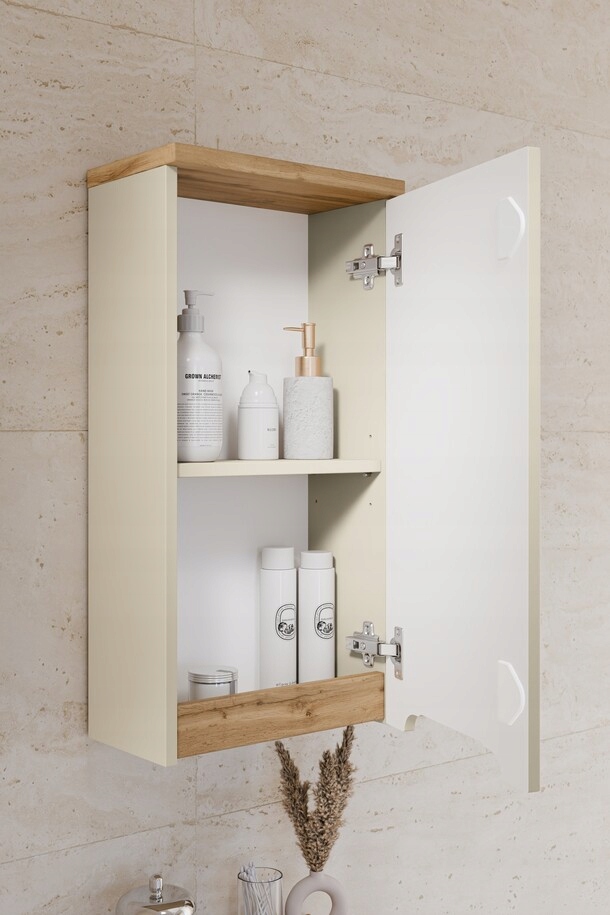 Mebel oferuje wygodną przestrzeń do przechowywania dzięki dwóm półkom ukrytym za drzwiami – jednej stałej i jednej regulowanej. System cichego domykania sprawia, że korzystanie z szafki jest wyjątkowo komfortowe, a wysokiej jakości materiały zapewniają trwałość i estetyczny wygląd na lata. Dzięki kompaktowej formie szafka doskonale sprawdzi się w mniejszych łazienkach, a jednocześnie uzupełni większe aranżacje.