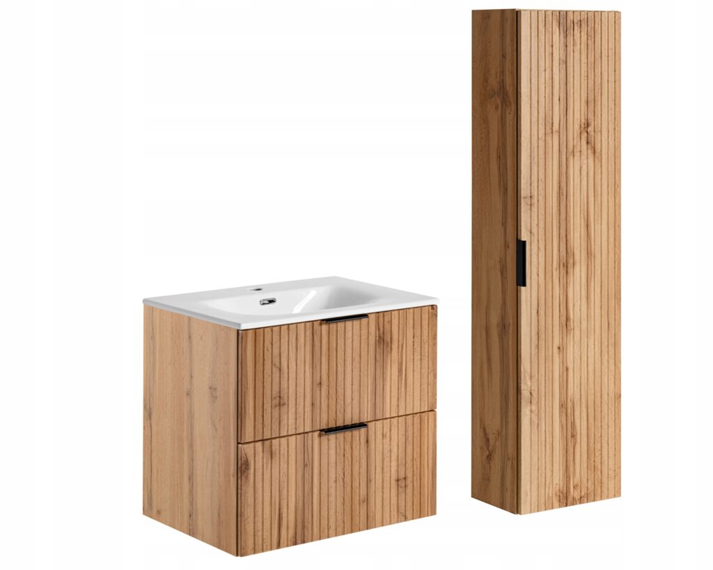 Mebel wykonany jest z połączenia płyty MDF na froncie oraz płyty laminowanej w korpusie, co zapewnia trwałość i stabilność konstrukcji. System cichego domykania zwiększa komfort codziennego użytkowania. Szafka przeznaczona jest do montażu wiszącego, co nadaje zabudowie lekkości i ułatwia utrzymanie porządku w łazience. Mebel przeznaczony jest do użytkowania w łazience w warunkach domowych – dla zachowania trwałości i estetyki zaleca się unikanie długotrwałego kontaktu powierzchni z wodą oraz regularne wycieranie wilgoci.