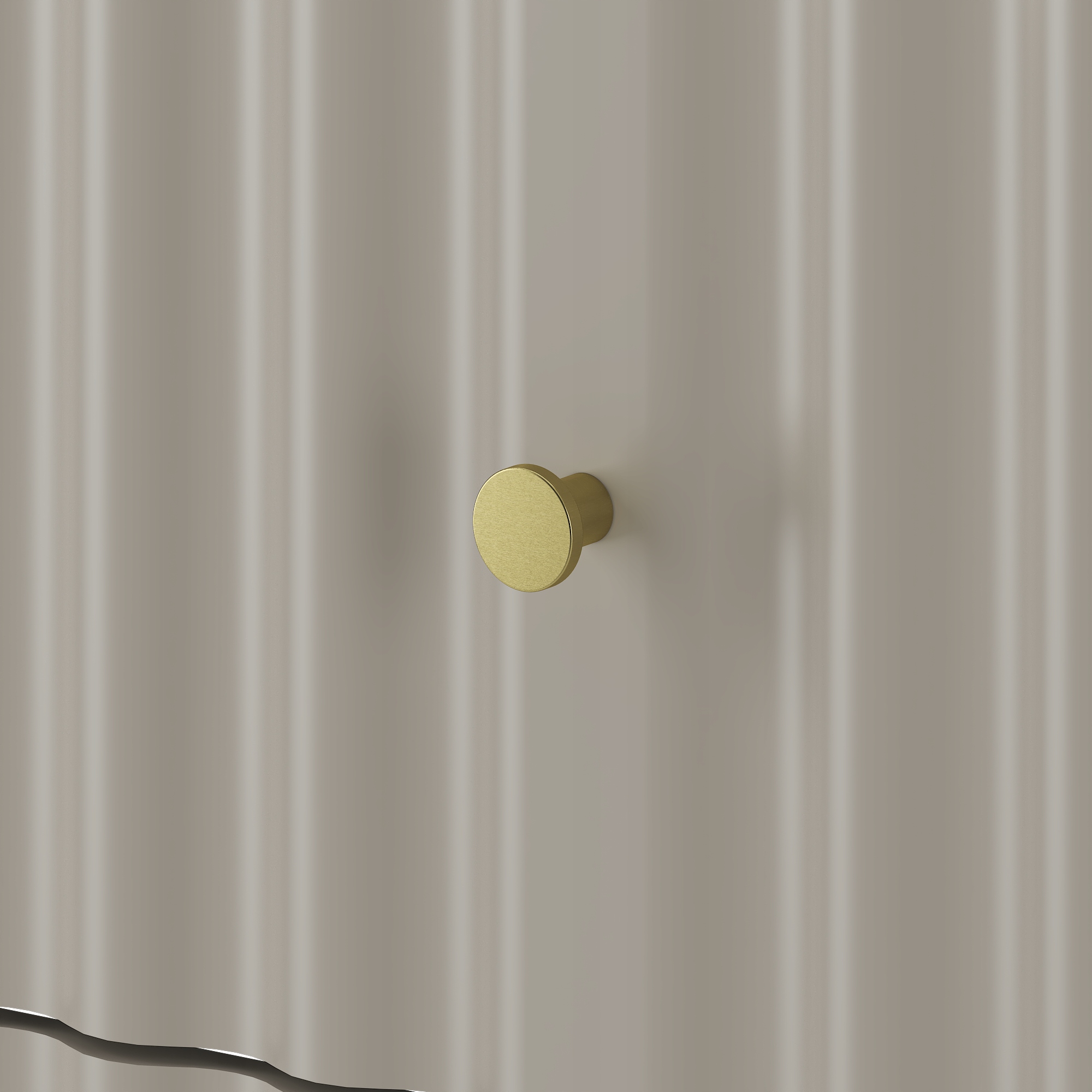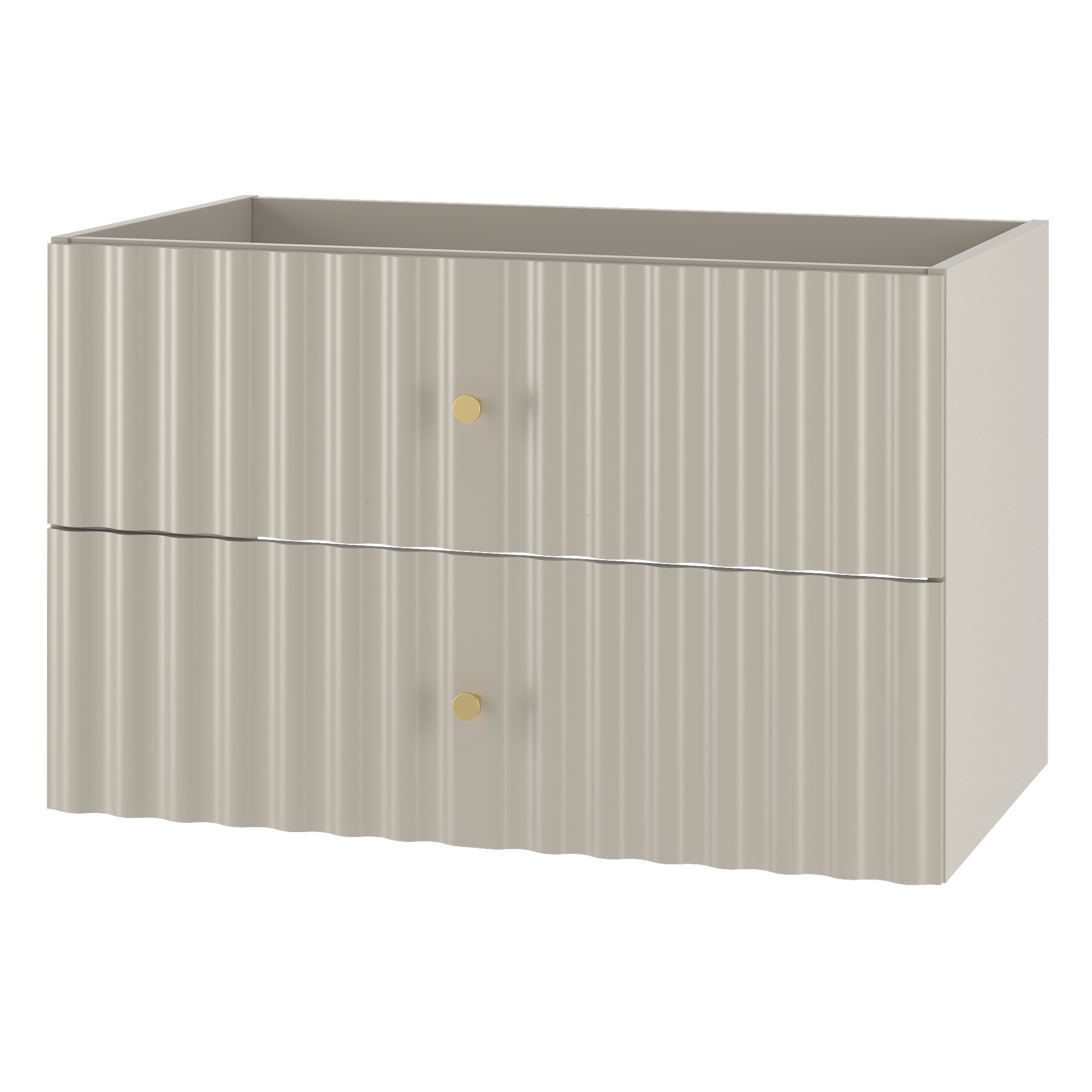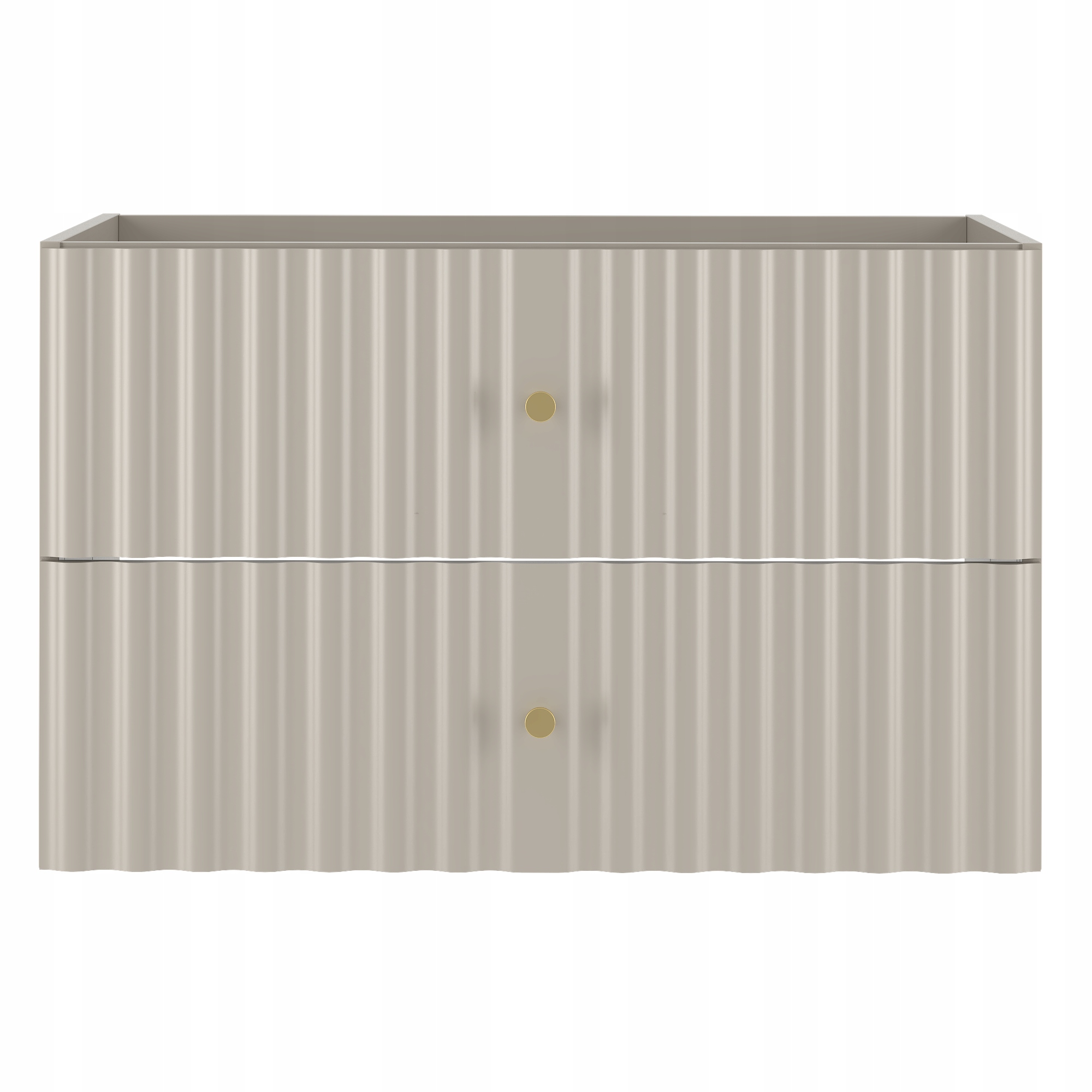 Szafka ma wysokość 50 cm, głębokość 45,8 cm i szerokość 80 cm. Korpus wykonano z płyty laminowanej o grubości 16 mm, natomiast ryflowane fronty powstały z płyty MDF o grubości 18 mm, wykończonej folią meblową. Wnętrze szuflad w kolorze kaszmir z białym dnem tworzy elegancki kontrast, który podkreśla staranność wykonania. Mebel produkowany jest w Polsce z materiałów posiadających certyfikat FSC i dostarczany w paczkach do samodzielnego montażu wraz z instrukcją i zestawem montażowym.