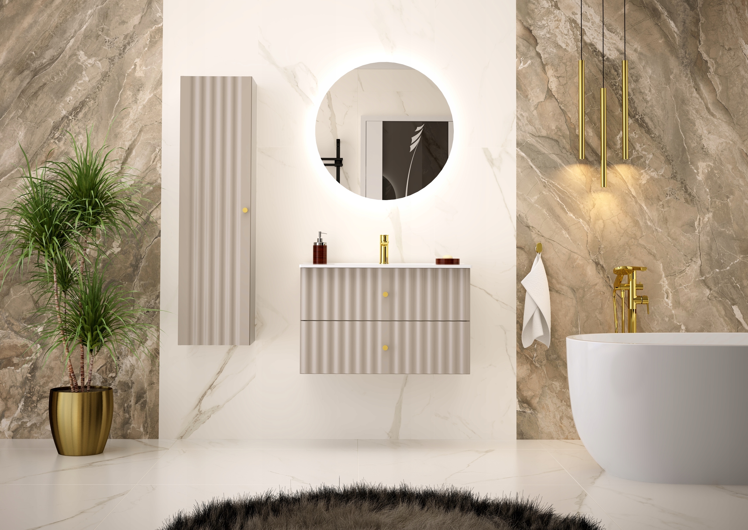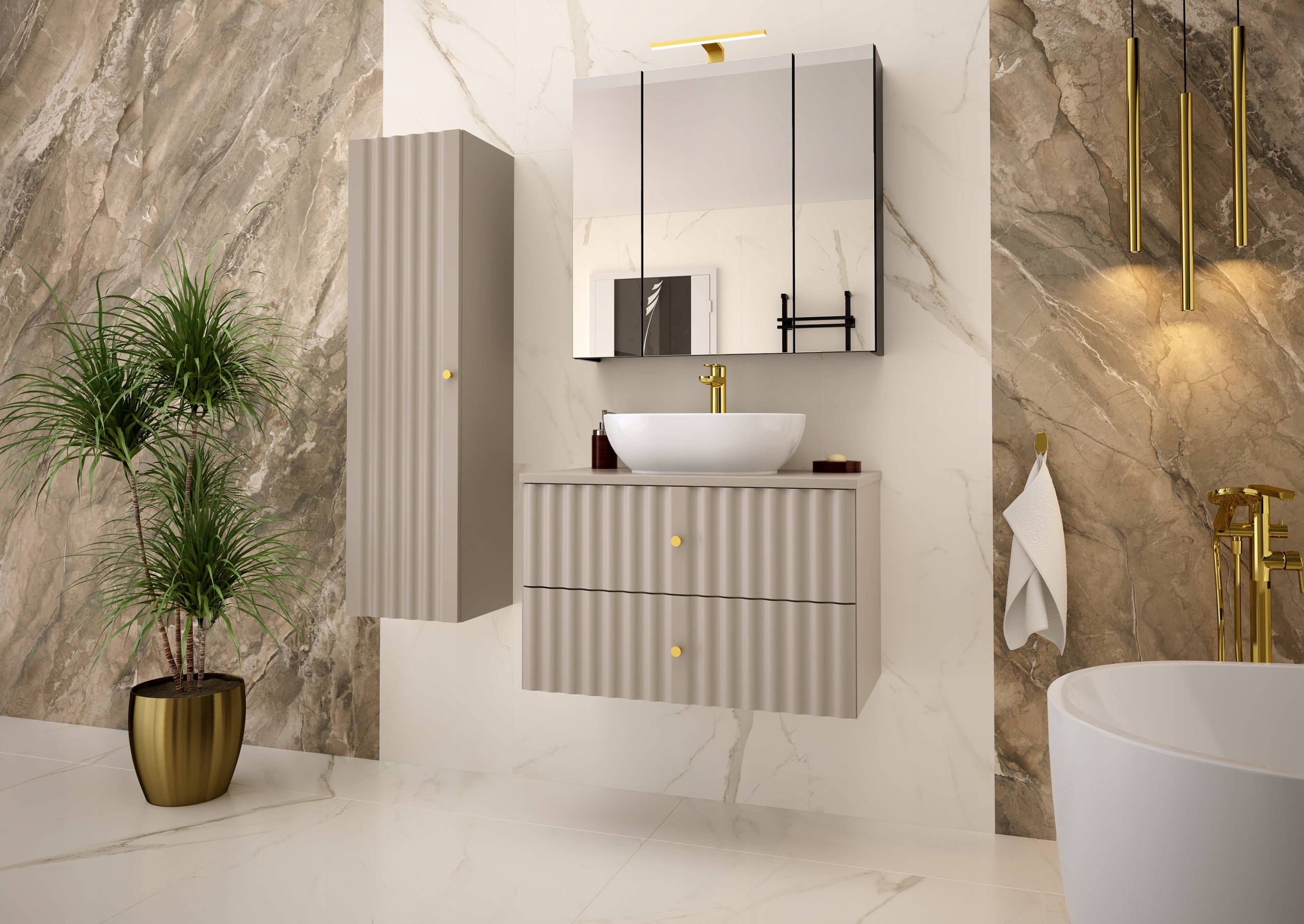 Szafka łazienkowa z kolekcji Aqua o szerokości 80 cm w kolorze Woodeco Kaszmirowy Beż HU1506 to eleganckie i funkcjonalne rozwiązanie do nowoczesnych łazienek. Charakterystyczne ryflowane fronty z płyty MDF w odcieniu kaszmiru nadają meblowi wyjątkowego charakteru, a złote uchwyty w formie metalowych gałek podkreślają jego stylową i luksusową formę. Mebel zaprojektowano tak, aby łączył wyrafinowany wygląd z wygodą codziennego użytkowania.