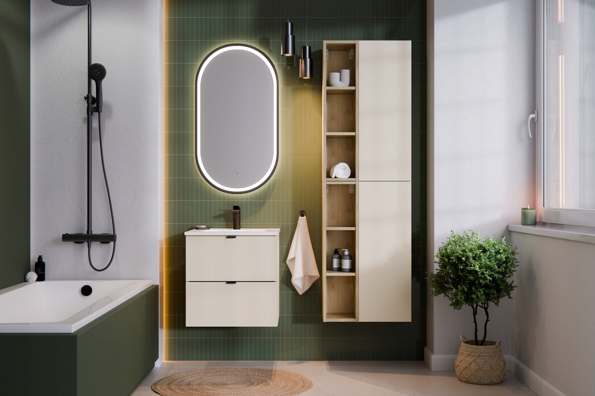 Szafka łazienkowa Dalia Cashmere to połączenie subtelnej elegancji i funkcjonalności w nowoczesnej formie. Gładkie fronty w matowym odcieniu kaszmiru wprowadzają do wnętrza ciepło i spokój, tworząc harmonijną i przytulną atmosferę. Minimalistyczny design kolekcji Dalia doskonale współgra z nowoczesnymi aranżacjami, podkreślając ich prostotę i ponadczasowy charakter.