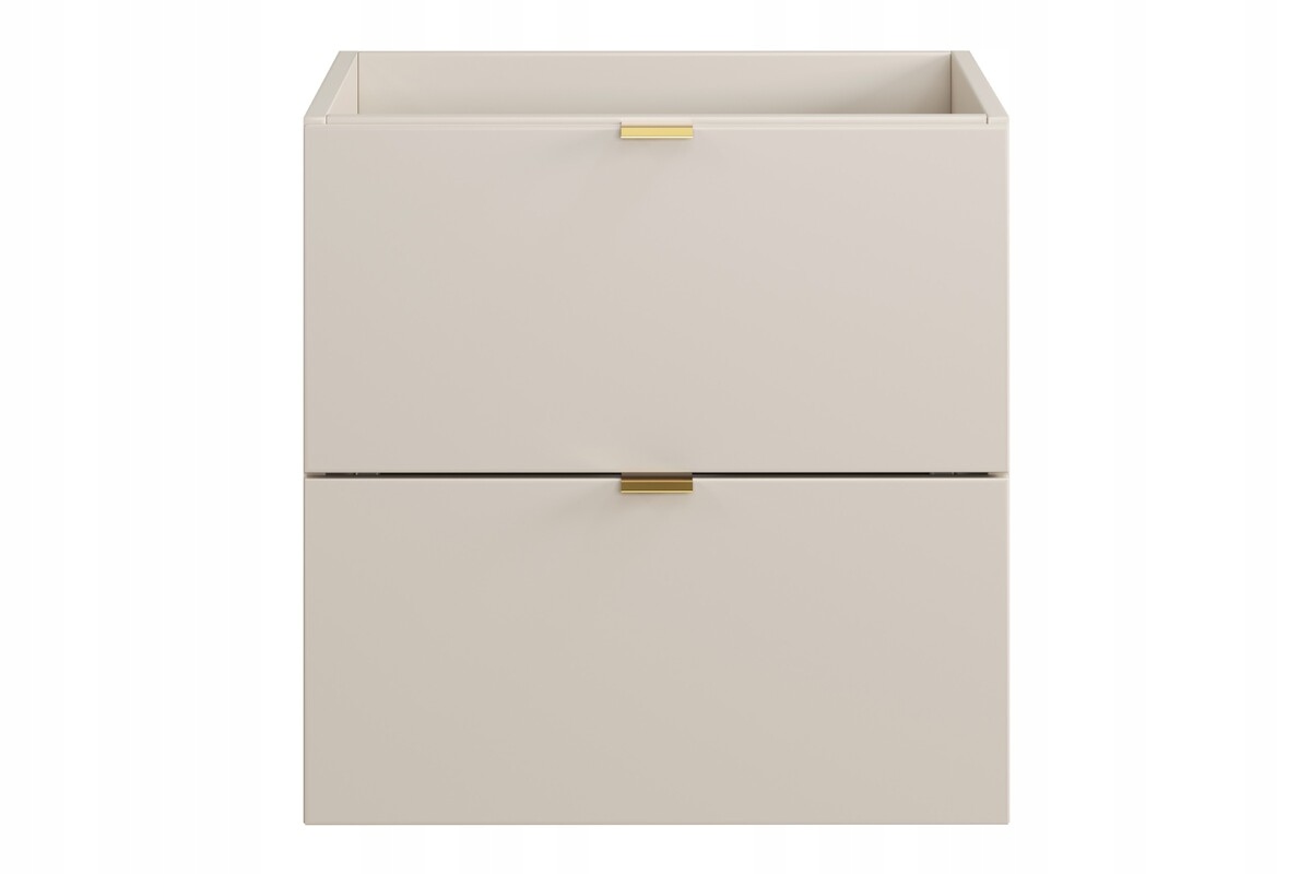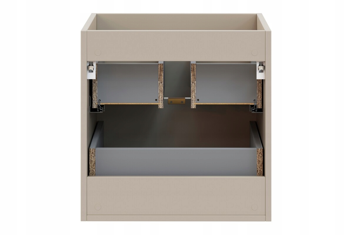 Korpus i fronty wykonano z płyty laminowanej o grubości 16 mm w kolorze kaszmir mat, odpornej na wilgoć i łatwej w pielęgnacji. W zestawie znajdują się trzy warianty uchwytów – złoty połysk, chrom połysk oraz czarny mat – co pozwala dopasować wygląd mebla do indywidualnego stylu wnętrza.