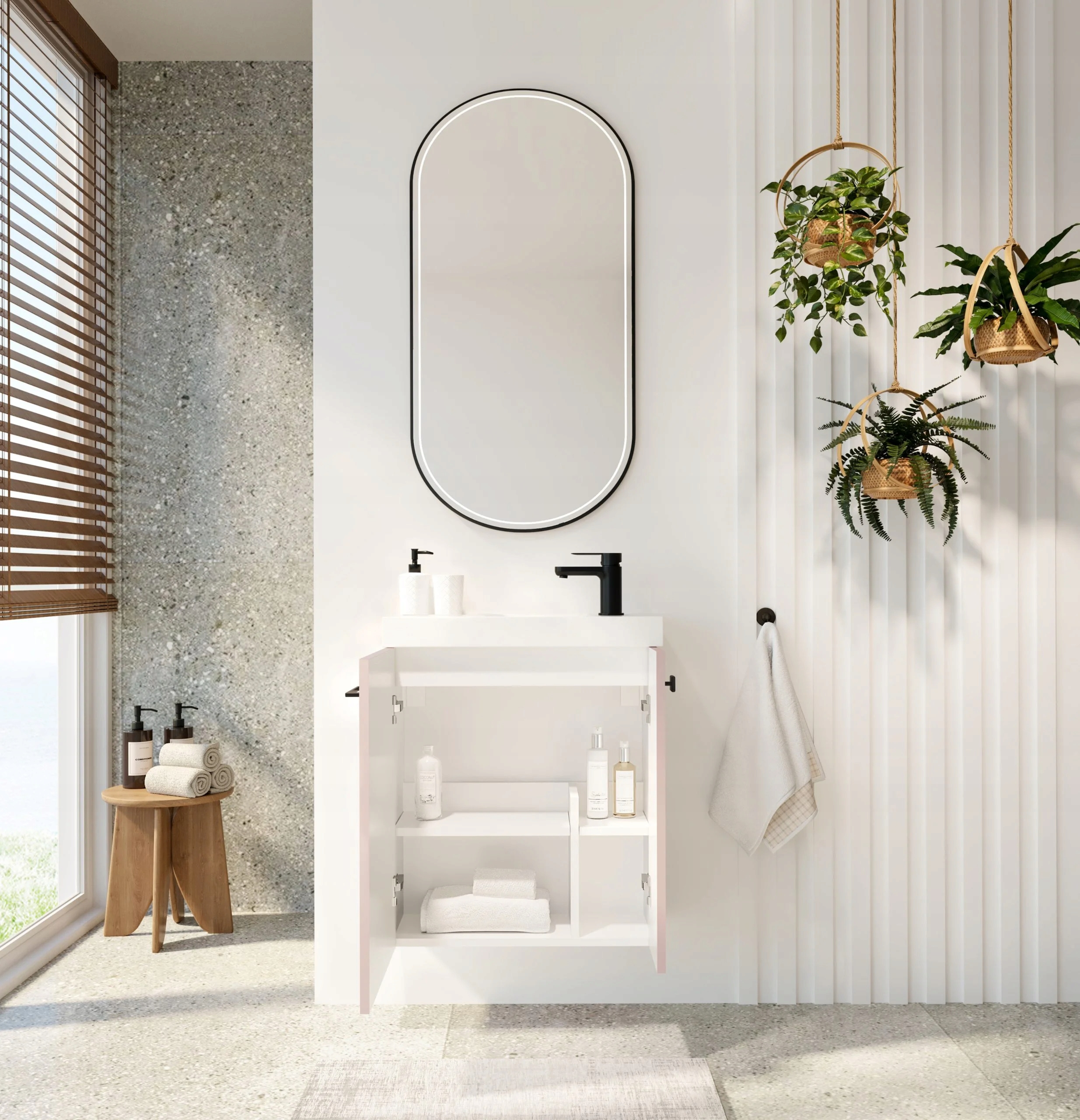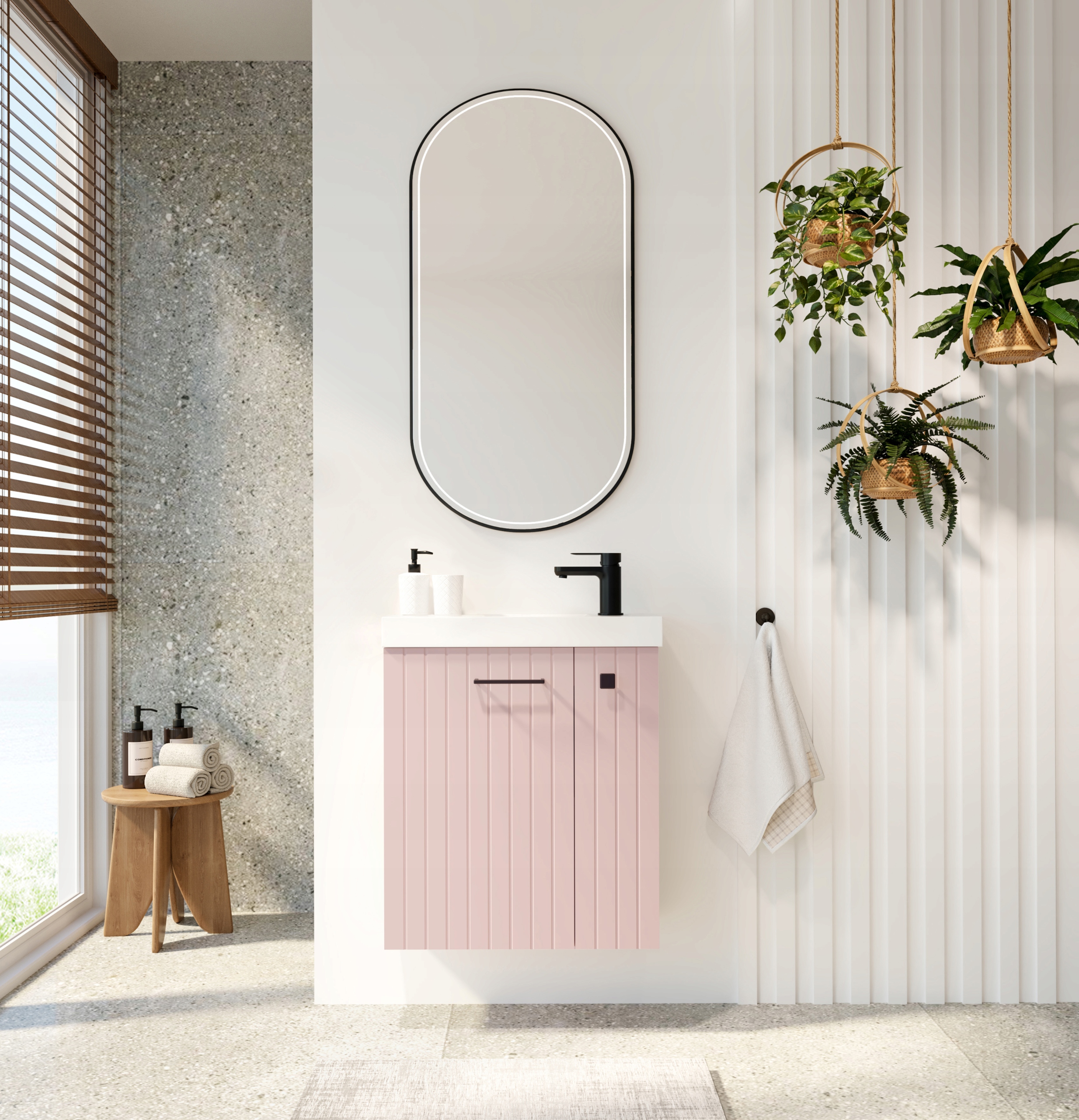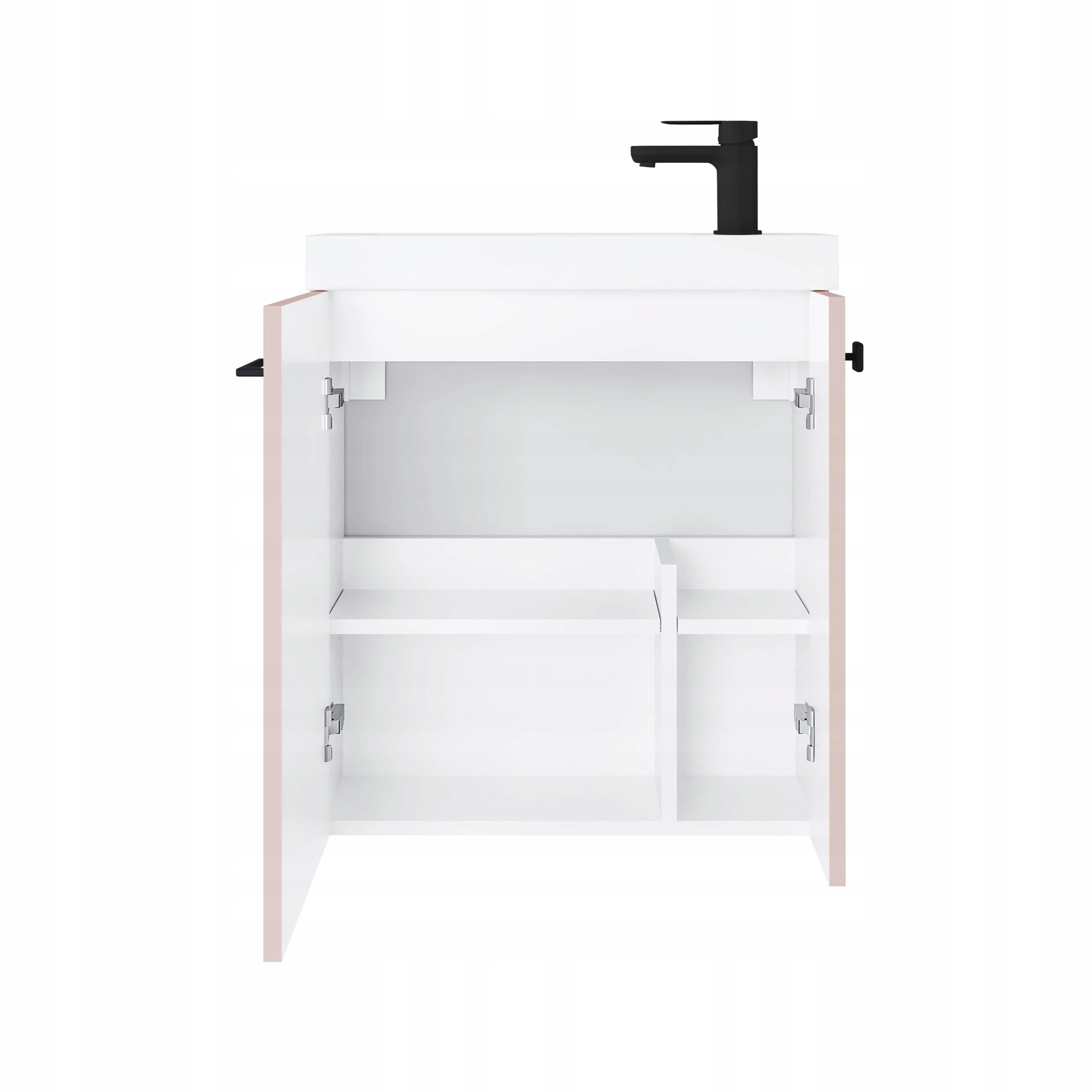Szafka NOOK 55 w pudrowym różu to propozycja dla osób, które chcą wprowadzić do łazienki delikatny kolor w eleganckim i nowoczesnym wydaniu. Matowa, lakierowana powierzchnia szafki oraz frezowany front przyciągają wzrok subtelną formą, a czarny uchwyt dodaje całości wyrazistego kontrastu. To idealne rozwiązanie do niewielkich wnętrz, które łączy kompaktowe wymiary z efektownym wyglądem. Zestaw uzupełnia ultracienka ceramiczna umywalka Slim-Line w białym połysku, doskonale dopasowana do bryły mebla. Przemyślany układ wewnętrzny z dwiema wydzielonymi strefami – prywatną i gościnną – pozwala zachować porządek i wygodę codziennego użytkowania. Frezowany front został wyposażony w system cichego domyku, a czarny uchwyt może pełnić również funkcję wieszaka na ręcznik. Mebel jest fabrycznie zmontowany i gotowy do instalacji, a całość została wyprodukowana w Polsce. Zestaw nie zawiera baterii.