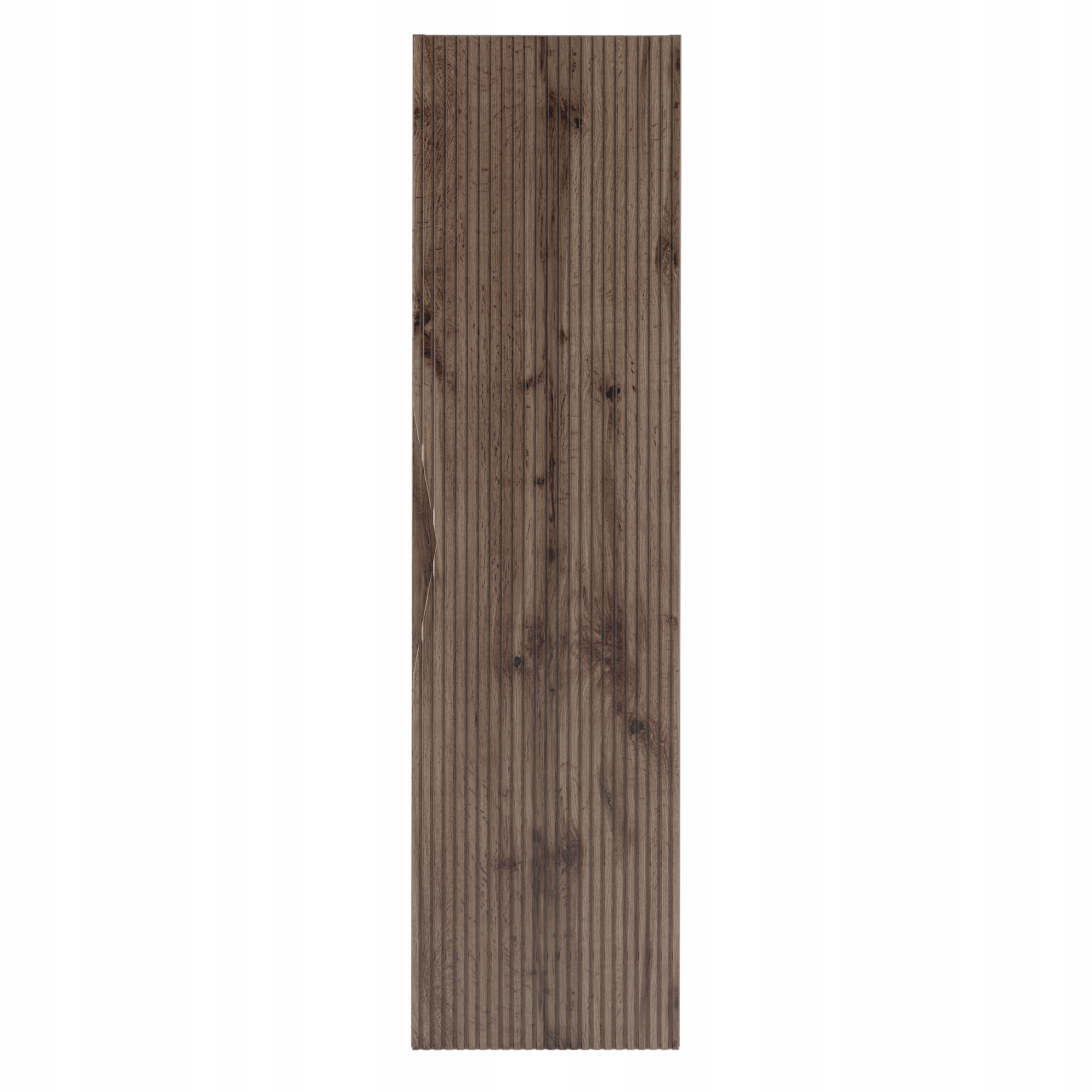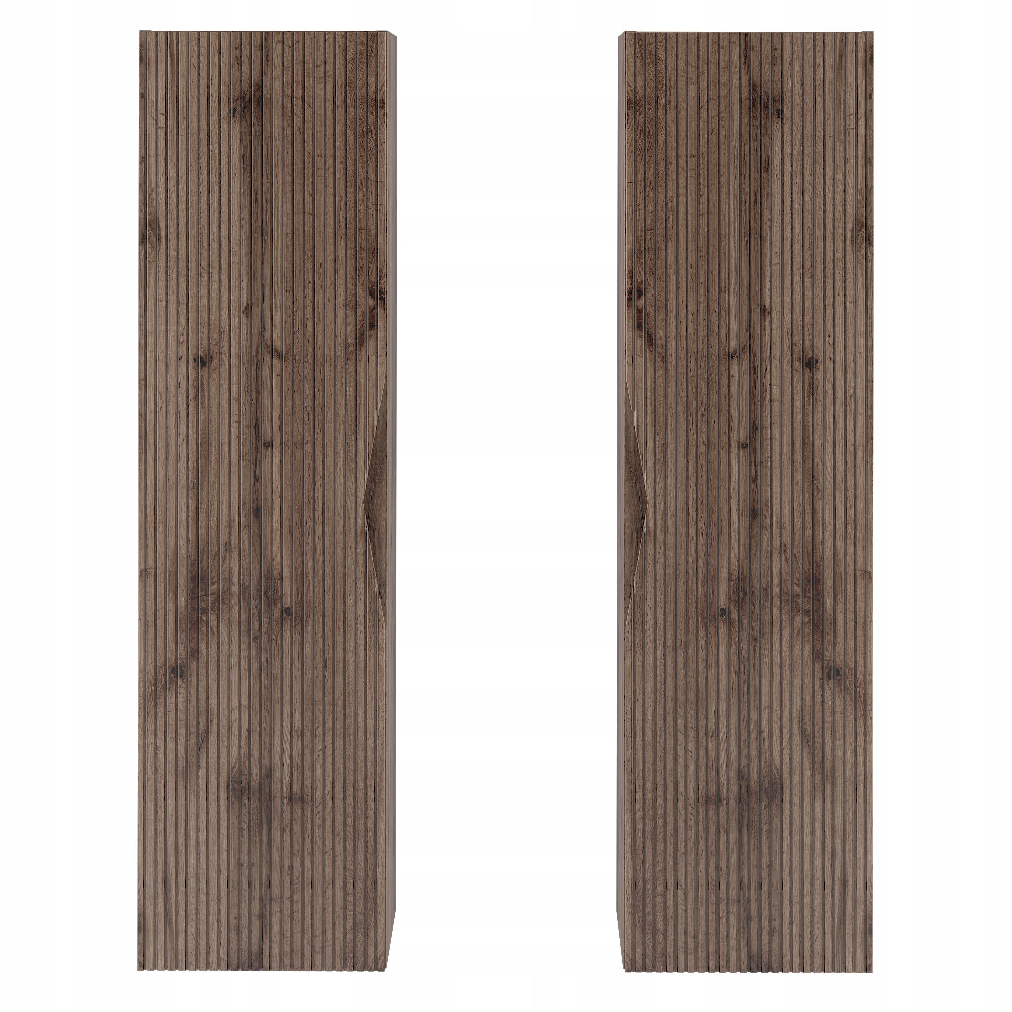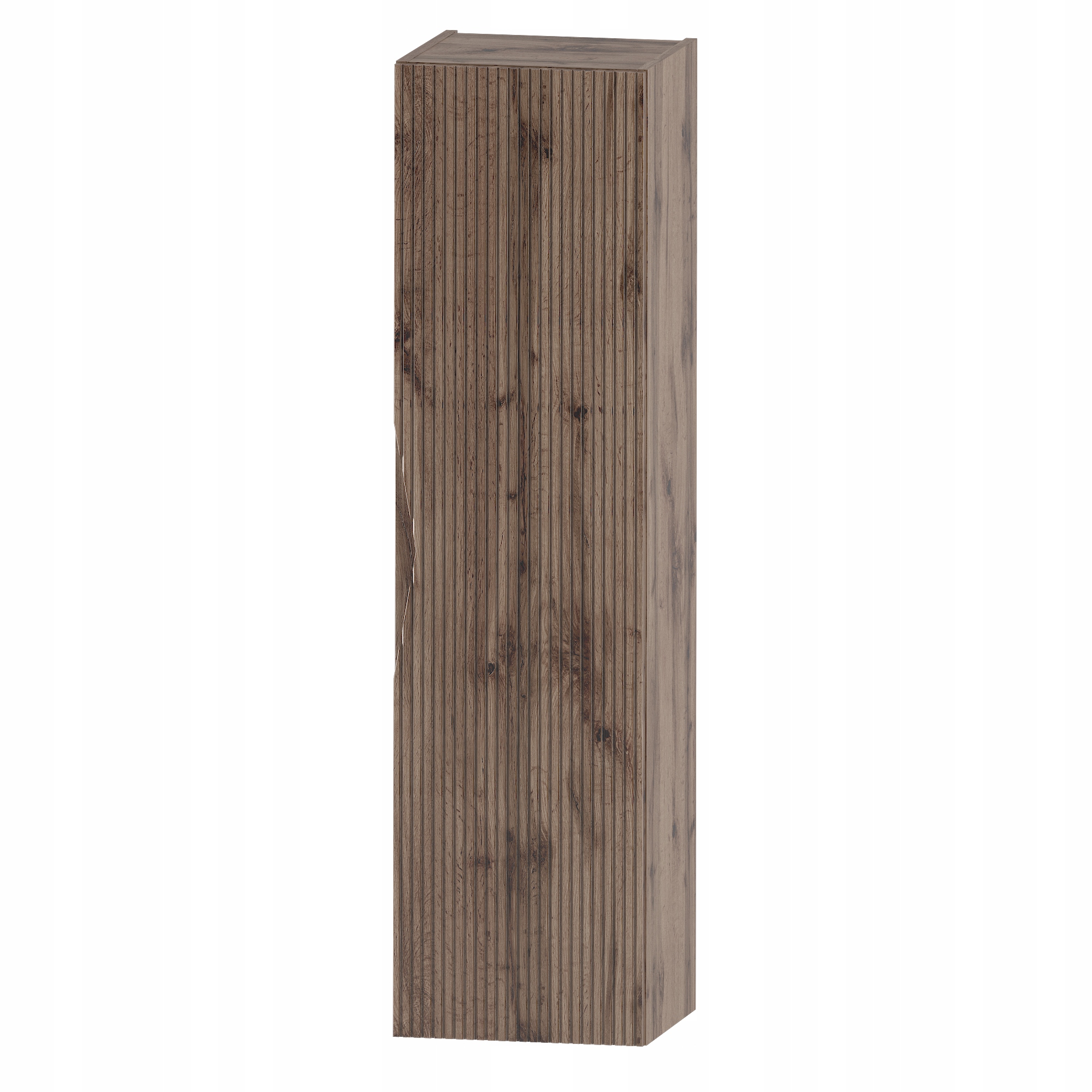 Słupek łazienkowy CLEO o wysokości 130 cm, szerokości 34,5 cm i głębokości 31,8 cm w dekorze dąb wotan to eleganckie rozwiązanie, które łączy naturalny charakter drewna z nowoczesnym wzornictwem. Ryflowane fronty z płyty MDF o grubości 18 mm podkreślają elegancję, a zintegrowany frezowany uchwyt nadaje całości minimalistycznego i stylowego wyrazu.