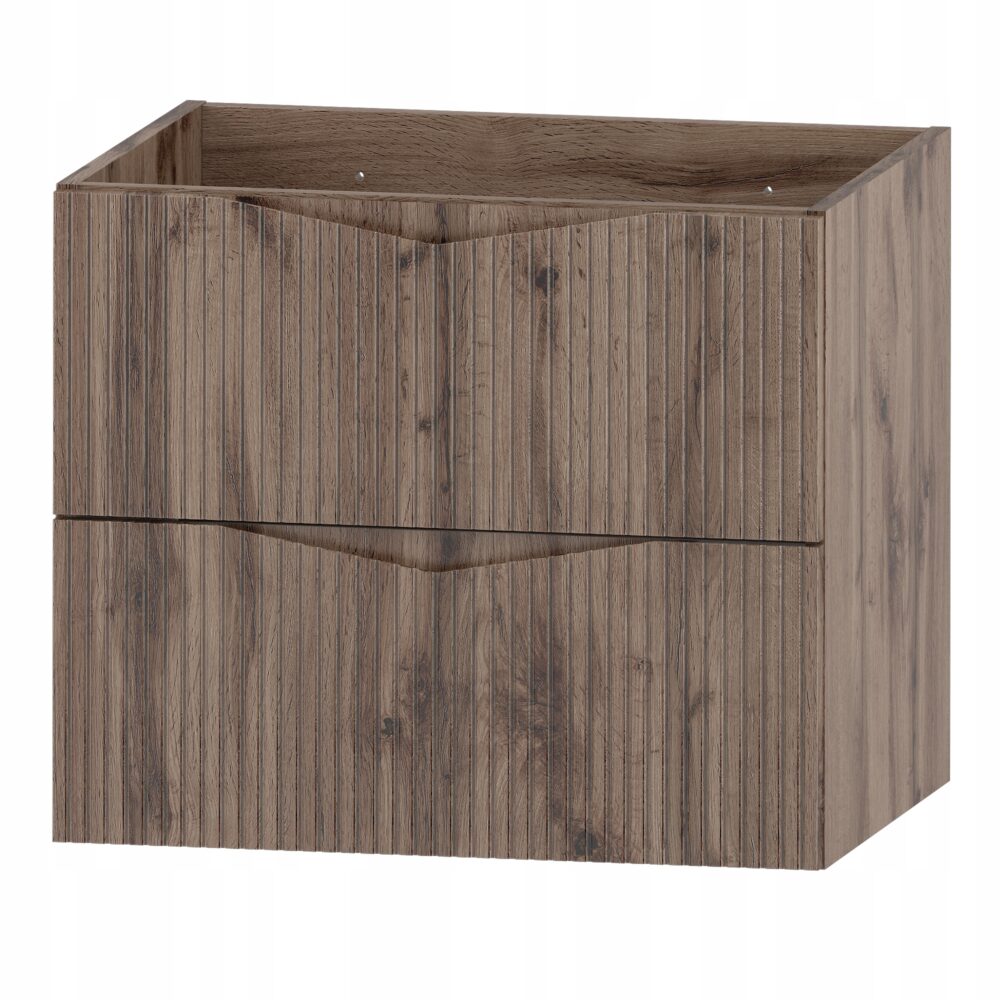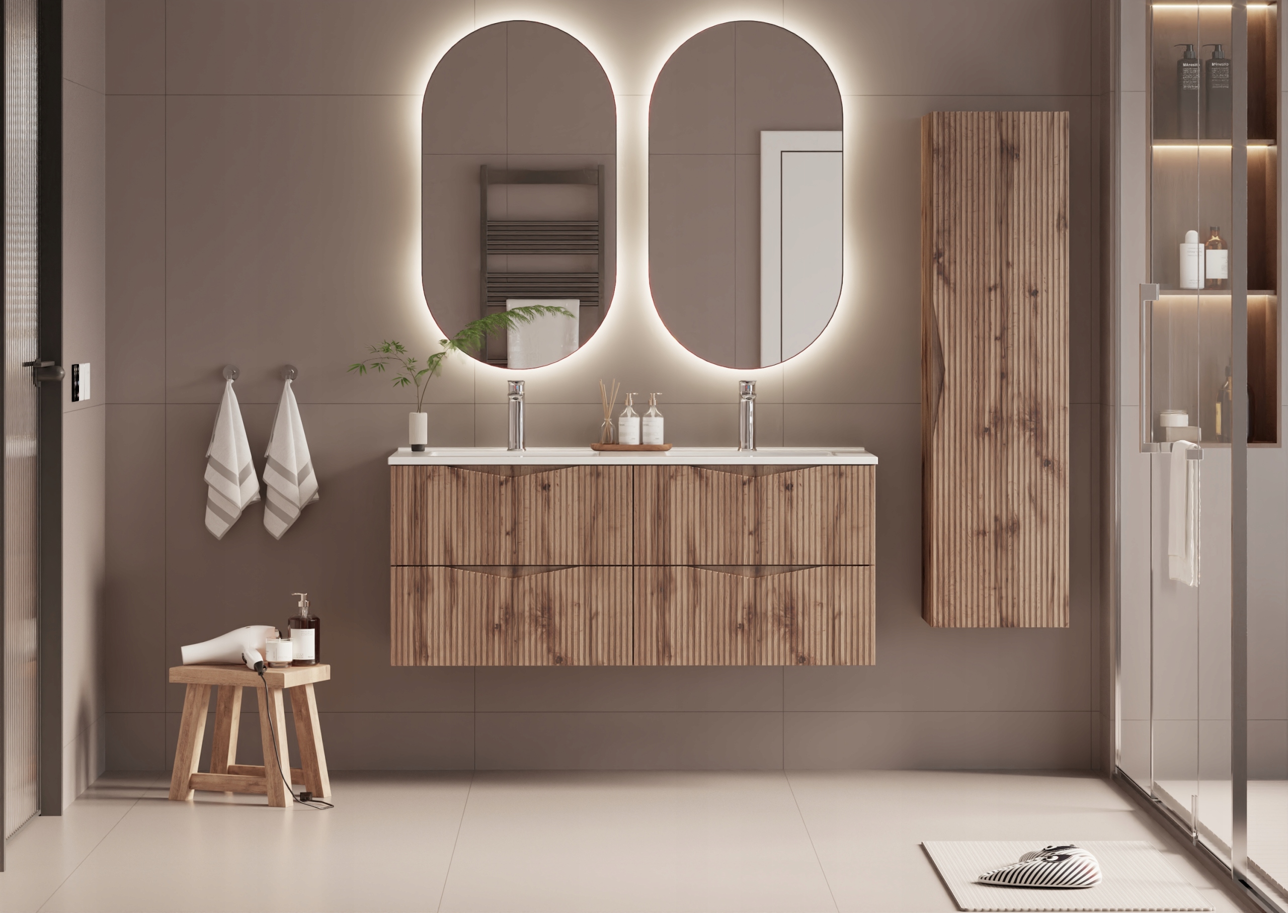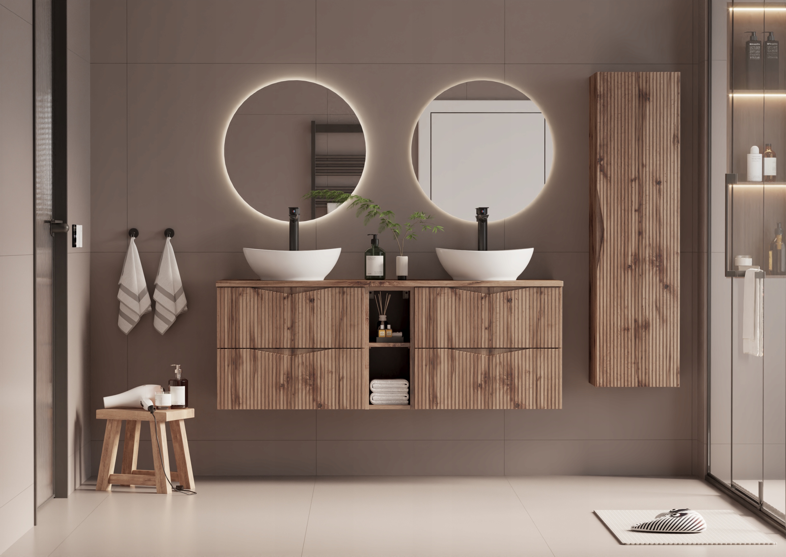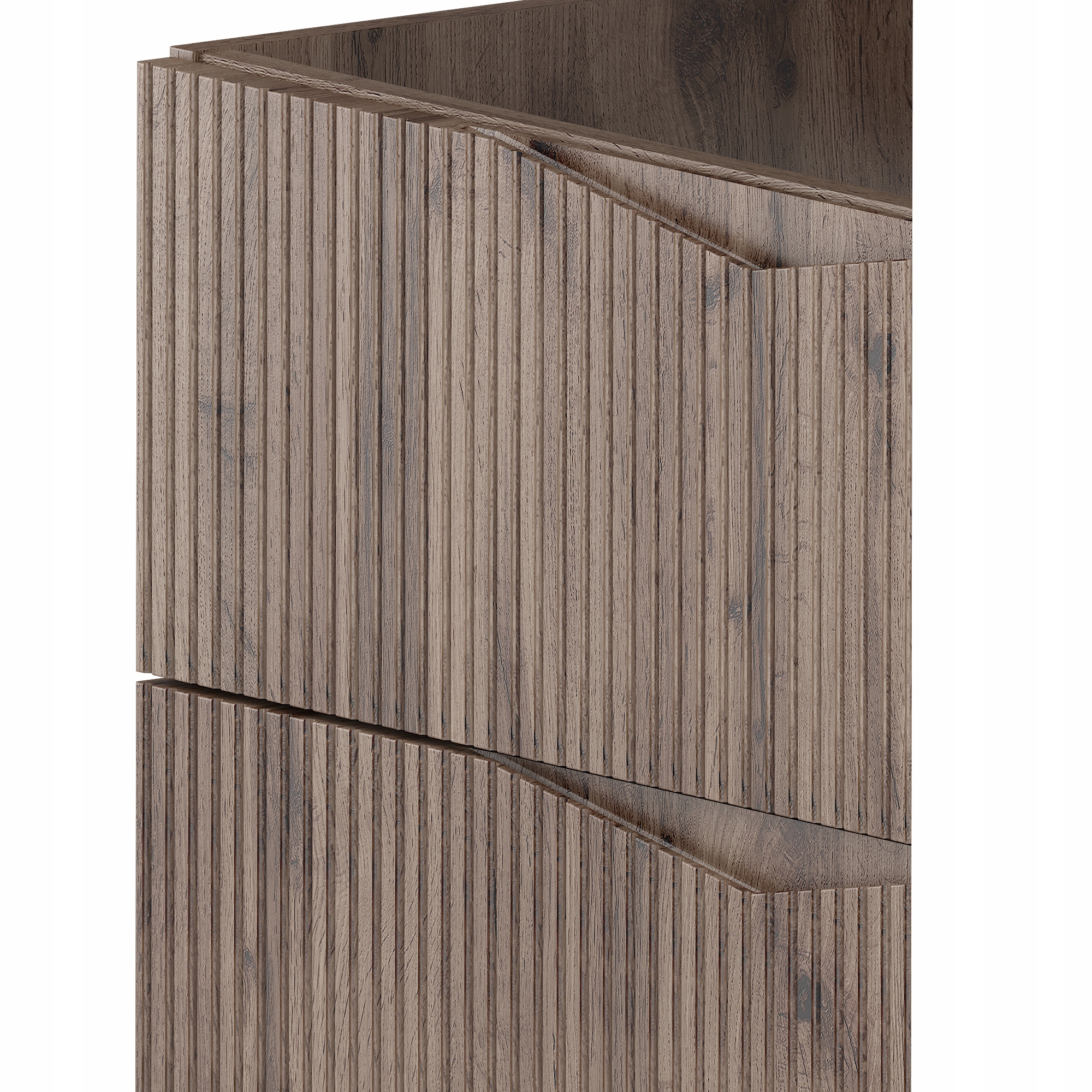 Słupek łazienkowy CLEO o wysokości 130 cm, szerokości 34,5 cm i głębokości 31,8 cm w dekorze dąb wotan to eleganckie rozwiązanie, które łączy naturalny charakter drewna z nowoczesnym wzornictwem. Ryflowane fronty z płyty MDF o grubości 18 mm podkreślają elegancję, a zintegrowany frezowany uchwyt nadaje całości minimalistycznego i stylowego wyrazu.