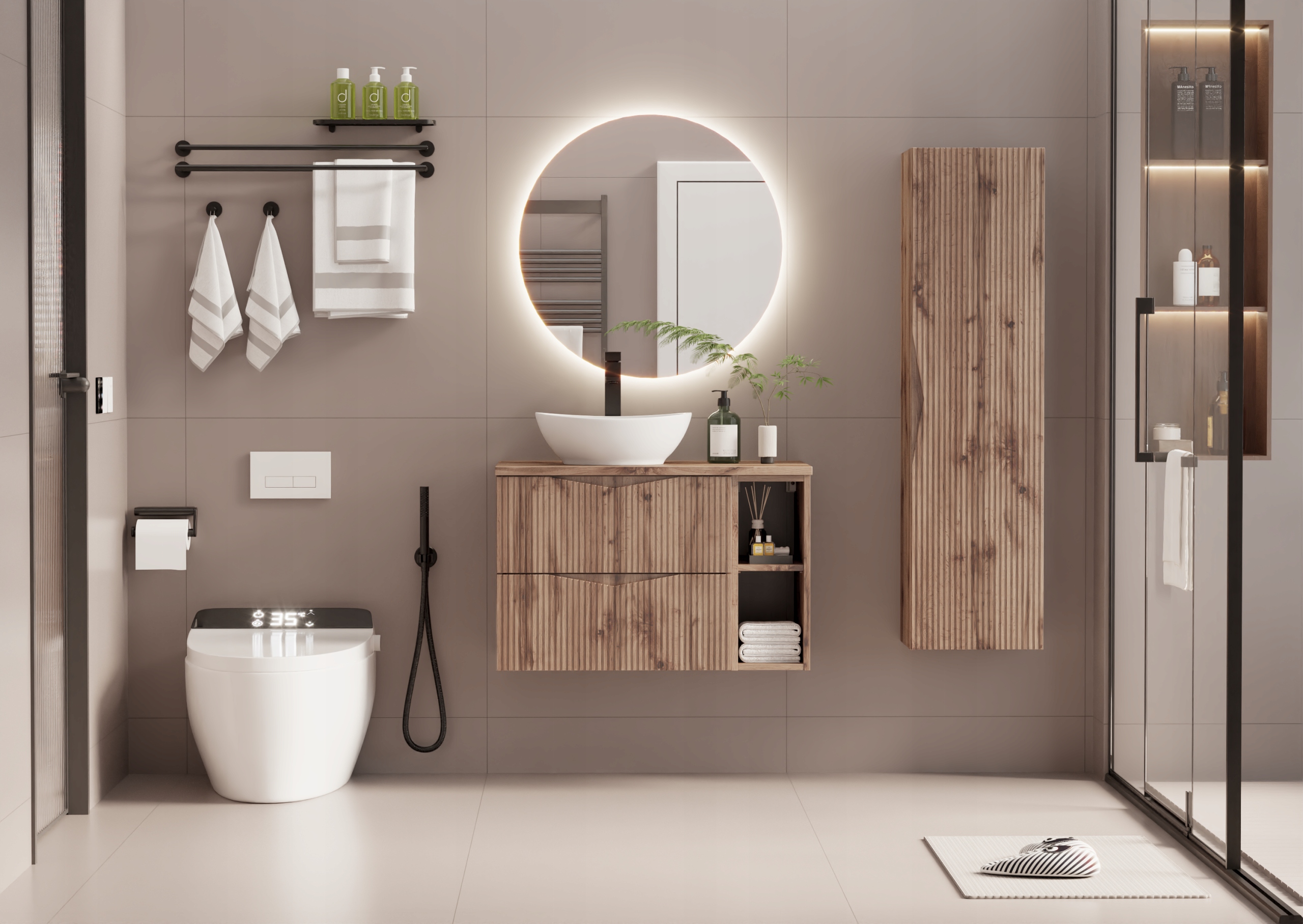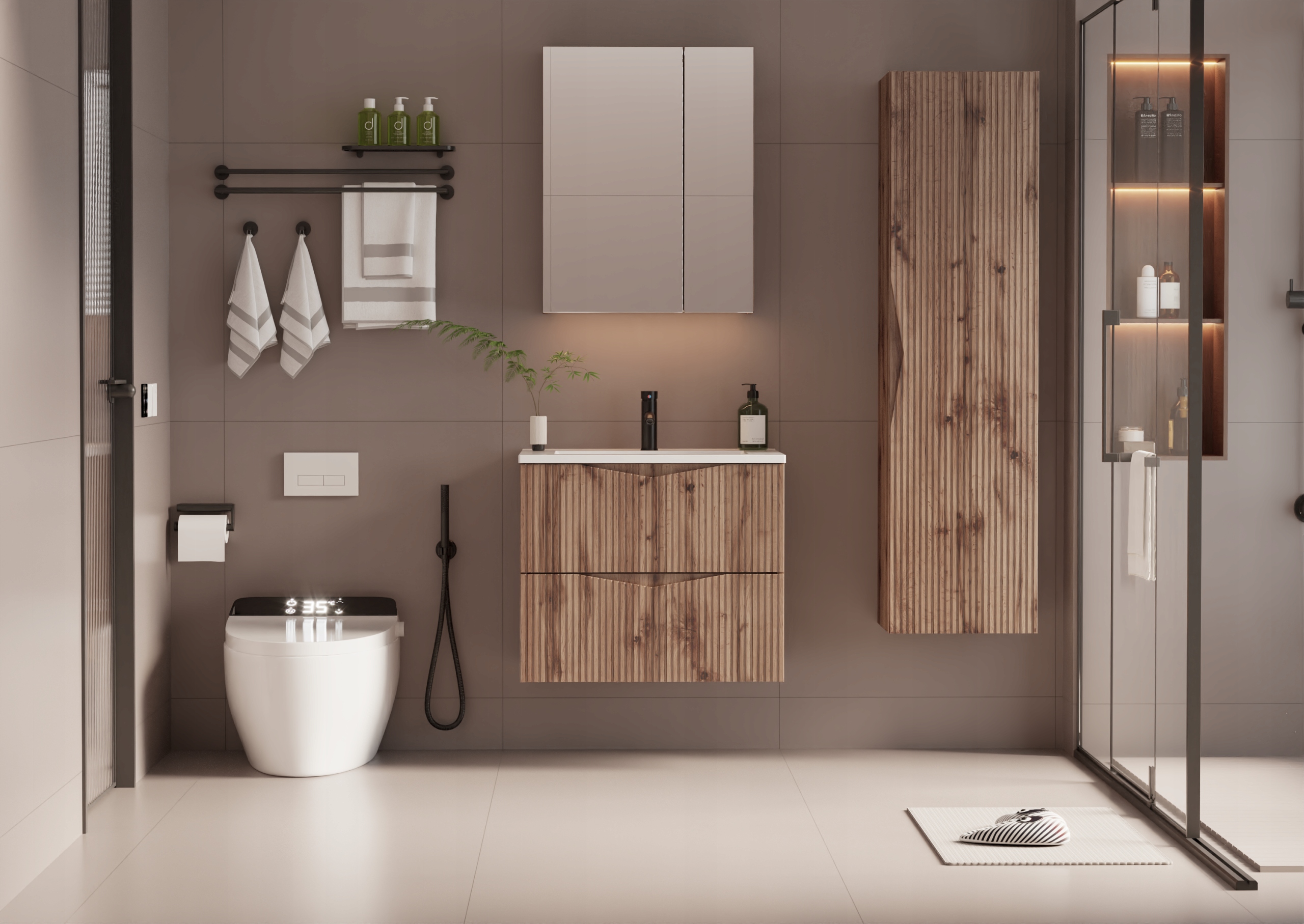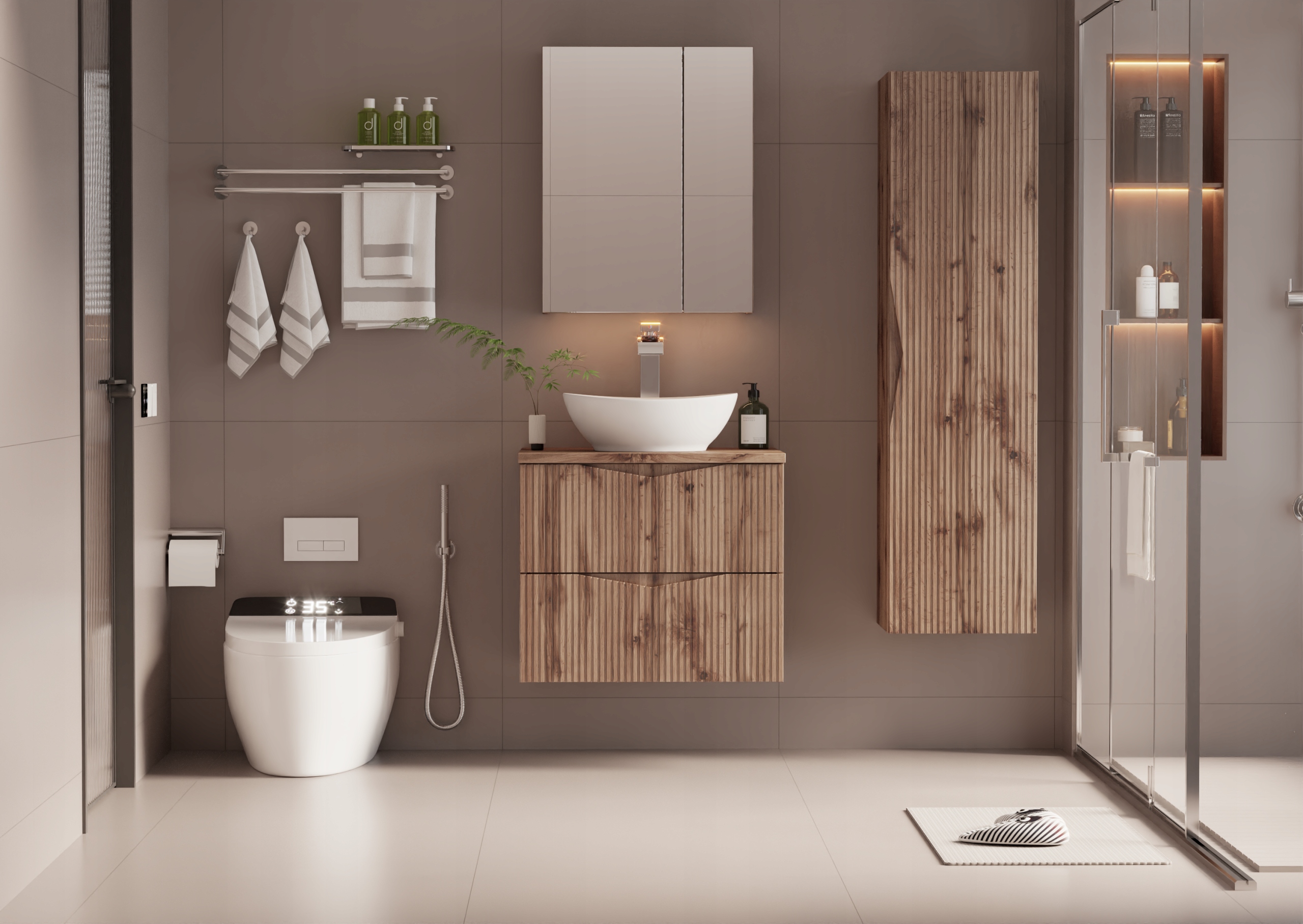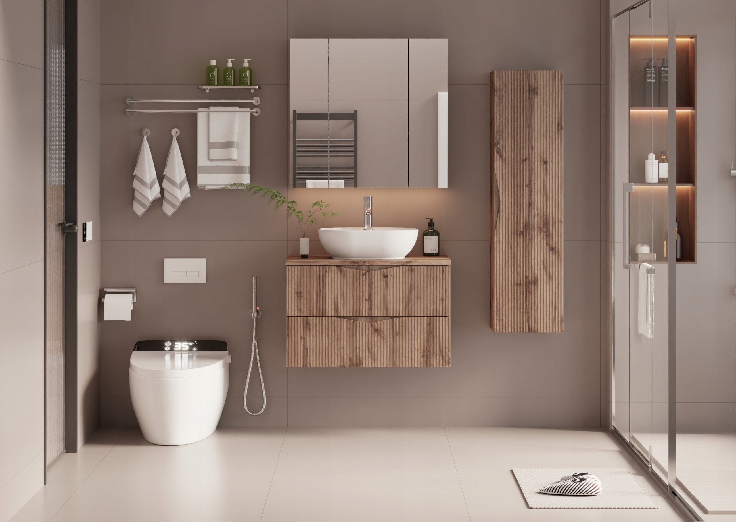 Wisząca forma mebla nadaje bryle lekkości i ułatwia utrzymanie czystości. To polska produkcja wykonana z certyfikowanych materiałów, dostarczana w paczkach do samodzielnego montażu wraz z kompletną instrukcją i zestawem okuć. Kolekcja CLEO w dekorze dąb wotan to propozycja dla osób, które cenią naturalne akcenty, funkcjonalność i minimalistyczny styl, a łącząc słupek z szafką pod umywalkę można stworzyć spójną i elegancką aranżację łazienki.