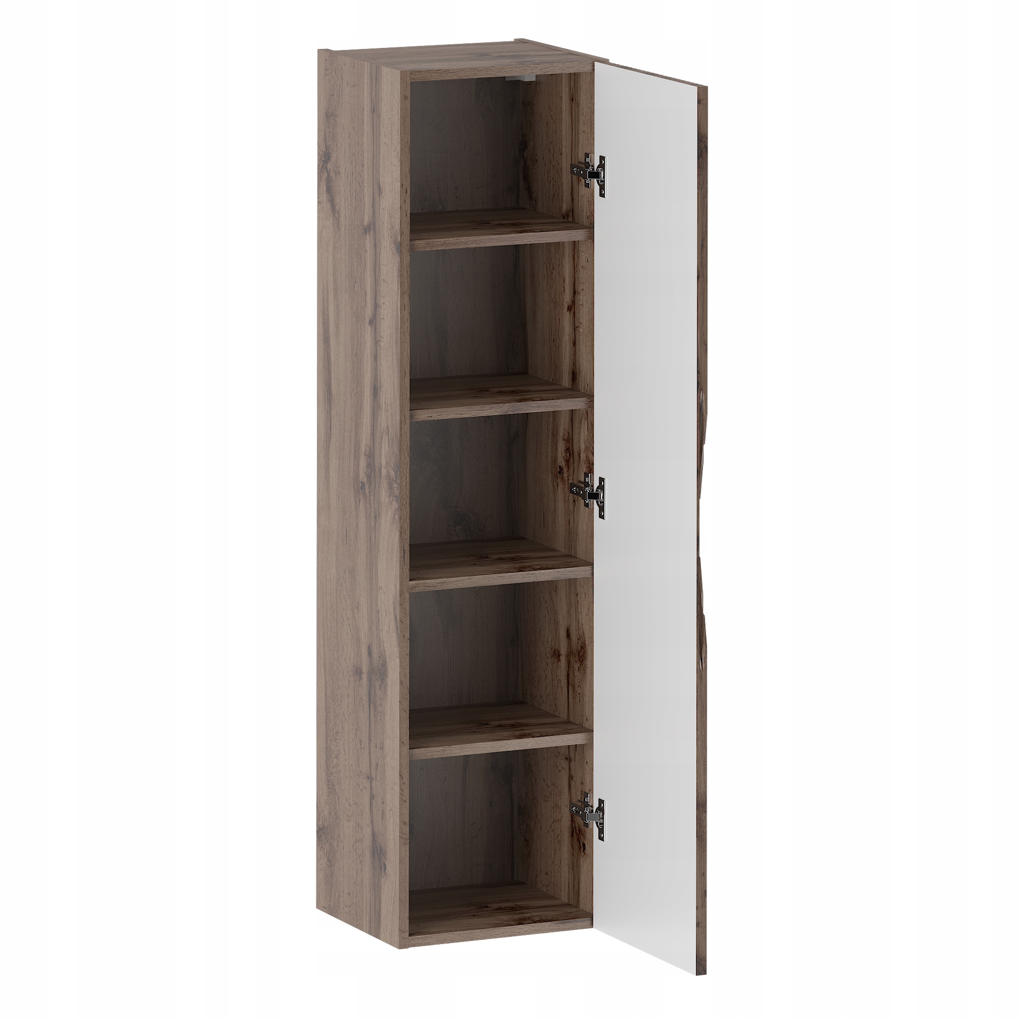 Wewnątrz mebla znajduje się cztery półki, które tworzą pięć praktycznych przestrzeni do przechowywania ręczników, kosmetyków i akcesoriów łazienkowych. Dzięki temu słupek nie tylko zdobi wnętrze, ale także zwiększa jego funkcjonalność. Drzwiczki z systemem cichego domykania oraz uniwersalny montaż P/L pozwalają dopasować mebel do indywidualnego układu łazienki. Korpus wykonano z laminowanej płyty wiórowej o grubości 16 mm wykończonej obrzeżem PCV, co zapewnia trwałość i odporność na codzienne użytkowanie.