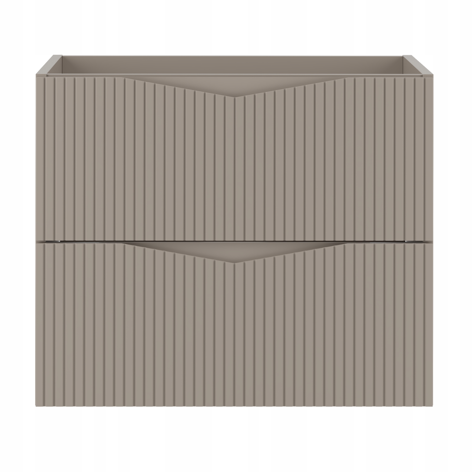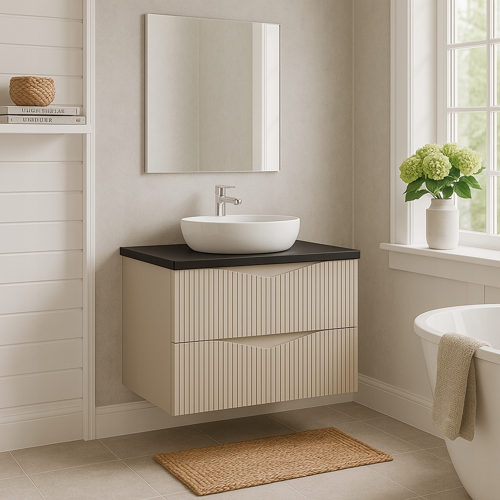 Szafka pod umywalkę z kolekcji CLEO w kolorze beż piaskowy z eleganckim blatem MDF w kolorze czarnym o grubości 2,2 cm to stylowe i funkcjonalne rozwiązanie do każdej łazienki. Kontrast między jasnym korpusem a ciemnym blatem podkreśla wyjątkowy charakter mebla i nadaje wnętrzu wyrazistości. Ryflowane fronty z frezowanym uchwytem wprowadzają minimalistyczną elegancję, a system cichego domykania gwarantuje wygodę podczas codziennego użytkowania.