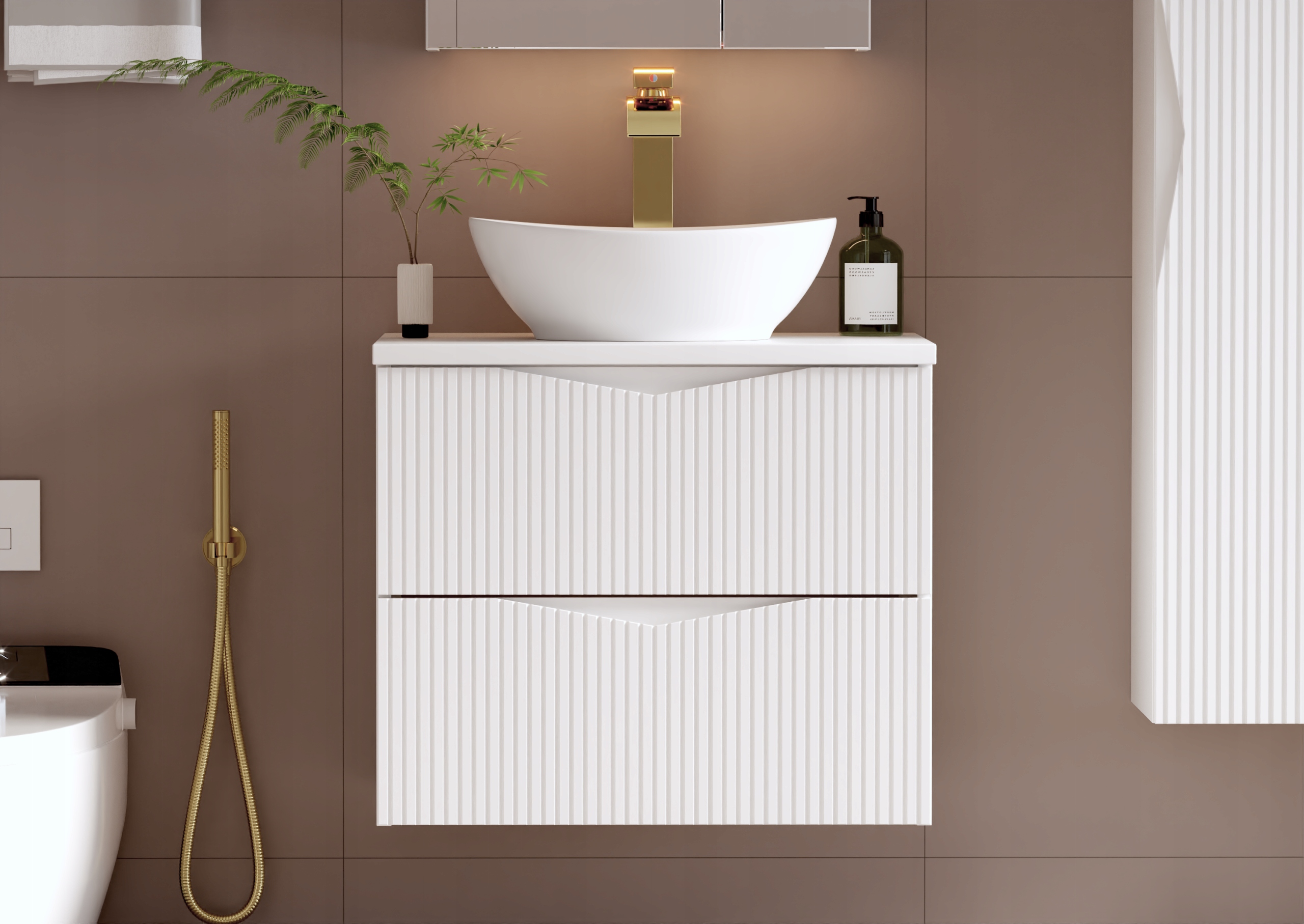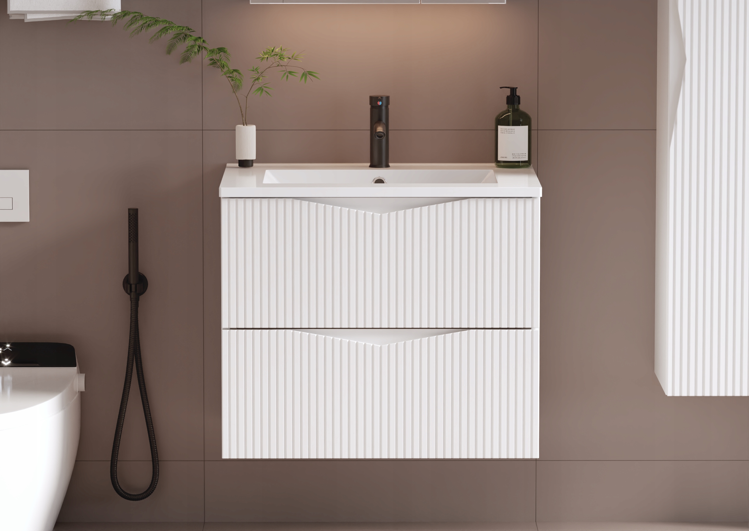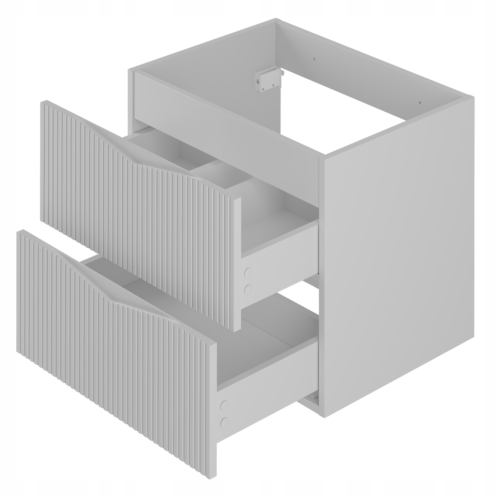 Szafka łazienkowa CLEO o szerokości 60 cm, wysokości 50 cm i głębokości 45,8 cm to połączenie minimalistycznego designu i funkcjonalności, które doskonale sprawdzi się w nowoczesnych wnętrzach. Białe ryflowane fronty z płyty MDF o grubości 18 mm nadają meblowi elegancji i lekkości, a frezowany uchwyt stanowi subtelny akcent dekoracyjny, który podkreśla wyjątkowy charakter kolekcji.