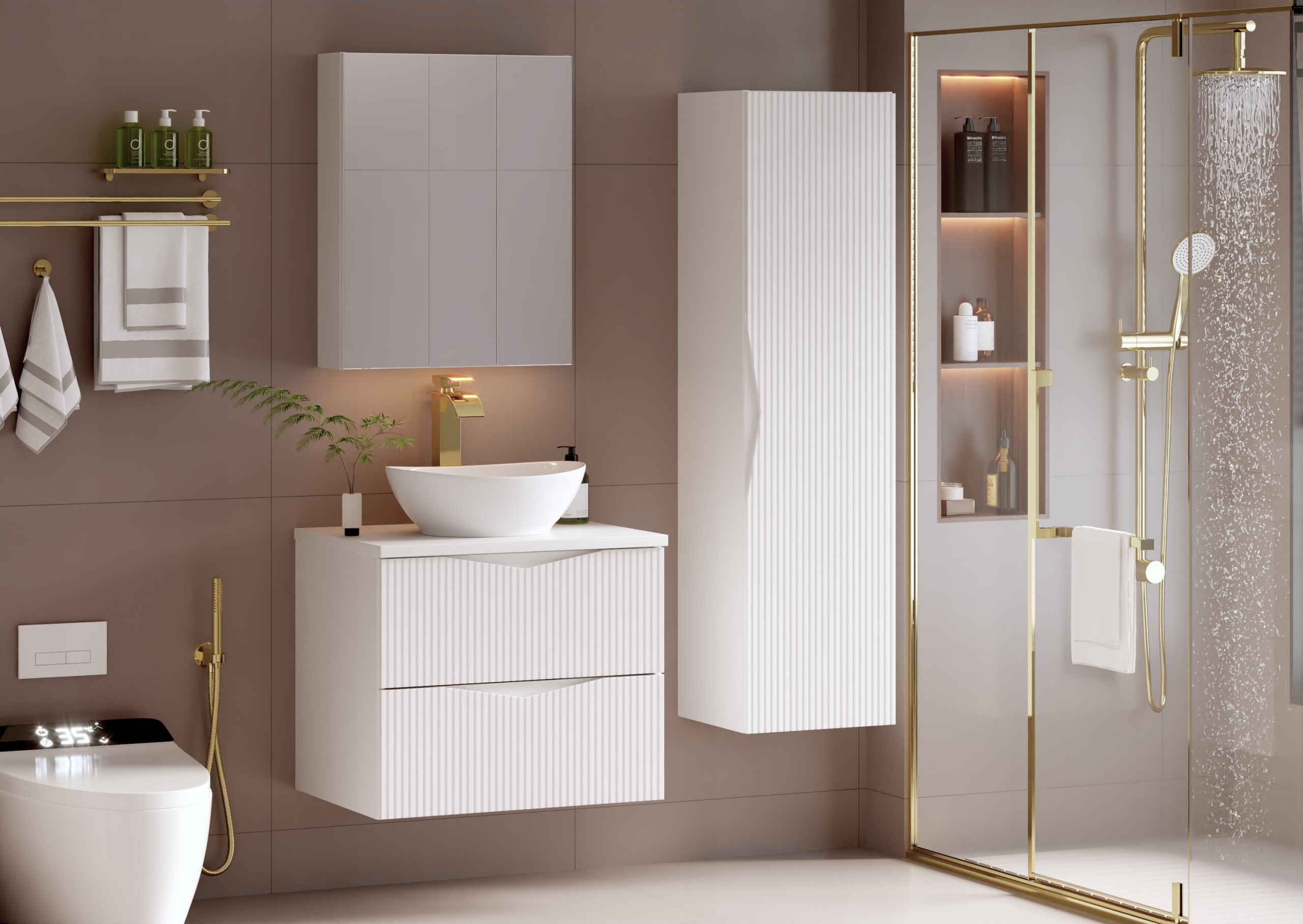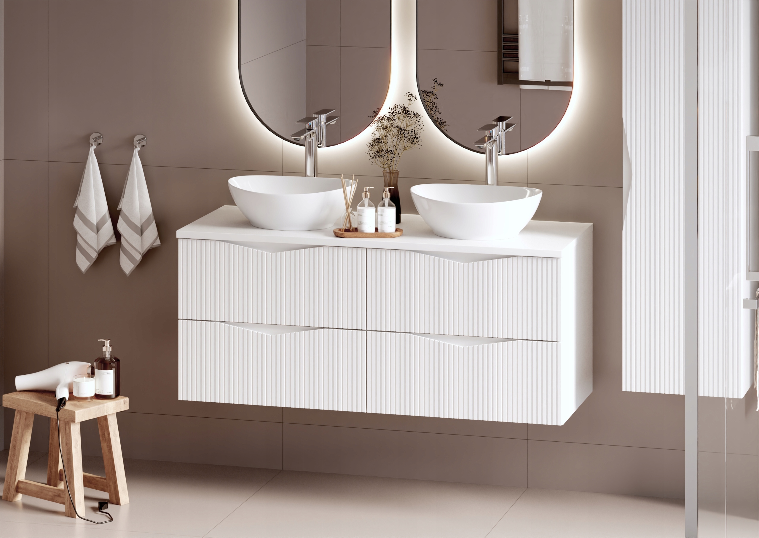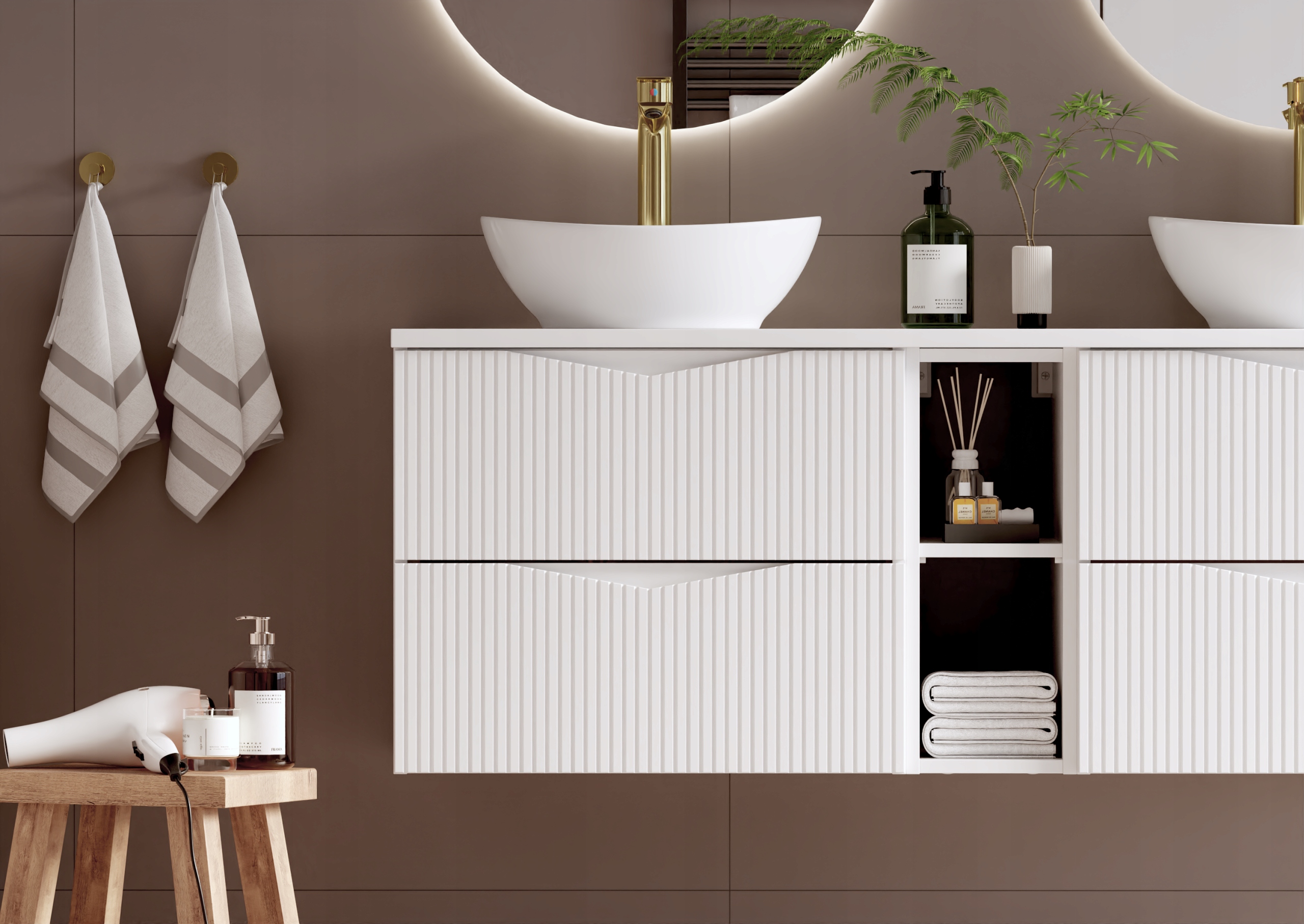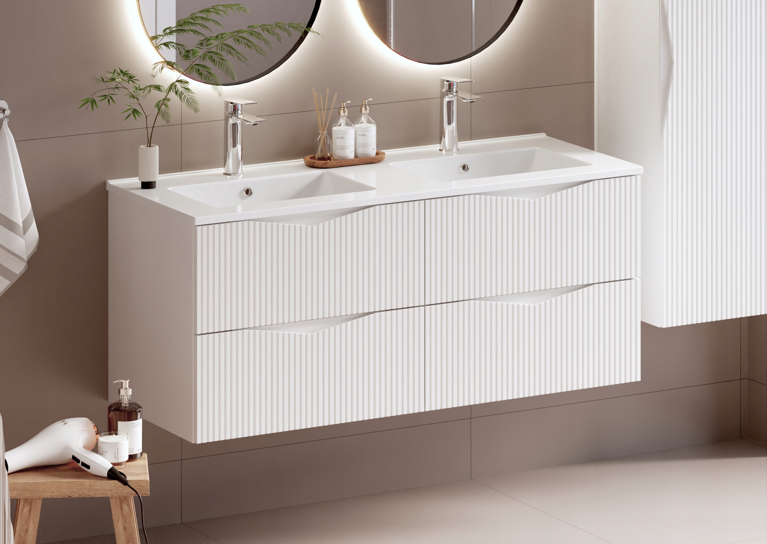 Szafka łazienkowa CLEO o szerokości 60 cm, wysokości 50 cm i głębokości 45,8 cm to połączenie minimalistycznego designu i funkcjonalności, które doskonale sprawdzi się w nowoczesnych wnętrzach. Białe ryflowane fronty z płyty MDF o grubości 18 mm nadają meblowi elegancji i lekkości, a frezowany uchwyt stanowi subtelny akcent dekoracyjny, który podkreśla wyjątkowy charakter kolekcji.