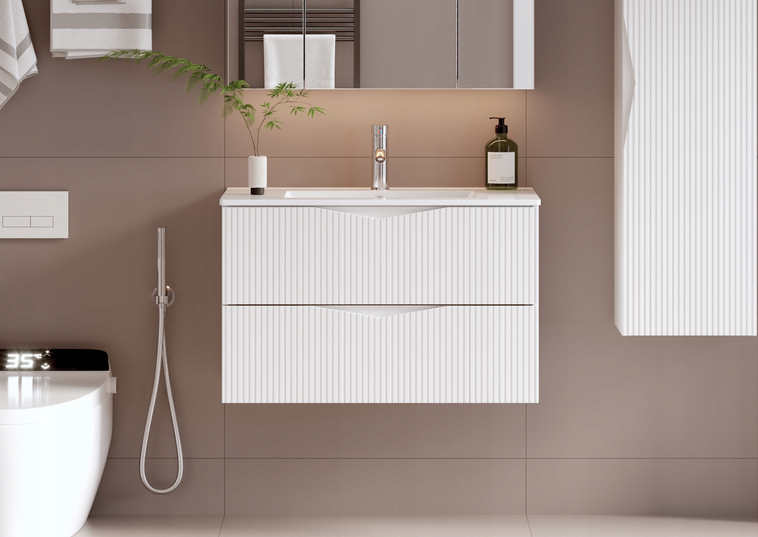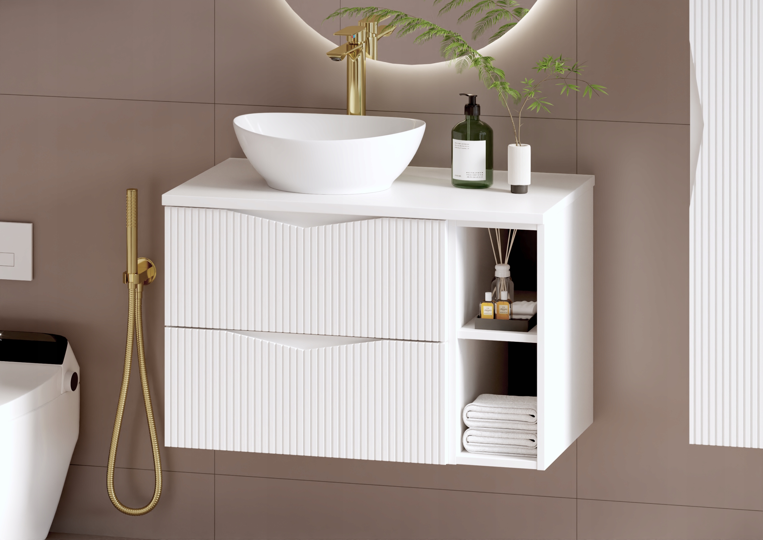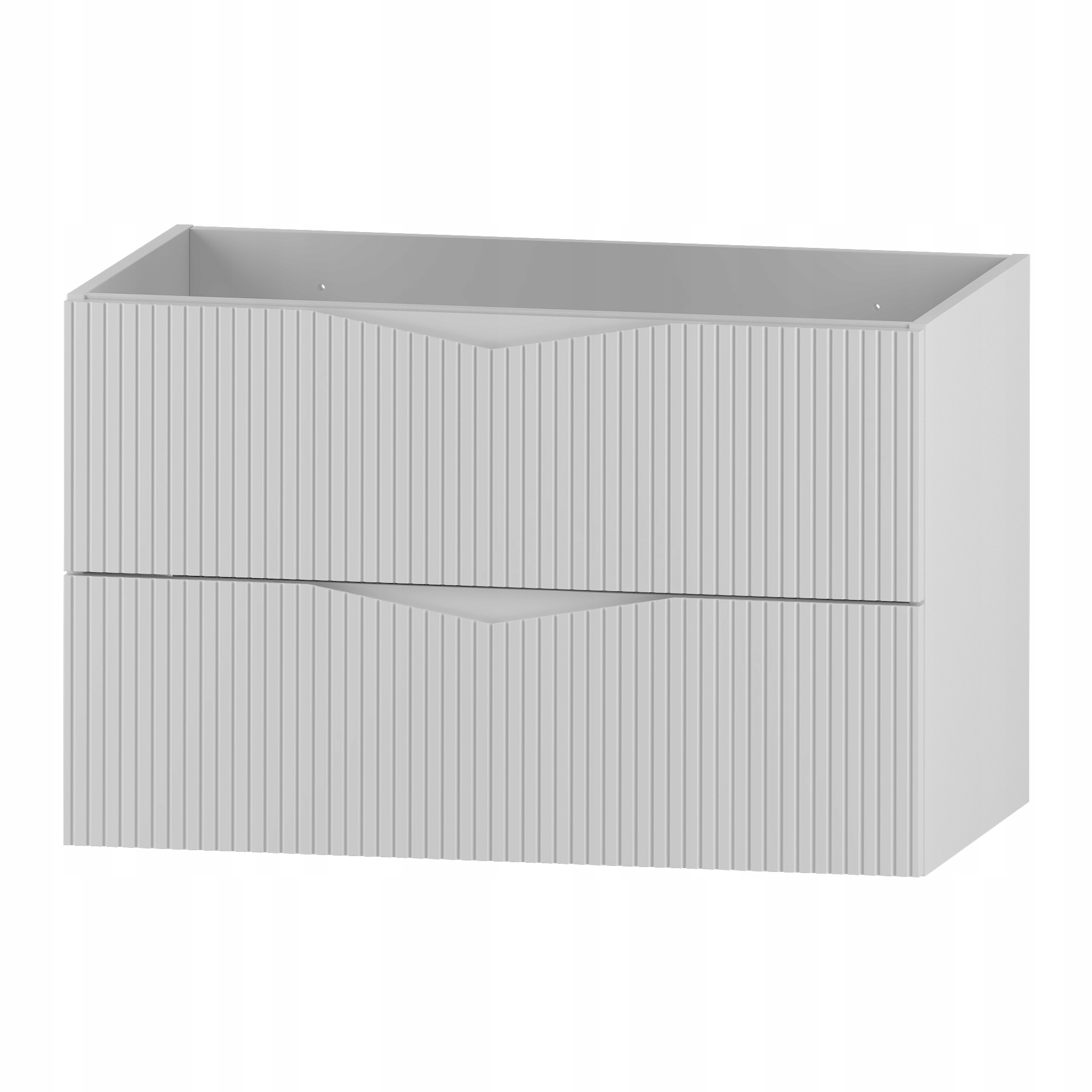 Szafka łazienkowa CLEO o szerokości 80 cm, wysokości 50 cm i głębokości 45,8 cm to nowoczesne rozwiązanie, które łączy funkcjonalność z eleganckim stylem. Białe ryflowane fronty wykonane z płyty MDF o grubości 18 mm podkreślają minimalistyczny charakter kolekcji, a frezowany uchwyt nadaje meblowi subtelnej oryginalności i zapewnia wygodę codziennego użytkowania.