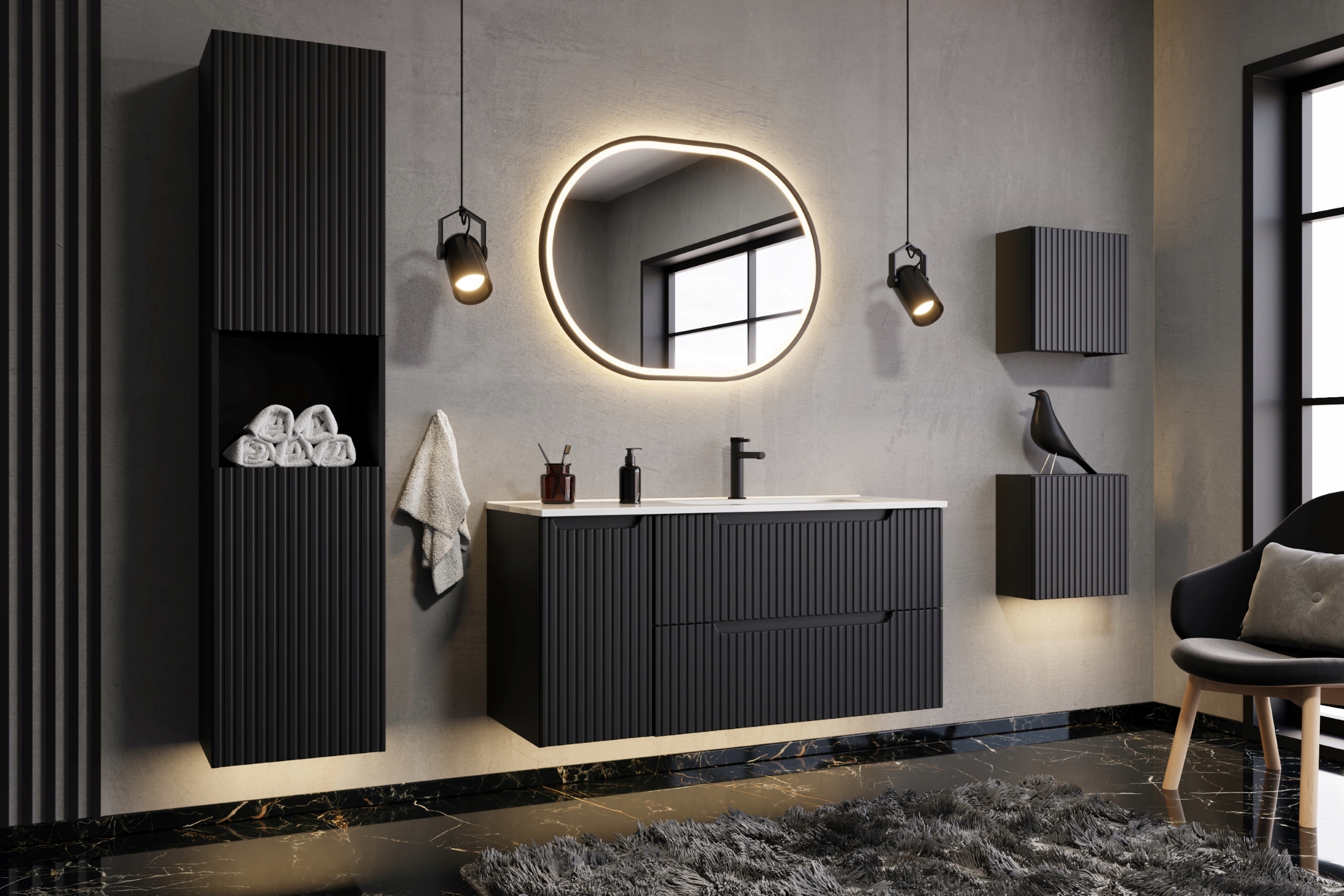 Szafka wisząca z kolekcji NOVA BLACK w kwadratowej formie to stylowe i funkcjonalne rozwiązanie dla nowoczesnych łazienek. Z pojedynczymi drzwiami, frontami ozdobionymi subtelnym ryflowaniem oraz eleganckim frezowanym uchwytem, wprowadza do wnętrza luksusowy akcent, idealnie komponując się z minimalistycznym designem.