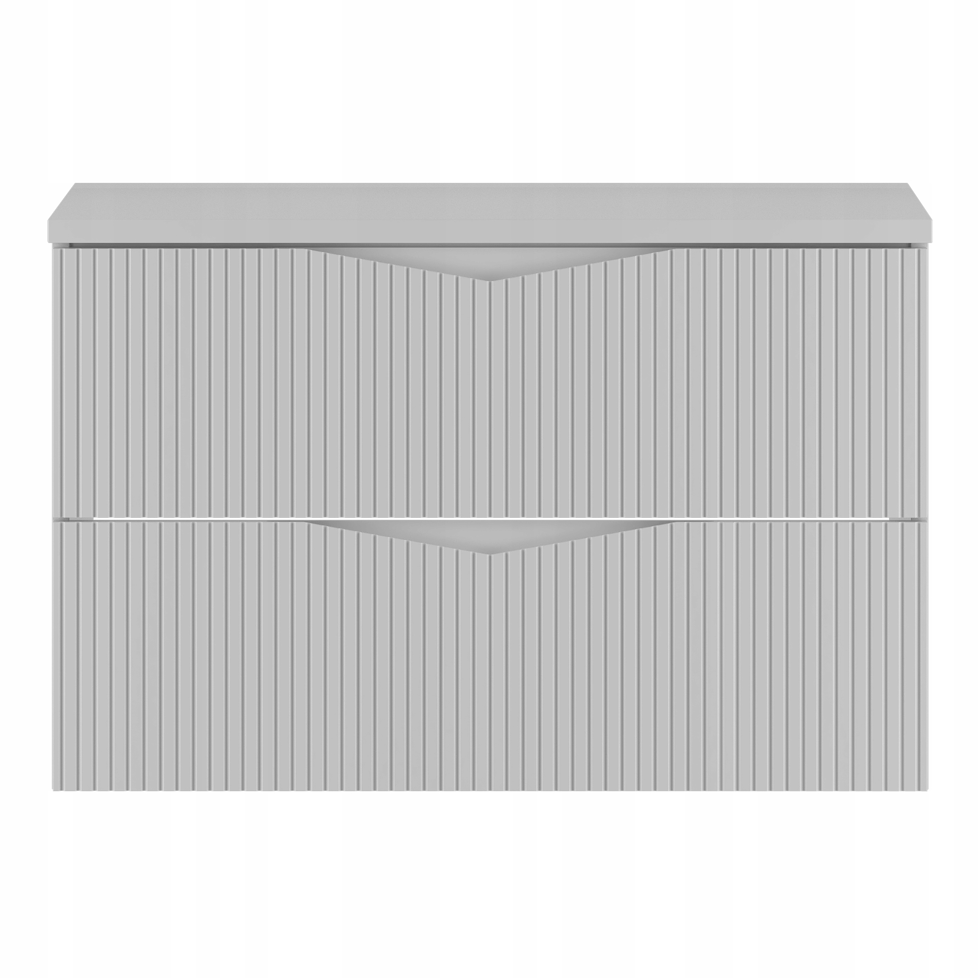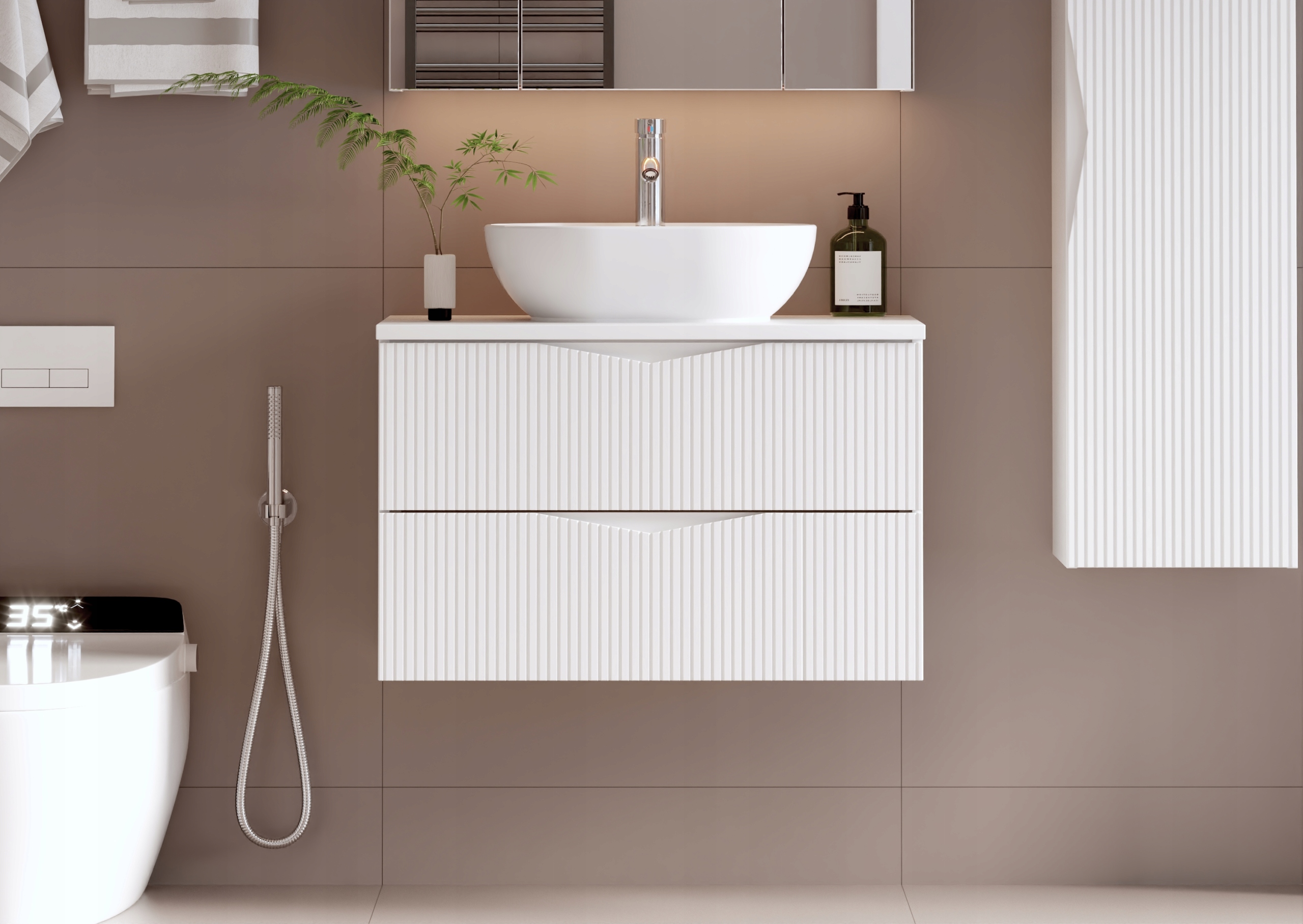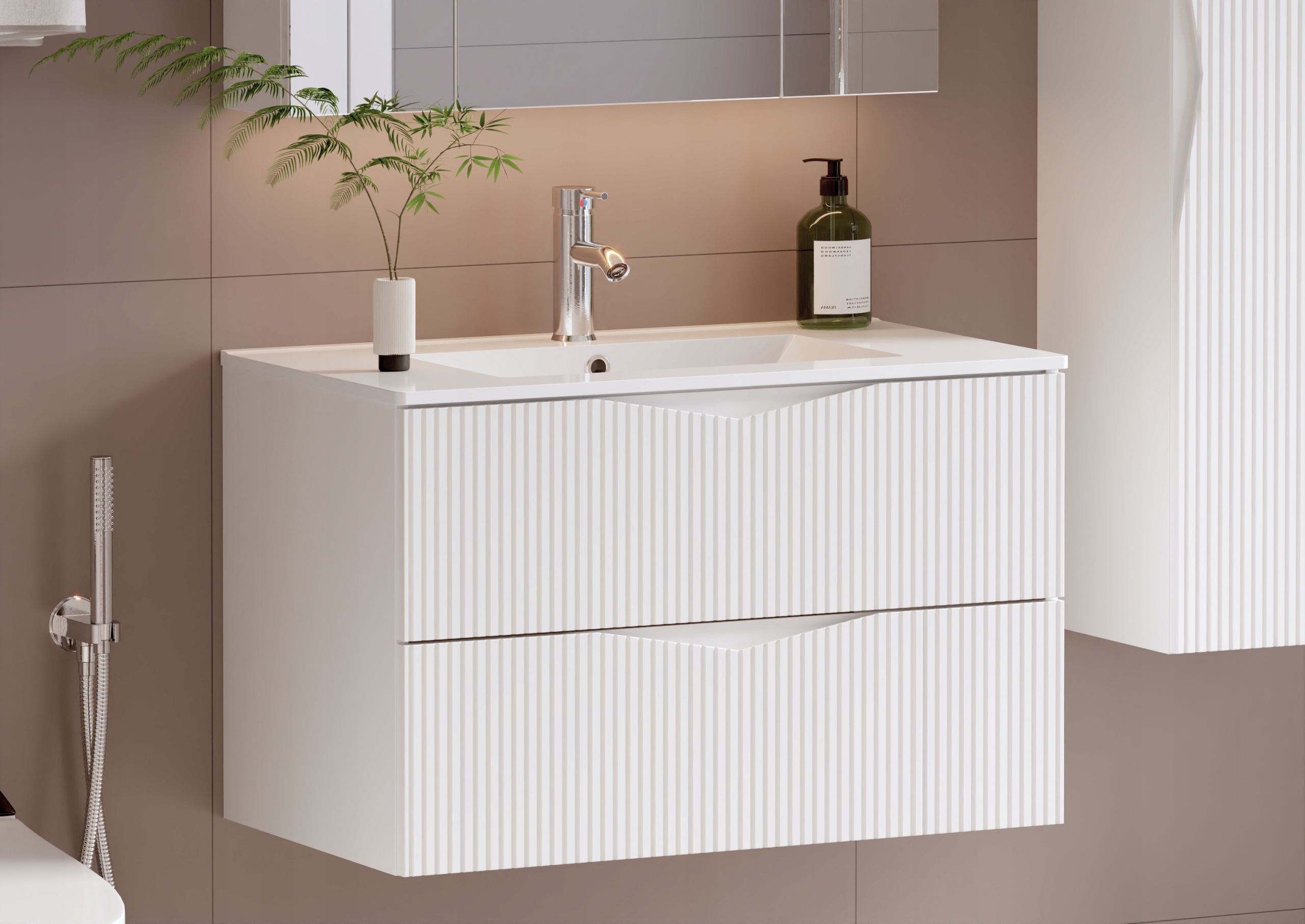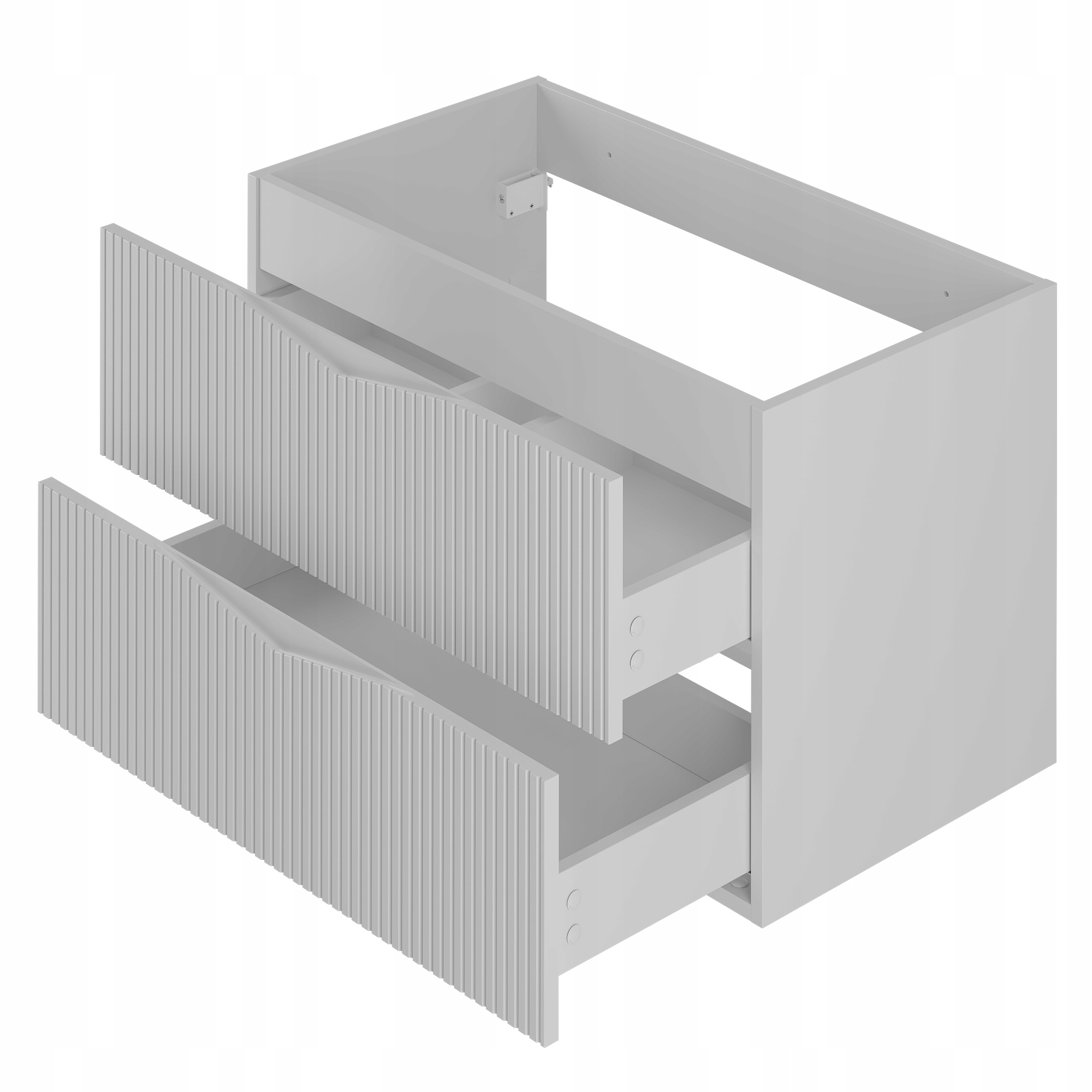 Szafka łazienkowa CLEO o szerokości 80 cm z dopasowanym blatem MDF o grubości 2,2 cm to eleganckie i funkcjonalne rozwiązanie do nowoczesnej łazienki. Ryflowane fronty wykonane z płyty MDF o grubości 18 mm podkreślają unikalny charakter kolekcji, a zintegrowany frezowany uchwyt nadaje całości minimalistycznego stylu i zapewnia wygodę codziennego użytkowania. Dwie pojemne szuflady zaprojektowane z wycięciem na syfon gwarantują maksymalne wykorzystanie przestrzeni, a prowadnice dolnego montażu marki Hafele w połączeniu z systemem cichego domykania sprawiają, że korzystanie z mebla jest komfortowe i ciche.
