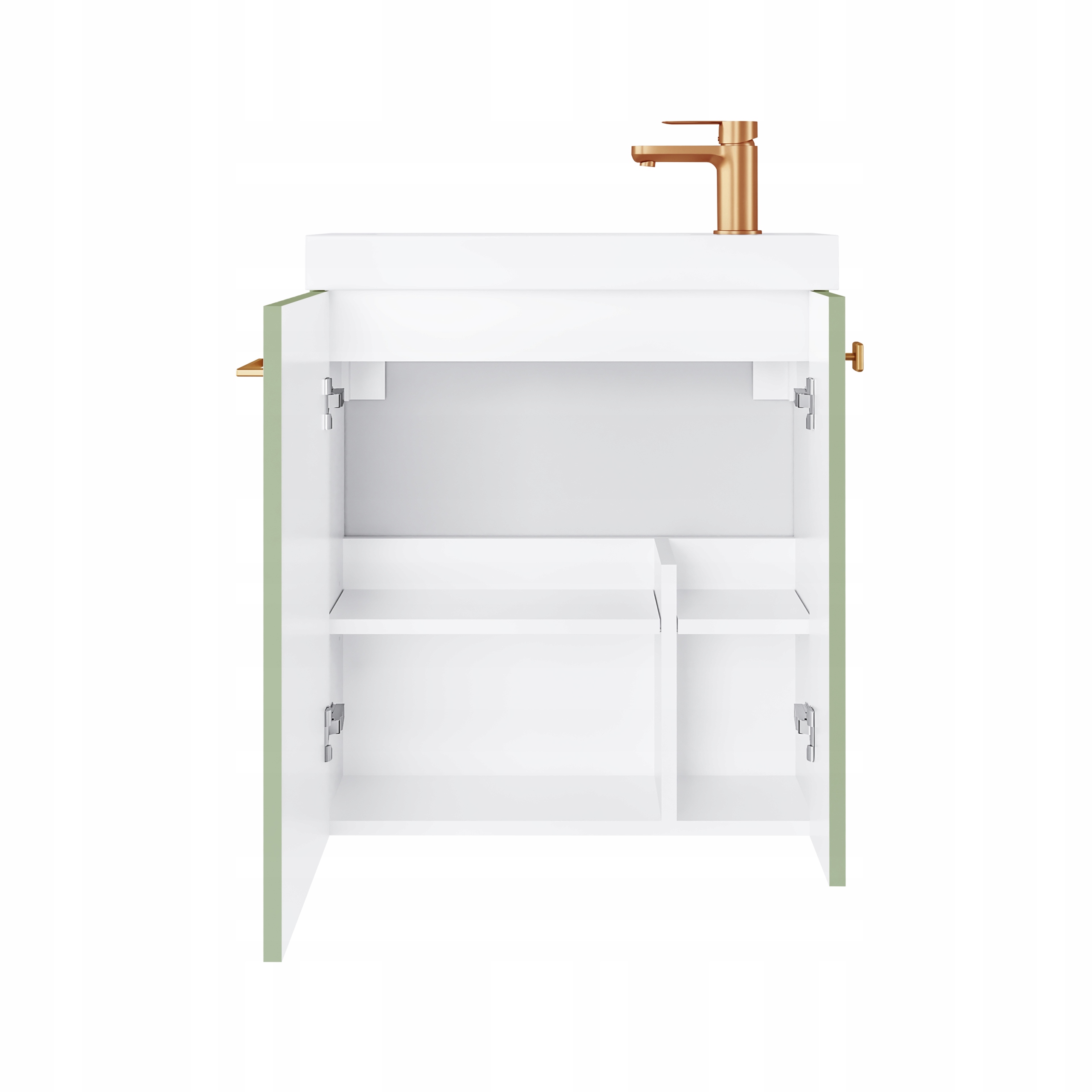 Szafka NOOK 55 w kolorze szałwiowym to elegancka propozycja do nowoczesnych łazienek, w których liczy się harmonia i funkcjonalność w kompaktowym formacie. Matowa, lakierowana powierzchnia w delikatnym odcieniu zieleni wprowadza do wnętrza spokojny i świeży klimat, a uchwyt w ciepłym, miedzianym odcieniu dodaje całości stylowego wyrazu i delikatnego blasku. Frezowany front z systemem cichego domyku nadaje szafce wyjątkowego charakteru, a jego subtelna forma podkreśla elegancki, minimalistyczny styl kolekcji. Zestaw uzupełnia ultracienka umywalka ceramiczna Slim-Line w białym połysku, która idealnie dopełnia wizualnie lekką bryłę mebla. Dzięki podziałowi na dwie niezależne strefy – prywatną i gościnną – szafka umożliwia wygodne przechowywanie najpotrzebniejszych akcesoriów, a miedziany uchwyt może pełnić również funkcję praktycznego wieszaka na ręcznik. Produkt dostarczany jest jako zmontowany zestaw, gotowy do instalacji, i został wyprodukowany w Polsce. Zestaw nie zawiera baterii.