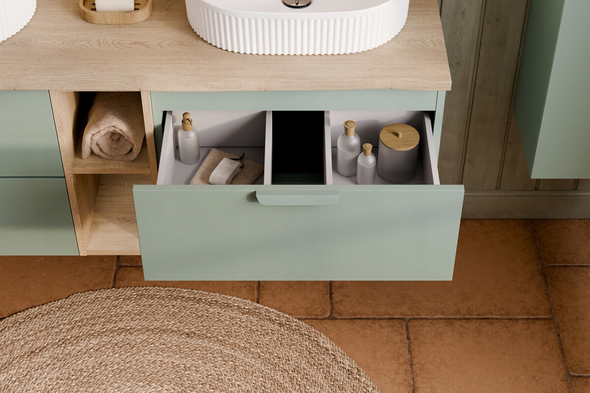 Kolekcja ASTER GREEN łączy głęboki, matowy odcień zieleni z naturalnym dekorem Dąb Cremona. Gładkie fronty podkreślają minimalistyczny charakter brył, a drewniany blat i regały wprowadzają ciepły, kontrastowy akcent. To propozycja do nowoczesnych łazienek, w których liczy się wyrazisty kolor i spójna zabudowa.