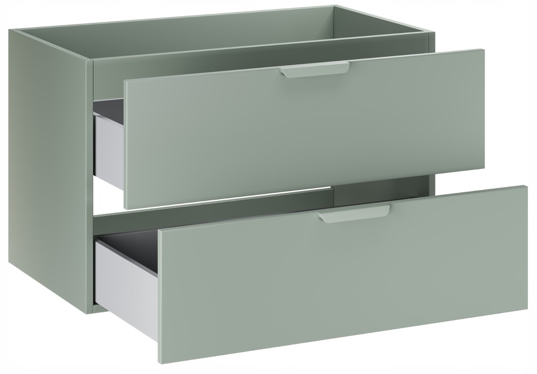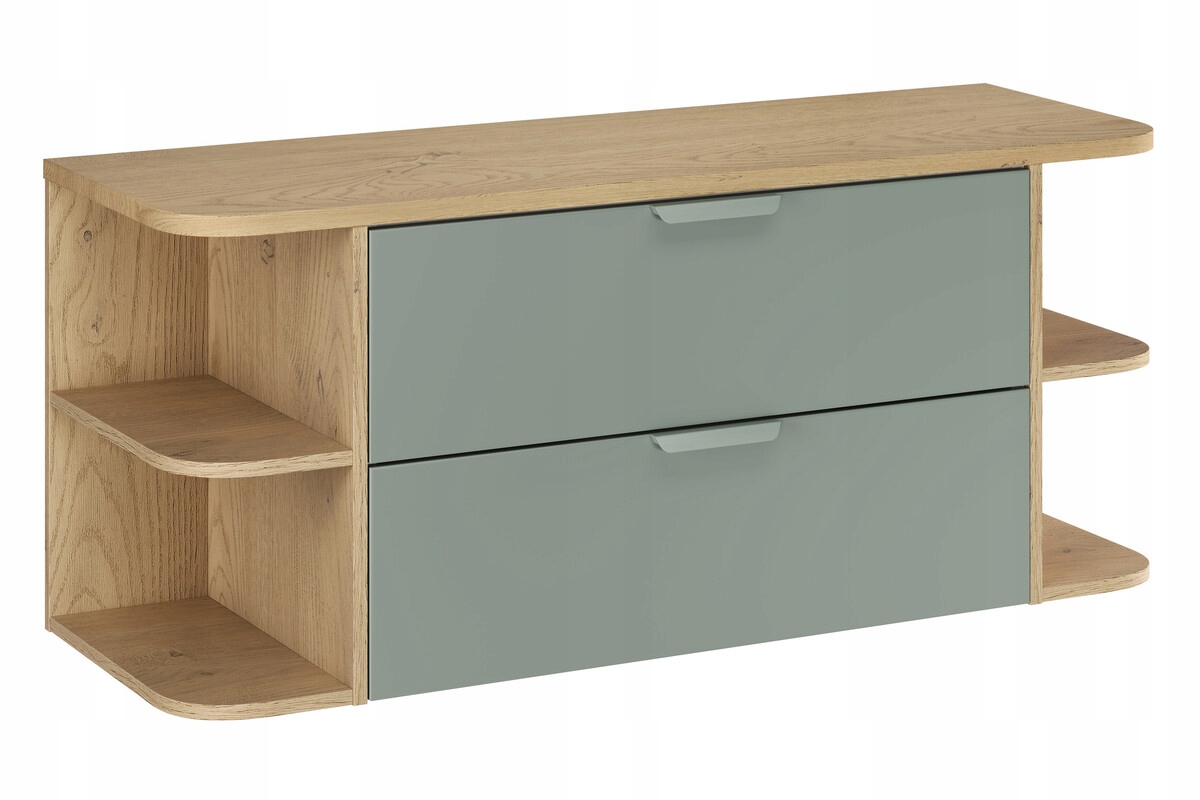 Korpus i fronty wykonane są z płyty laminowanej w kolorze Zielony Mat, regały z płyty laminowanej w dekorze Dąb Cremona, natomiast blat z płyty MDF. System cichego domykania zwiększa komfort codziennego użytkowania. Całość przeznaczona jest do montażu wiszącego. Bateria, syfon oraz click-clack nie są częścią zestawu. Zaleca się unikanie długotrwałego kontaktu powierzchni z wodą oraz regularne wycieranie wilgoci.