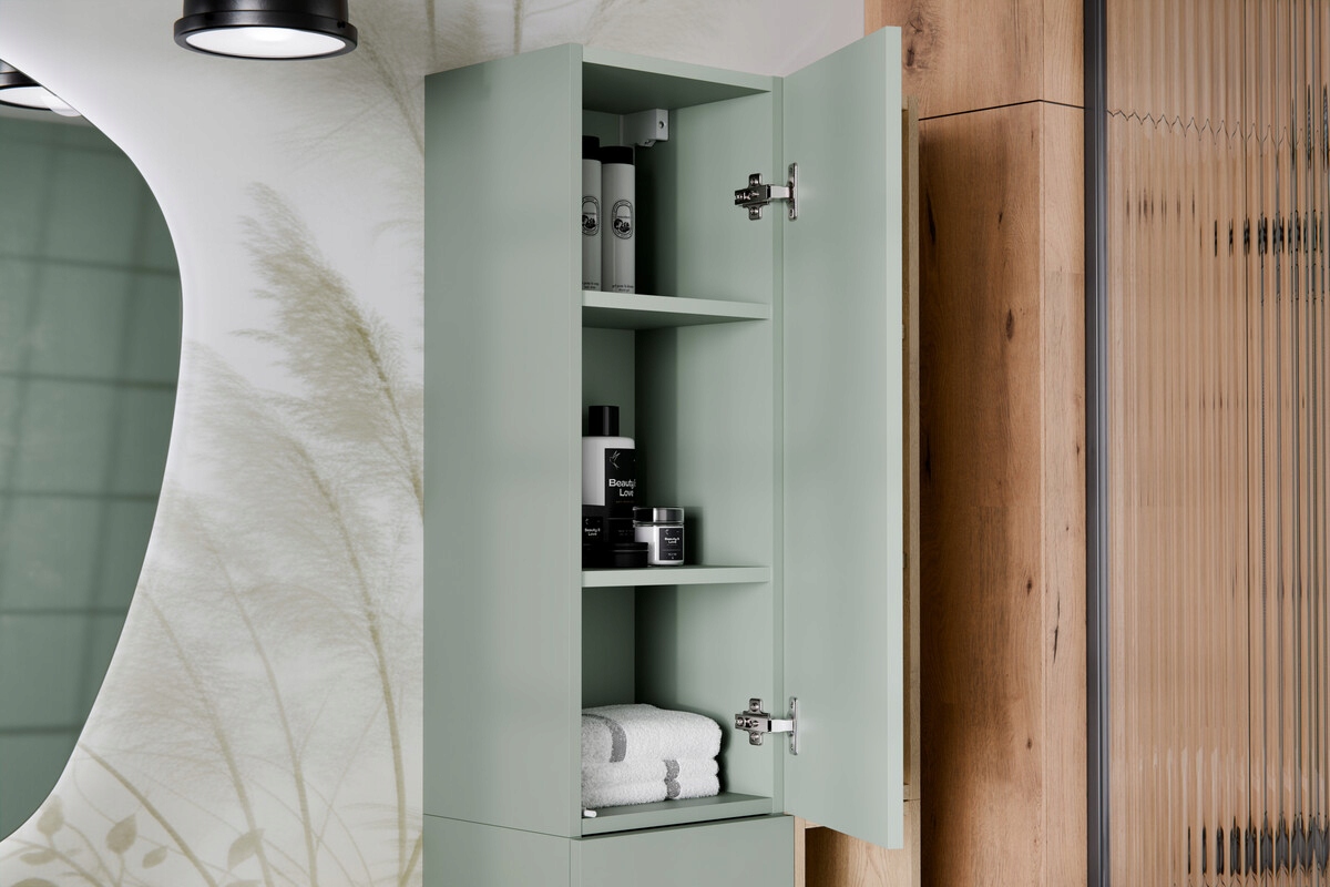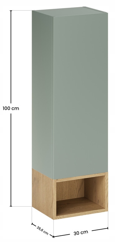 Zestaw o szerokości 30 cm tworzy pionową, kompaktową zabudowę. Składa się z półsłupka o szerokości 30 cm oraz regału górnego montowanego nad nim. Elementy można zamontować razem jako wysoką kolumnę lub rozdzielić i wykorzystać w różnych częściach łazienki, dopasowując układ do indywidualnych potrzeb przestrzeni. Półsłupek wyposażony jest w system otwierania push to open oraz zawiasy z cichym domykiem, które zapewniają komfort codziennego użytkowania. Wewnątrz znajdują się trzy wnęki do przechowywania, natomiast regał z jedną otwartą wnęką stanowi praktyczne miejsce na podręczne akcesoria.