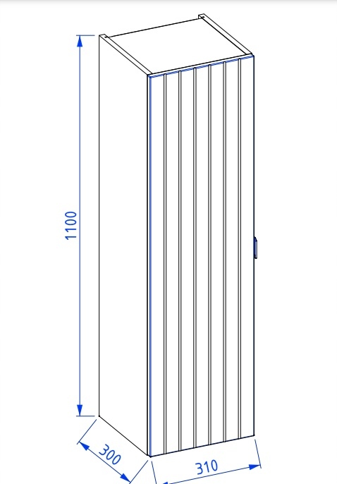 Szerokość – 31 cm, wysokość – 110 cm, głębokość – 30 cm. Korpus i front w zielonym półmacie, lakierowane. Uchwyty metalowe w trzech wariantach kolorystycznych.