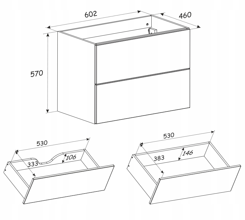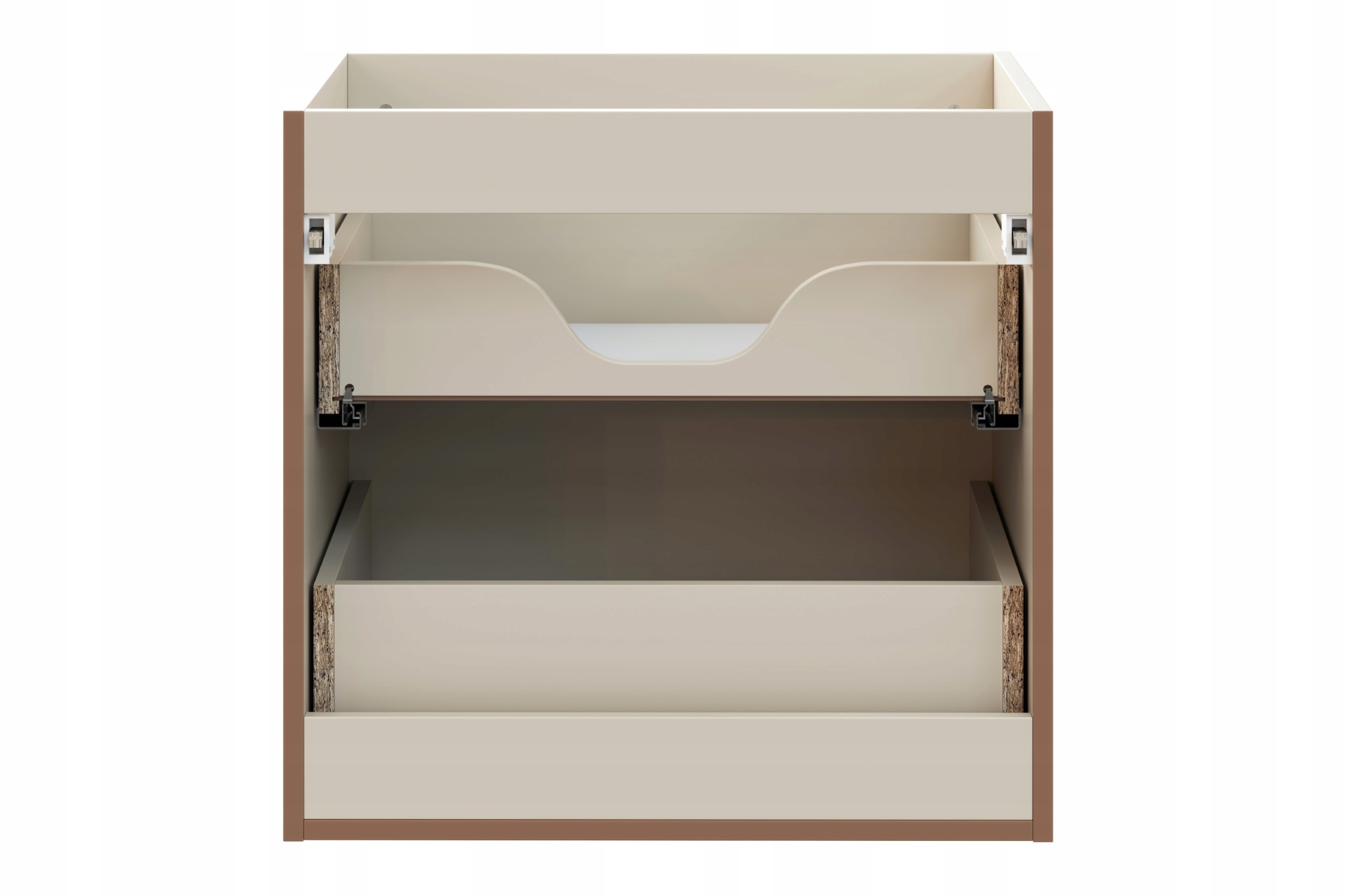 Wisząca szafka pod umywalkę o szerokości 60 cm została zaprojektowana tak, aby łączyć estetykę z praktycznymi rozwiązaniami. Dwie pojemne szuflady z systemem cichego domyku zapewniają wygodne przechowywanie codziennych akcesoriów, a głębokość mebla pozwala na efektywne wykorzystanie przestrzeni. Całość dopełniają złote, metalowe gałki, które dodają bryle lekkości i szlachetnego wykończenia.