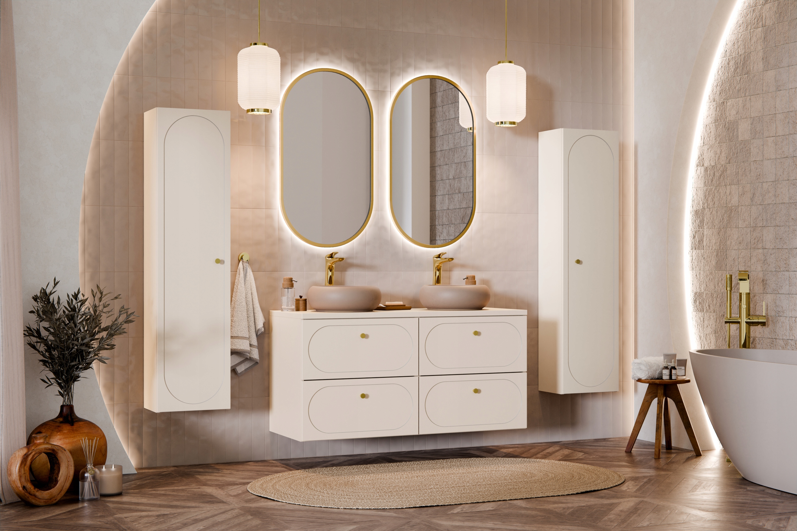 Donna Sand to kolekcja, która wnosi do łazienki miękką elegancję i poczucie harmonii. Subtelna forma, delikatnie frezowane fronty i zaokrąglone krawędzie nadają meblom kobiecego charakteru i klasy. Beż piaskowy to kolor pełen ciepła i uniwersalności – świetnie komponuje się zarówno z jasnymi, jak i ciemniejszymi dodatkami, wprowadzając przytulny, ponadczasowy klimat.
