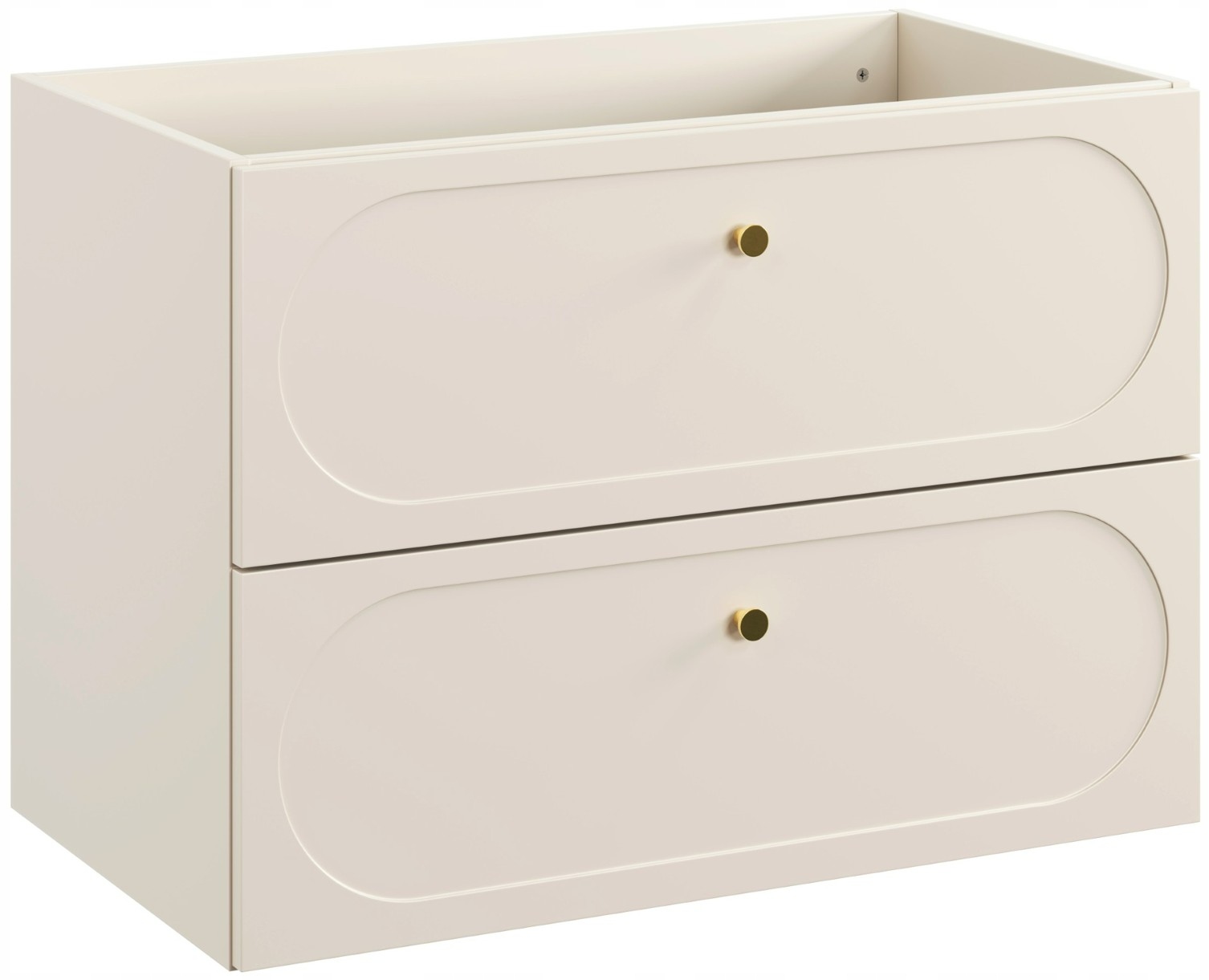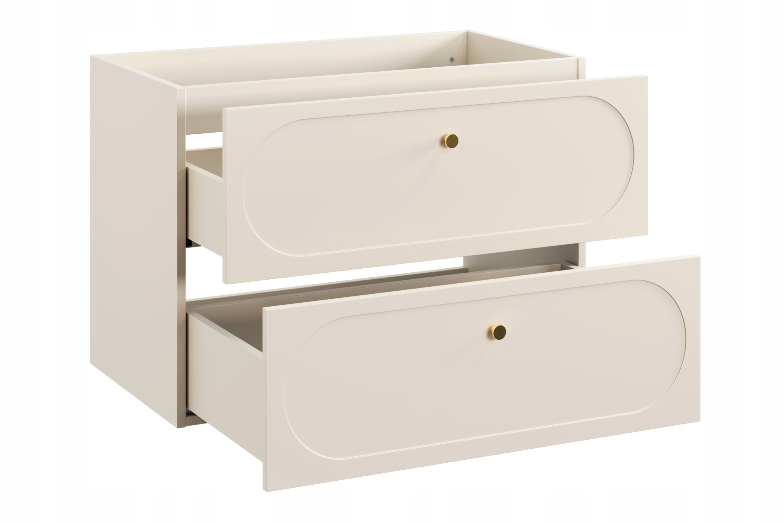 Szafka o szerokości 80 cm to nie tylko efektowny wygląd, ale też funkcjonalność. Dwie pojemne szuflady zapewniają wygodę codziennego użytkowania, a system cichego domyku dba o komfort i płynność ruchu. Całość uzupełniają złote, metalowe gałki, które wprowadzają subtelny akcent elegancji i świetnie kontrastują z matową powierzchnią frontów.