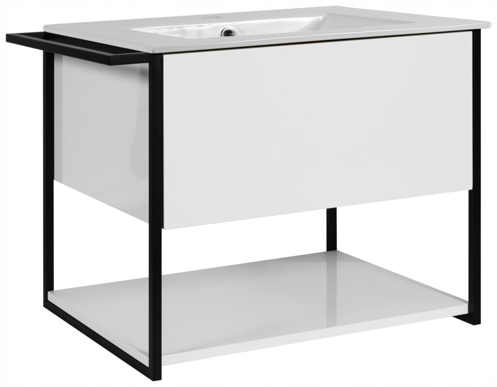 Duża szafka pod umywalkę LOV o szerokości osiemdziesięciu centymetrów to funkcjonalne i stylowe rozwiązanie do przestronnych łazienek. Lśniące, lakierowane fronty i korpus w kolorze białym połysk nadają aranżacji świeżości i elegancji, a czarne metalowe dodatki – w tym boczna rama oraz wieszak – podkreślają nowoczesny, industrialny charakter całej kolekcji. Dwie pojemne szuflady z systemem push-to-open zapewniają wygodny i bezuchwytowy dostęp do przechowywanych kosmetyków i akcesoriów, a dzięki metalowemu organizerowi łatwo utrzymać porządek wewnątrz mebla. Otwarte miejsce pod szufladami idealnie sprawdza się jako przestrzeń na ręczniki lub dekoracje. Lekka forma zawieszanej konstrukcji nie tylko ułatwia codzienne sprzątanie, ale też wprowadza wizualną lekkość do wnętrza. Całość uzupełnia ceramiczna umywalka wpuszczana w odcieniu białego połysku – trwała, estetyczna i łatwa w pielęgnacji. Szafka została wyposażona w wysokiej jakości prowadnice Hettich Quadro, a do zestawu dołączono praktyczny wieszak, który można zamontować z lewej lub prawej strony. Produkt przeznaczony jest do samodzielnego montażu i został w całości wyprodukowany w Polsce.