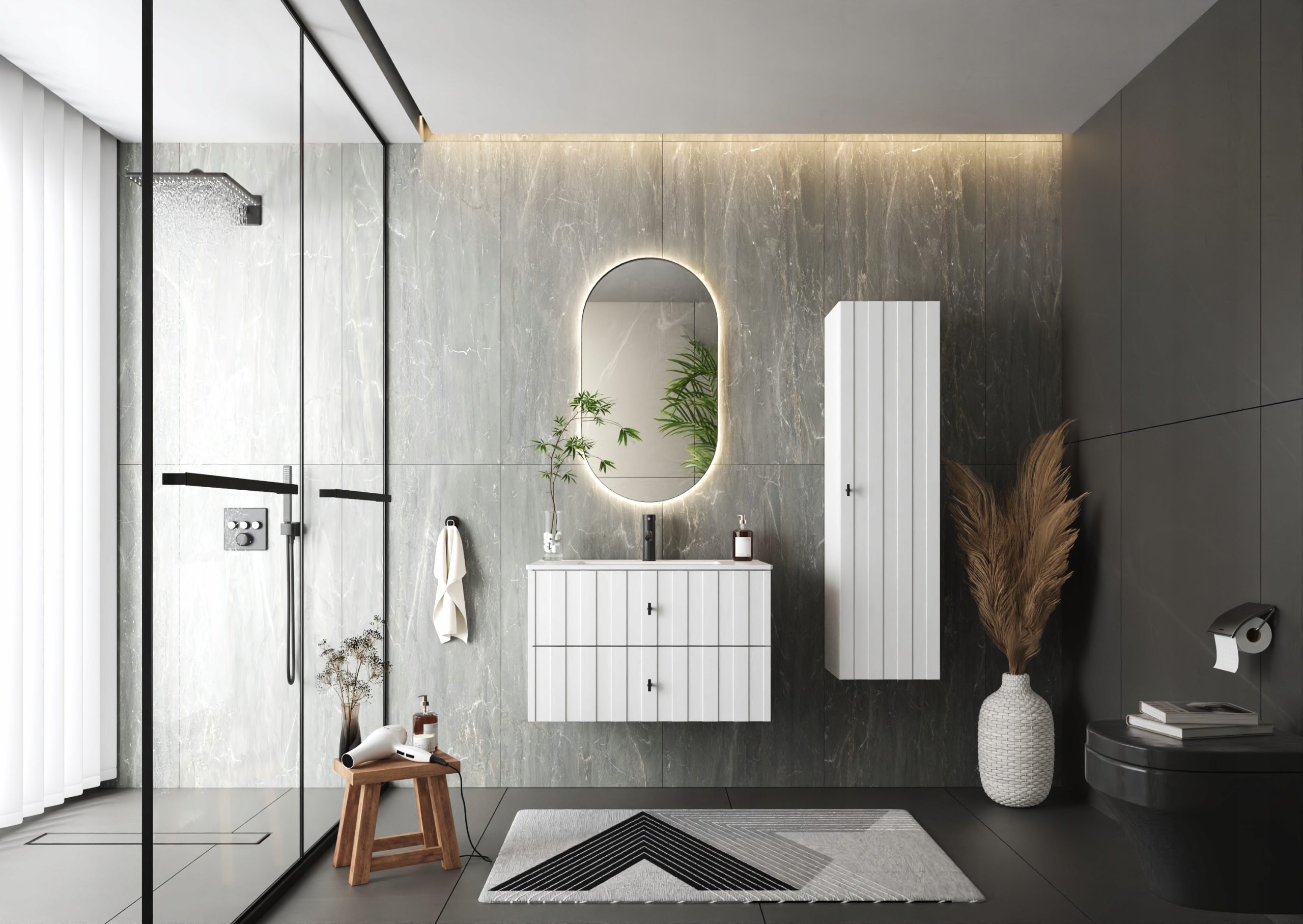 Kolekcja ELEGANTE to nowoczesne meble łazienkowe wyróżniające się minimalistycznym designem i eleganckimi detalami. Białe matowe fronty wprowadzają do wnętrza świeżość i lekkość, a złote uchwyty dodają całości luksusowego charakteru. To harmonijne połączenie sprawia, że meble ELEGANTE świetnie pasują zarówno do wnętrz klasycznych, jak i nowoczesnych.
