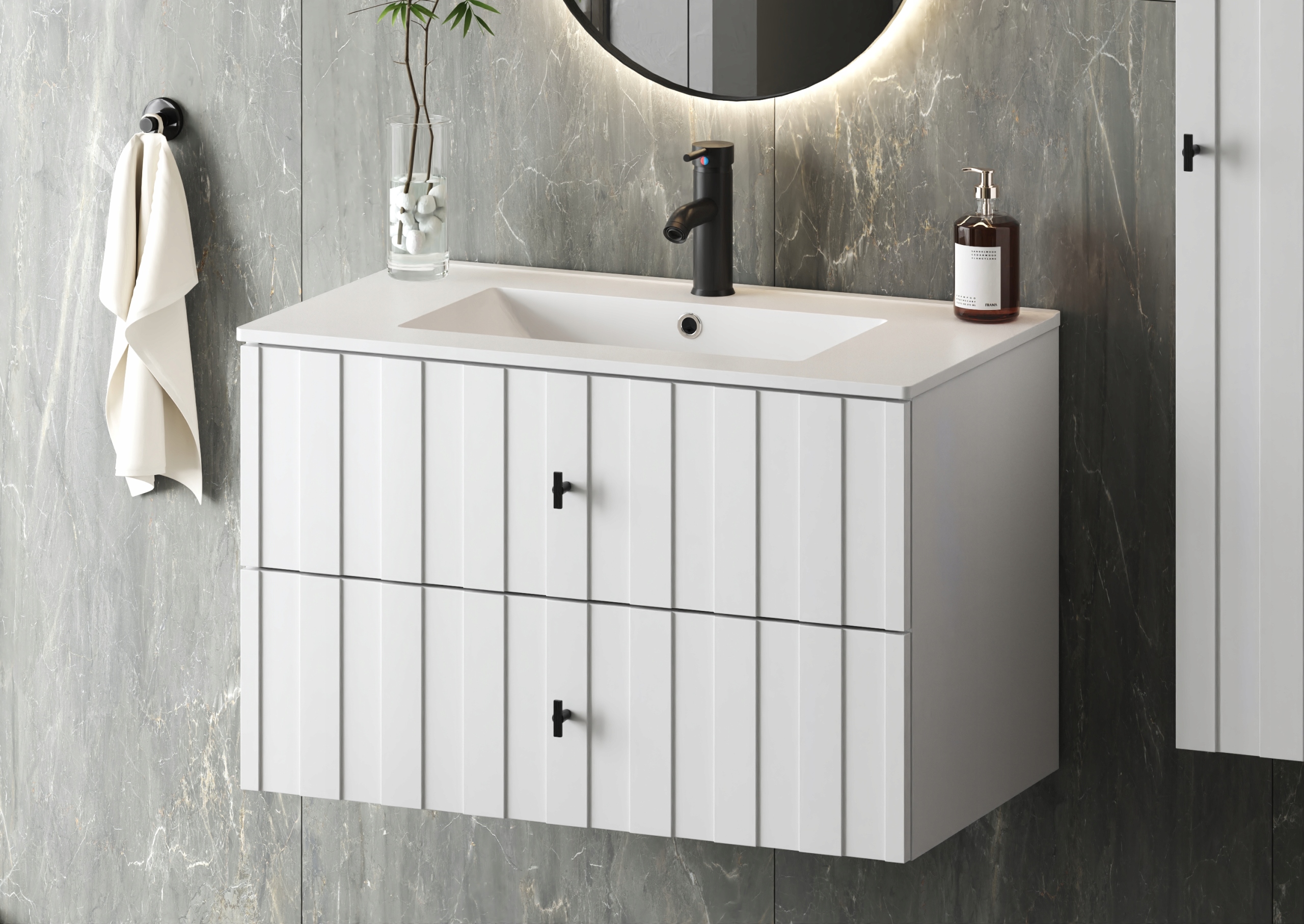 Szafka łazienkowa o szerokości 80 cm została wyposażona w dwie przestronne szuflady z prowadnicami dolnego montażu i systemem cichego domykania, co zapewnia komfortowe i bezgłośne użytkowanie. Wisząca konstrukcja nadaje bryle lekkości i sprawia, że mebel prezentuje się elegancko, a jednocześnie ułatwia sprzątanie w łazience.
