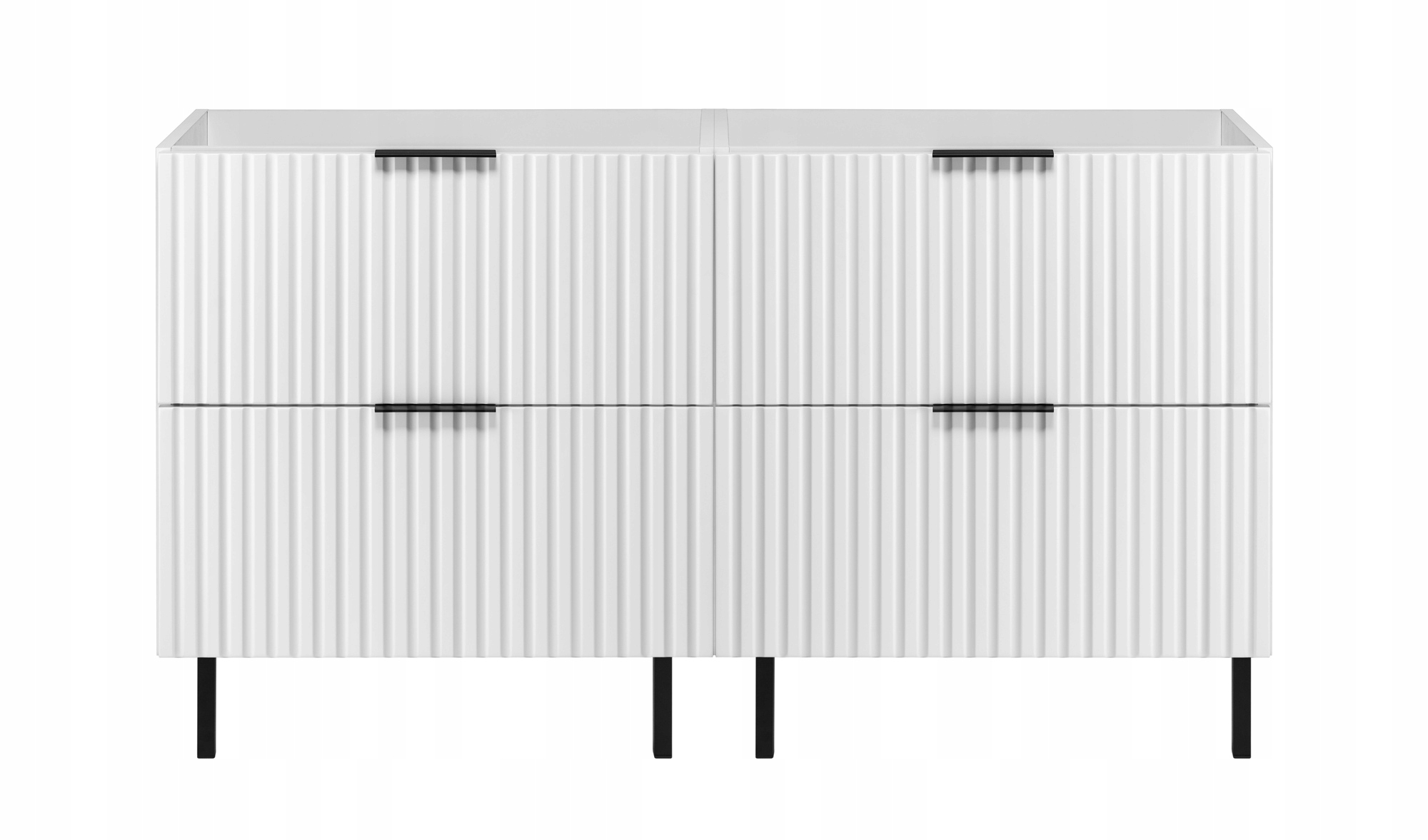 Szafka łazienkowa FLOW 120 cm w białym, matowym wykończeniu to nowoczesna propozycja do eleganckiej łazienki. Fronty z dekoracyjnym ryflowaniem nadają bryle wyrazistości, a jasna kolorystyka optycznie powiększa przestrzeń. Zestaw składa się z dwóch modułów o szerokości 60 cm, które łącznie oferują cztery pojemne szuflady z pełnym wysuwem oraz systemem cichego domyku soft close.
