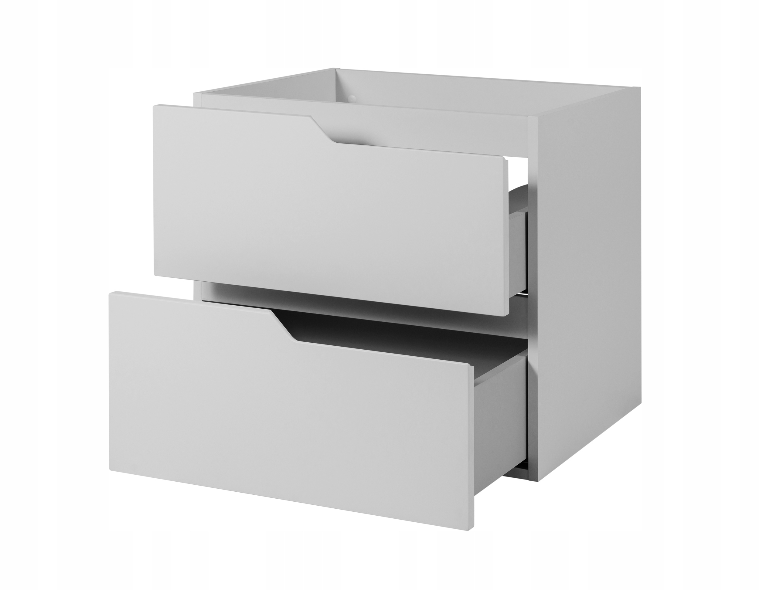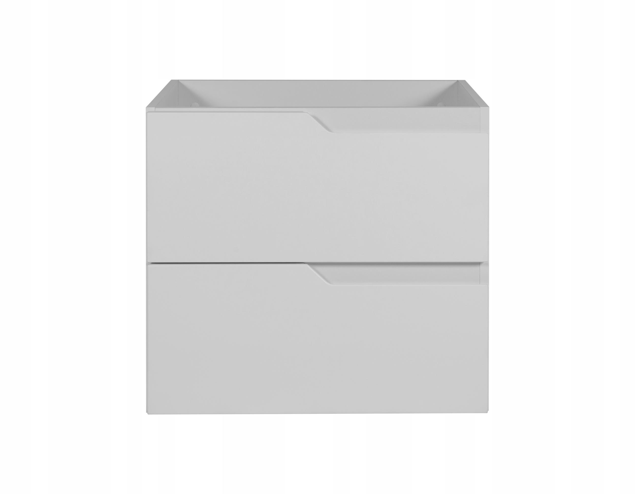 Model o szerokości 60 cm, wysokości 57 cm i głębokości 46 cm został wyposażony w dwie pojemne szuflady z systemem cichego domykania SOFT CLOSE, który gwarantuje płynne i bezgłośne użytkowanie. Frezowane uchwyty stanowią elegancki detal, który nadaje meblowi lekkości, a jednocześnie eliminuje konieczność stosowania klasycznych gałek. Szafka doskonale sprawdzi się zarówno w małych, jak i przestronnych łazienkach, zapewniając praktyczne miejsce do przechowywania.