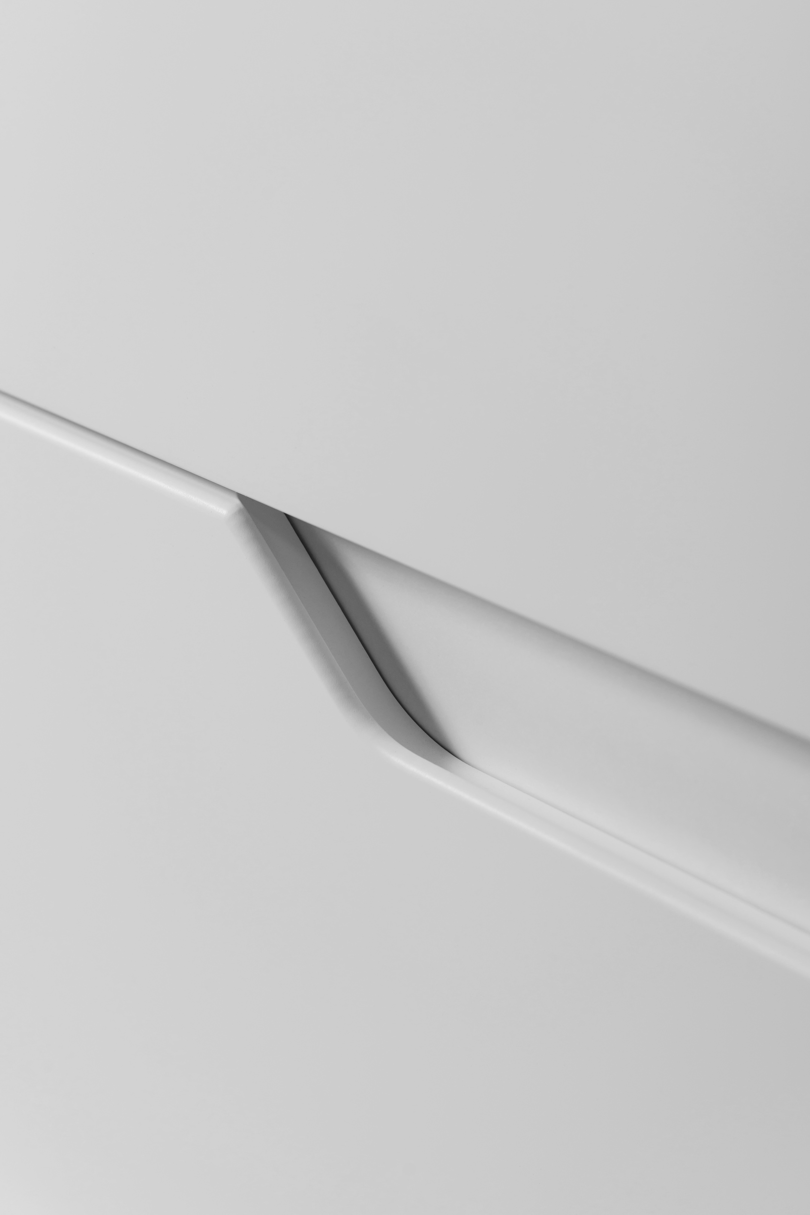 Korpus wykonano z płyty laminowanej 16 mm, a fronty z płyty MDF o tej samej grubości, pokrytej matową folią odporną na wilgoć i zarysowania. Obrzeża zabezpieczono materiałem ABS 0,5 mm, co zwiększa trwałość mebla i odporność na codzienne użytkowanie. Wnętrze szuflad w jasnym, szarym kolorze podkreśla nowoczesny, elegancki charakter kolekcji.