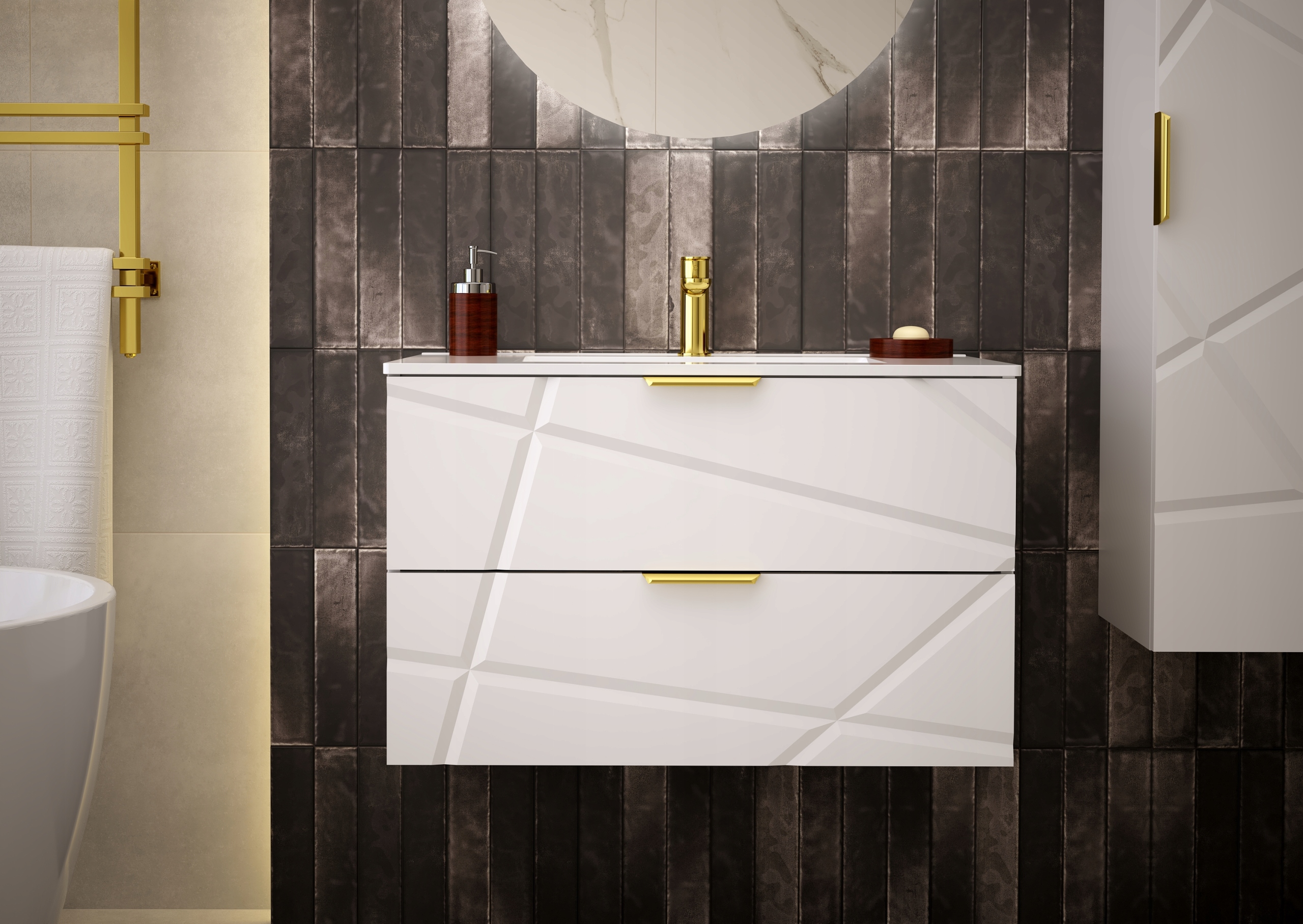 Szafka łazienkowa RADOM 80 cm to elegancki mebel, który łączy nowoczesny minimalizm z klasycznym akcentem w postaci złotego uchwytu krawędziowego. Delikatnie frezowane fronty w białym macie nadają całości subtelności i lekkości, tworząc mebel, który doskonale wkomponuje się zarówno w nowoczesne, jak i tradycyjne wnętrza łazienek.