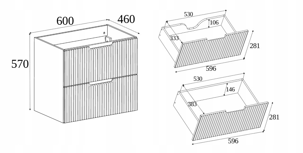 Dwie pojemne szuflady zapewniają mnóstwo miejsca na przechowywanie kosmetyków i akcesoriów, a dzięki systemowi SOFT CLOSE domykają się cicho i płynnie, zwiększając komfort użytkowania i chroniąc konstrukcję przed uszkodzeniem. Wisząca forma mebla sprawia, że całość prezentuje się lekko, a utrzymanie czystości w łazience jest znacznie łatwiejsze.