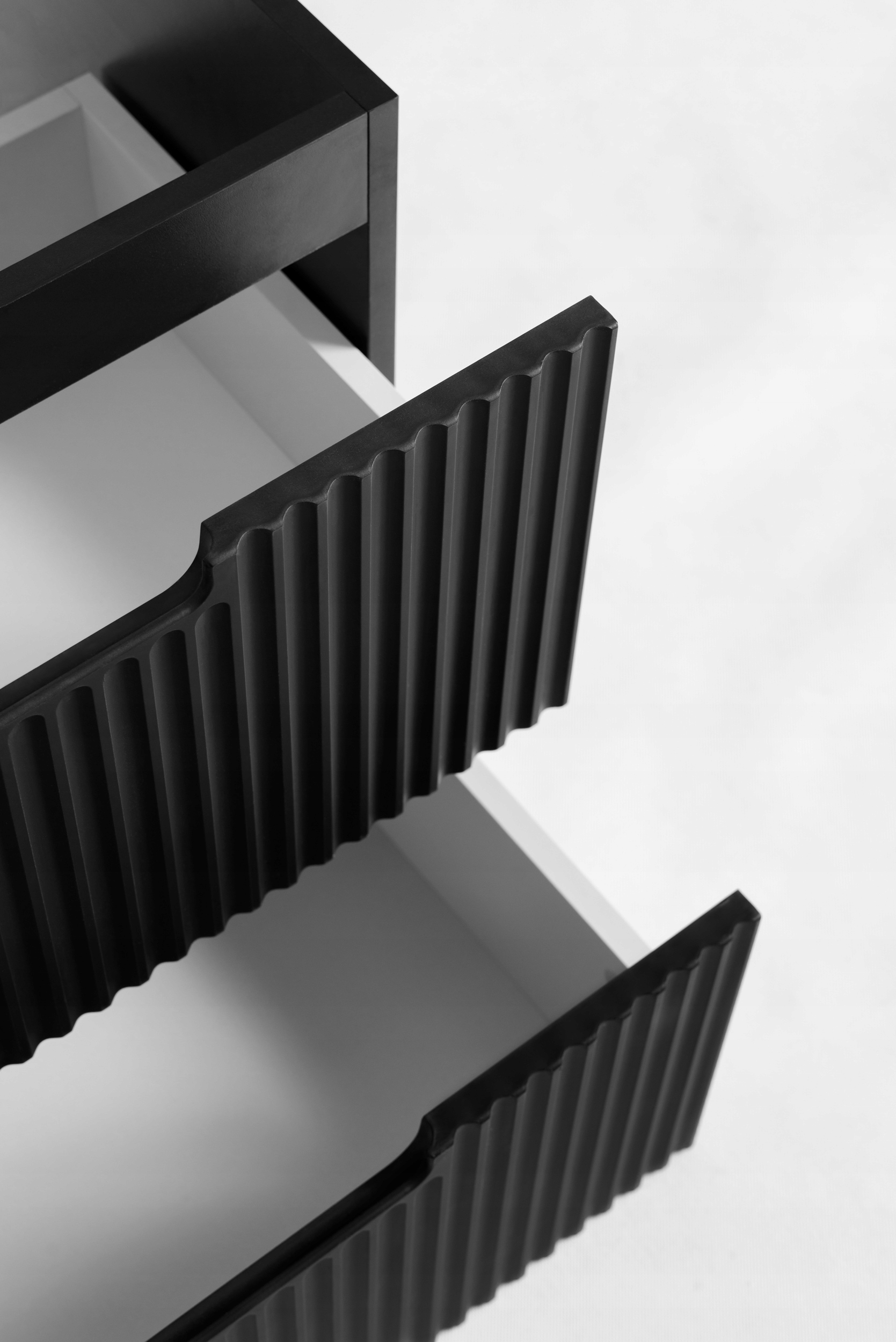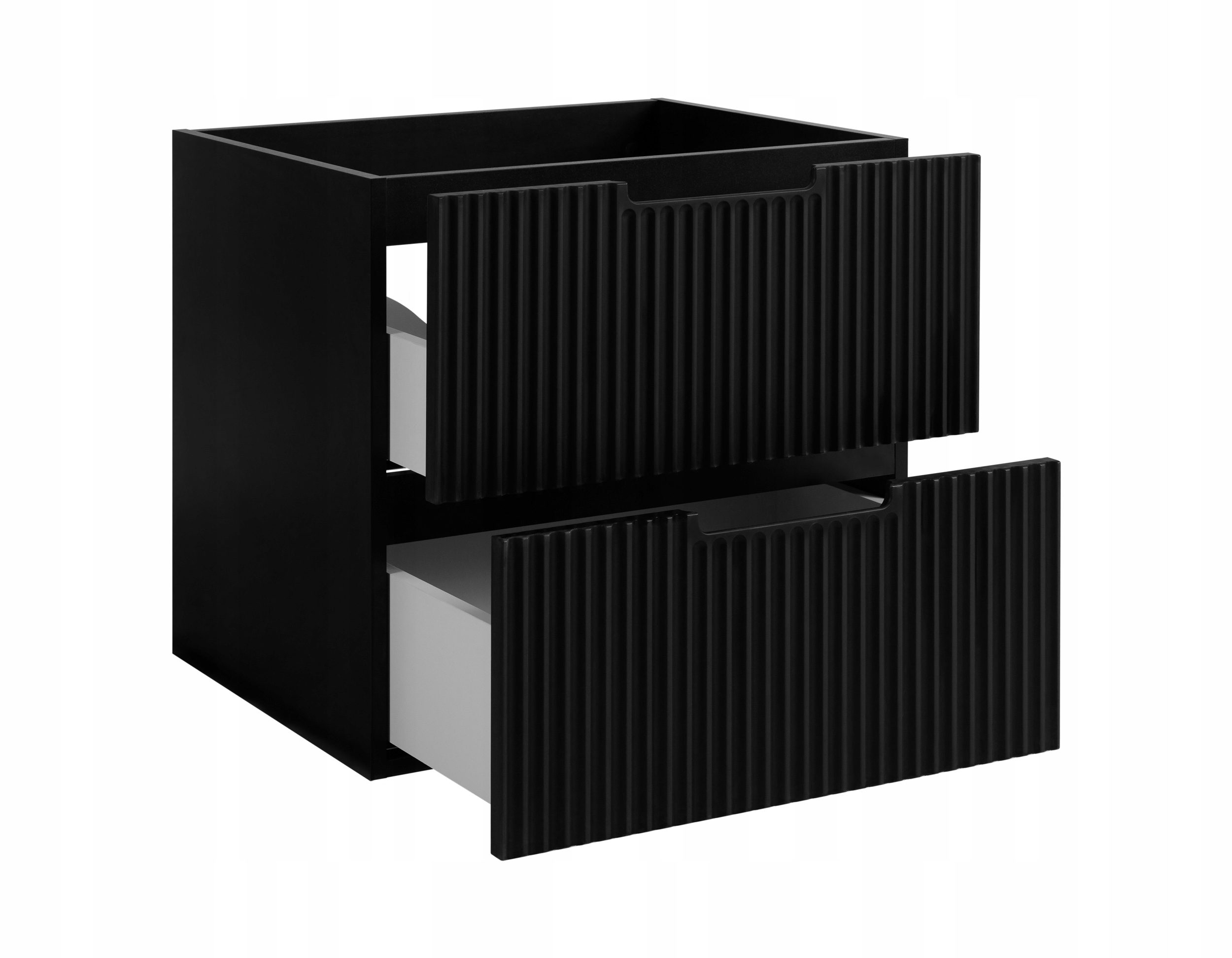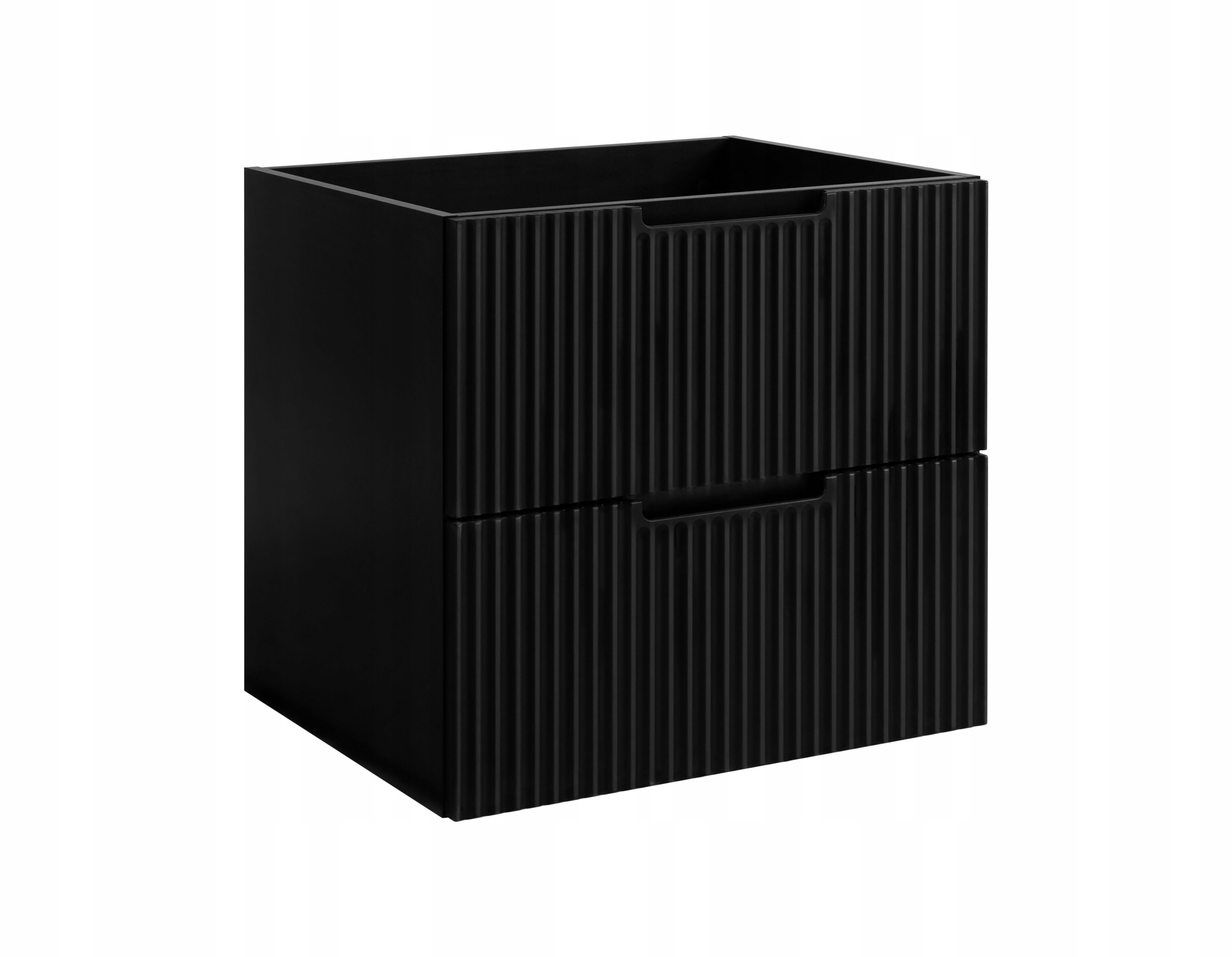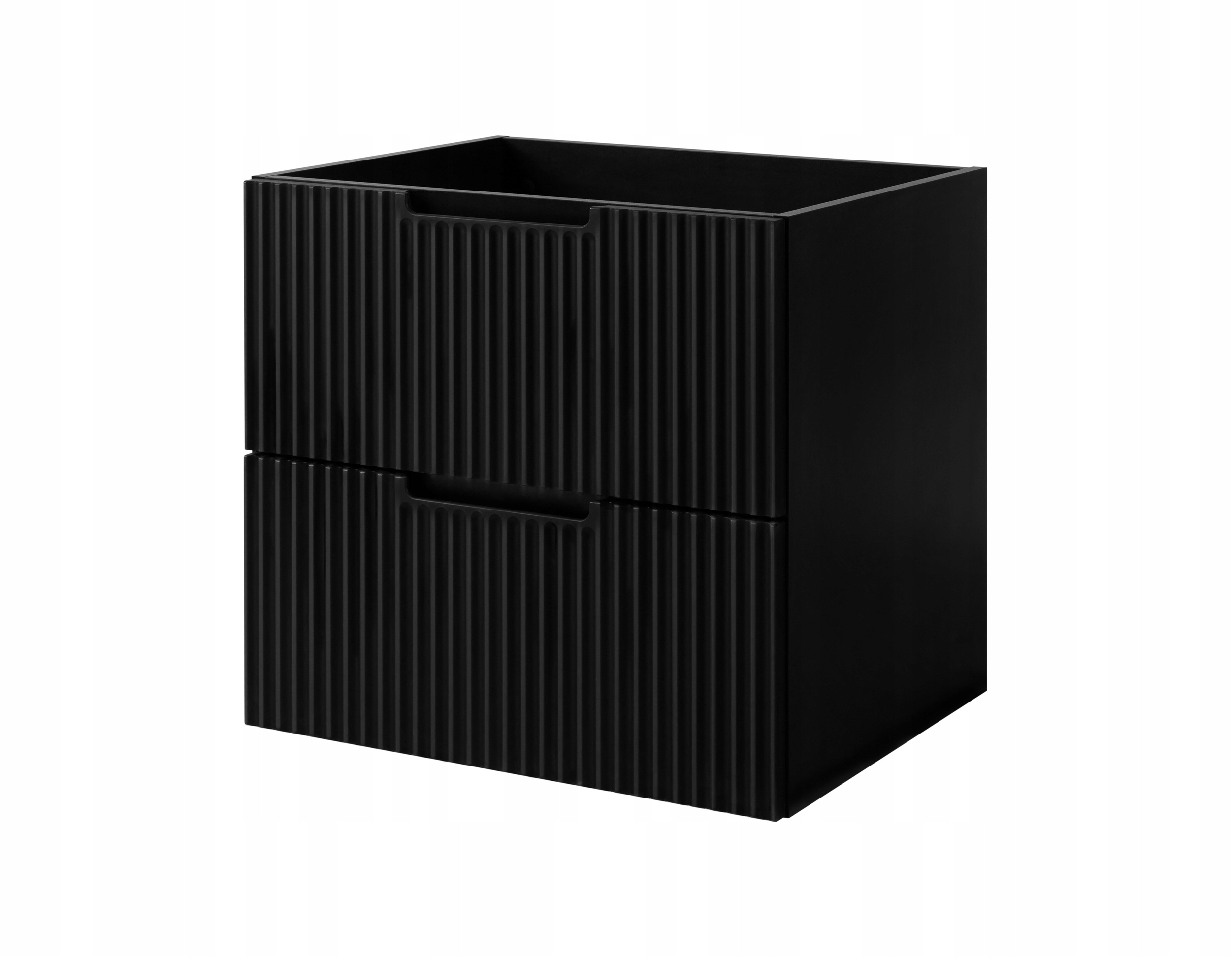 Szafka pod umywalkę z kolekcji VENA w kolorze czarnym to idealna propozycja do nowoczesnych łazienek, w których liczy się styl i funkcjonalność. Jej charakterystyczne, frezowane fronty przyciągają wzrok eleganckim wzorem i nadają wnętrzu wyrazistości. Zintegrowany frezowany uchwyt podkreśla minimalistyczny charakter mebla i umożliwia wygodne otwieranie bez konieczności stosowania klasycznych okuć.