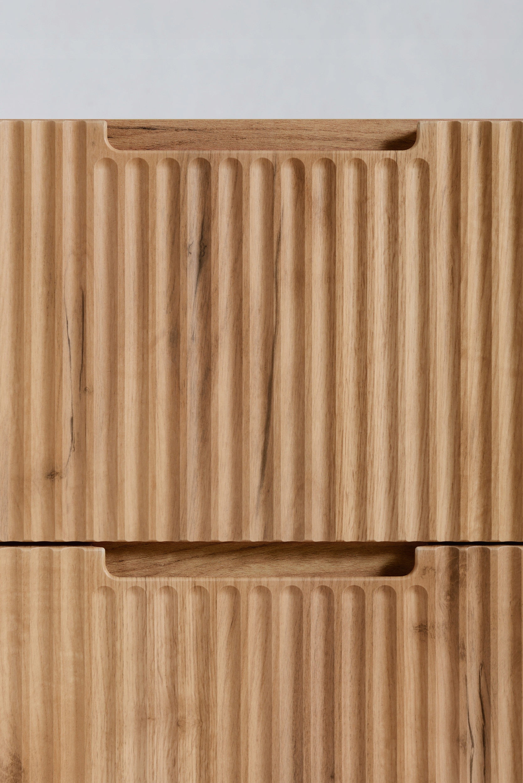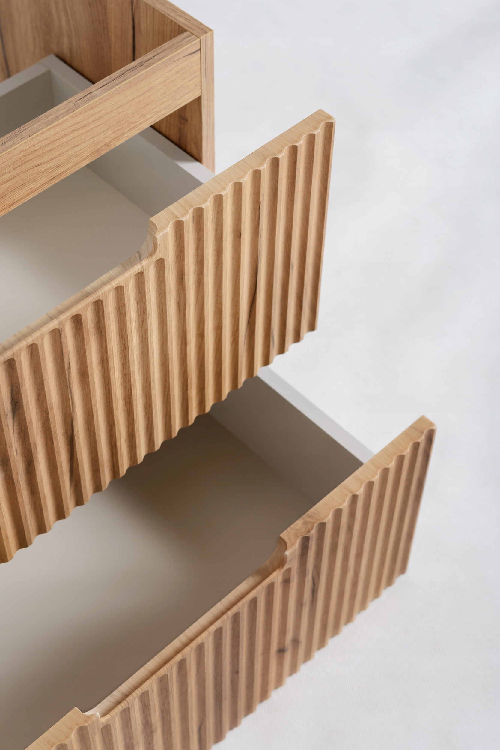 Wewnątrz znajdują się dwie pojemne szuflady, które pomieszczą wszystkie niezbędne kosmetyki i akcesoria. Prowadnice z funkcją SOFT CLOSE zapewniają ciche i płynne domykanie, zwiększając komfort codziennego korzystania z mebla. Dzięki wiszącej konstrukcji, szafka prezentuje się lekko, a utrzymanie porządku w łazience staje się znacznie łatwiejsze.